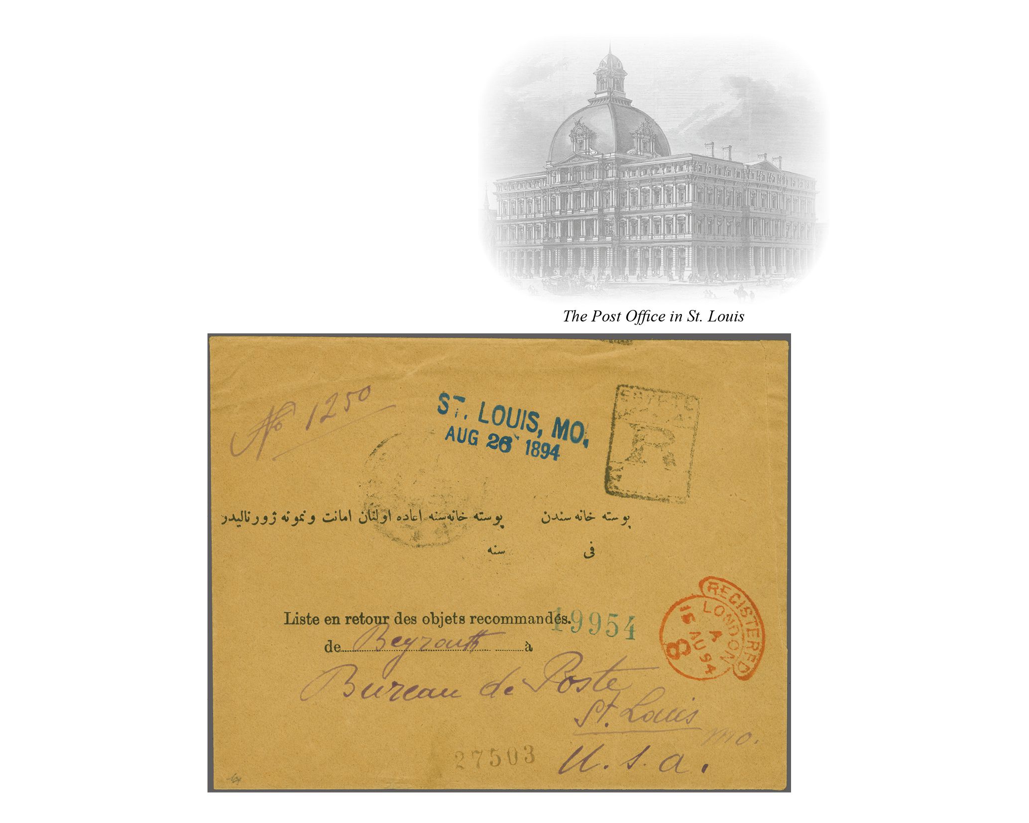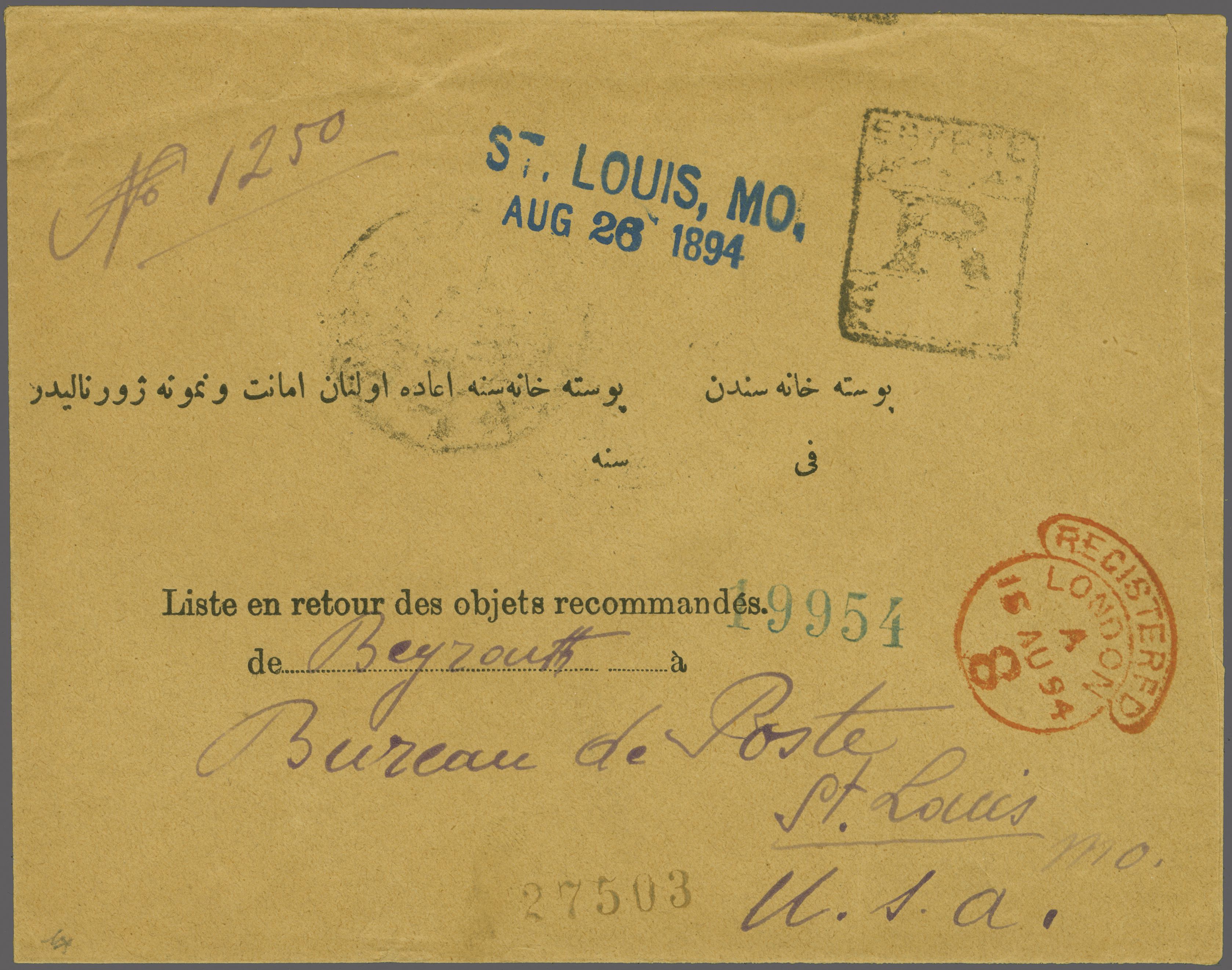 Beirut Registration 1894: Preprinted bilingual (Turkish & French) envelope for the Return of Acknowledgement of Receipt / Registration Forms to the St. Louis, USA Post Office, struck with weak BEYROUTH cds in black,