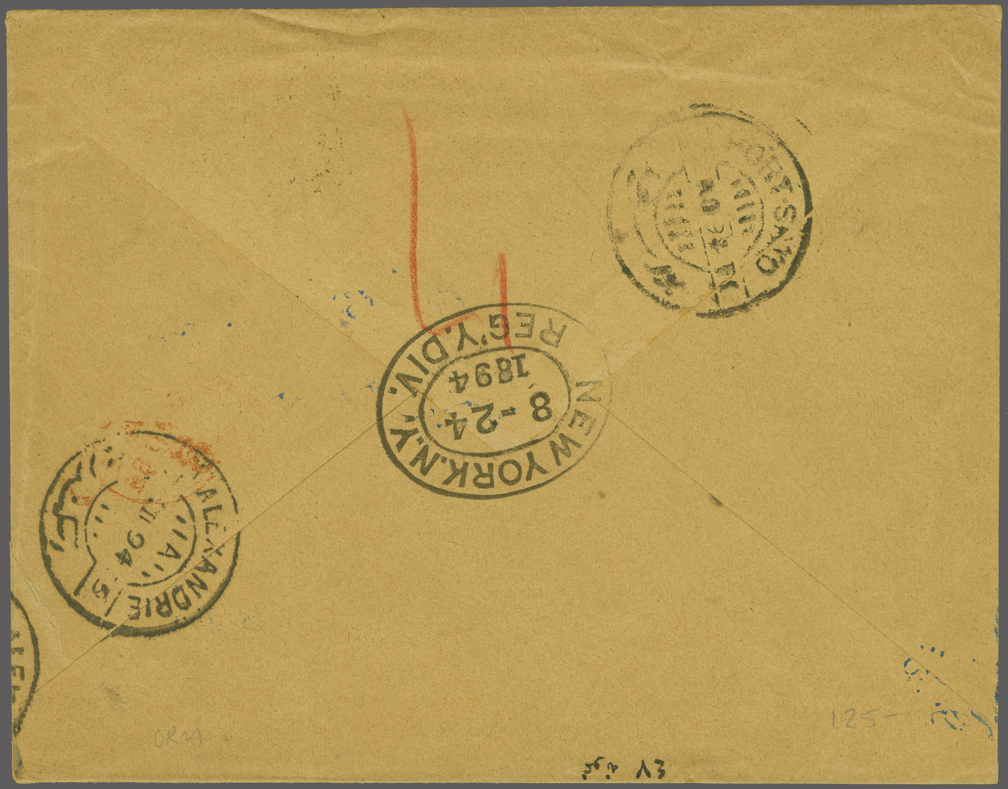 "Registered / London" transit in red (Aug 15) and two line "ST. LOUIS, MO / AUG 26, 1894" arrival in blue on obverse; reverse with Port Said cds, Alexandria cds and New York transits. An extremely rare usage - believed to be the sole example from any