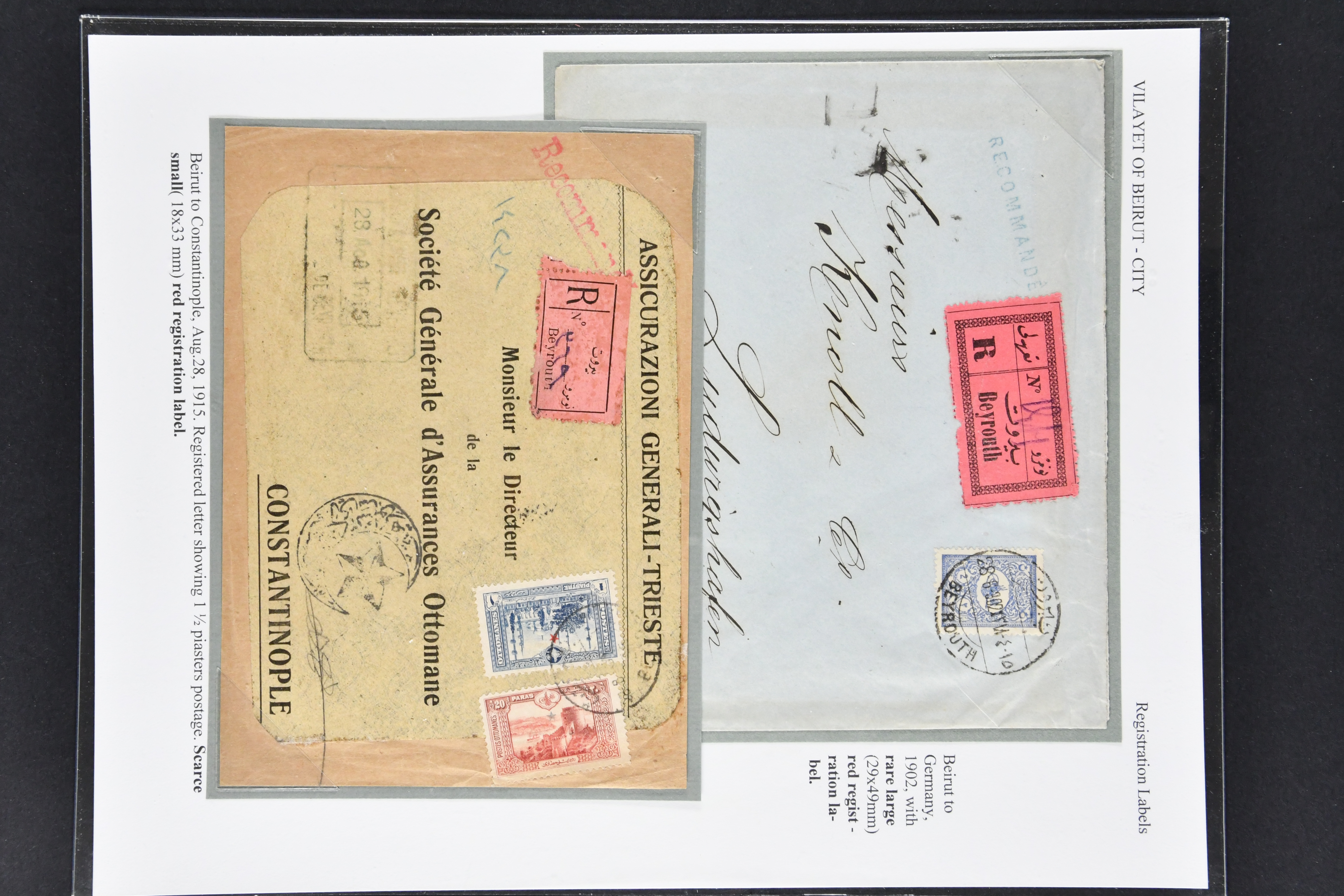 registration label at left; and 1915 censored registered cover front to Constantinople bearing 1914 20 pa. red and 1 pi. blue showing the small format (33 x 18 mm.) registration label in pink. Seldom seen, a scarce pair. Provenance: Small label: