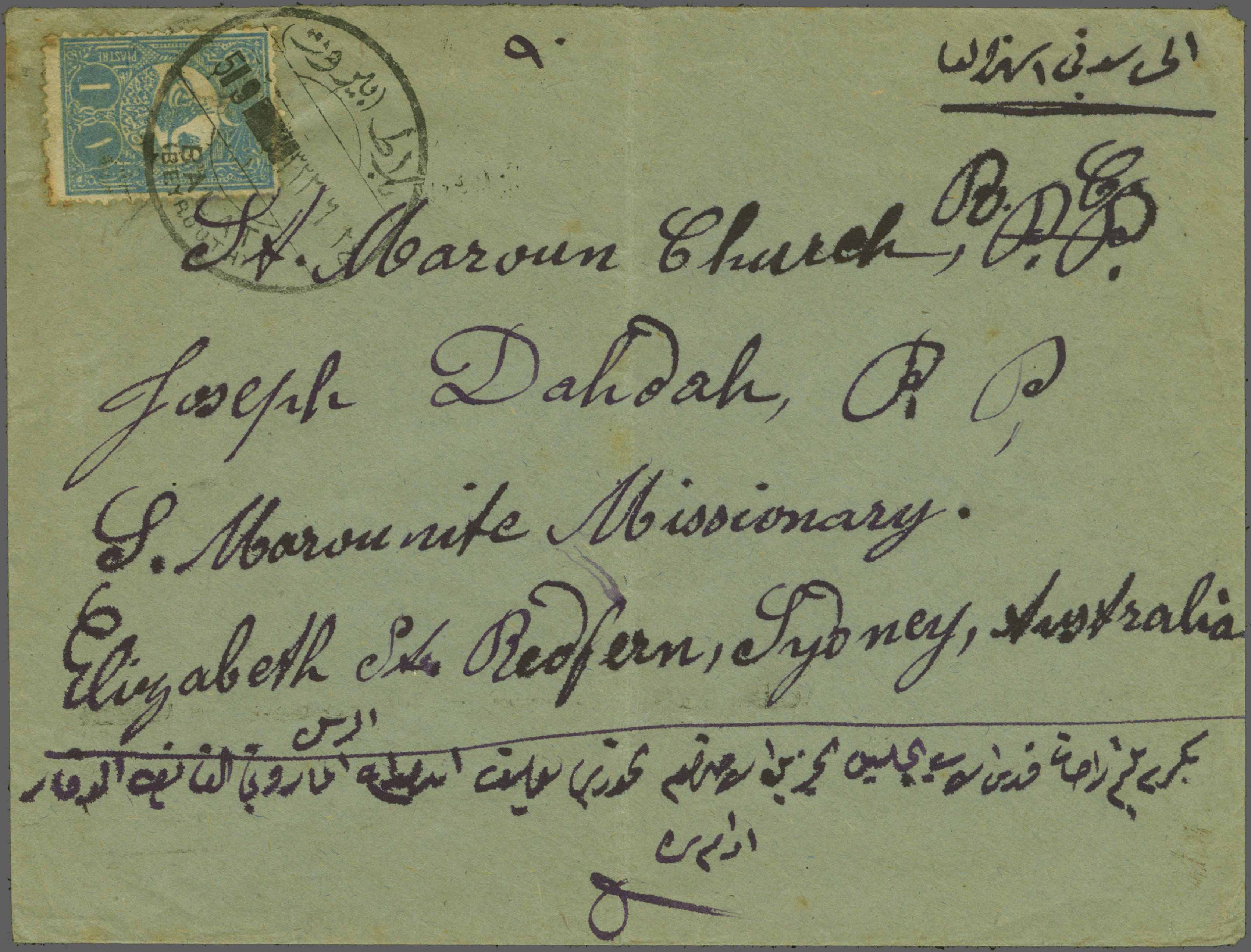 Beirut / Balat Office 1908: Turkey 1 pi. blue, a used example on 1909 cover from Balat, Beirut to Redfern, Sydney, Australia (addressed to a Maronite Missionary) tied by fine strike of "BALAT / (BEYROUTH)" circular datestamp