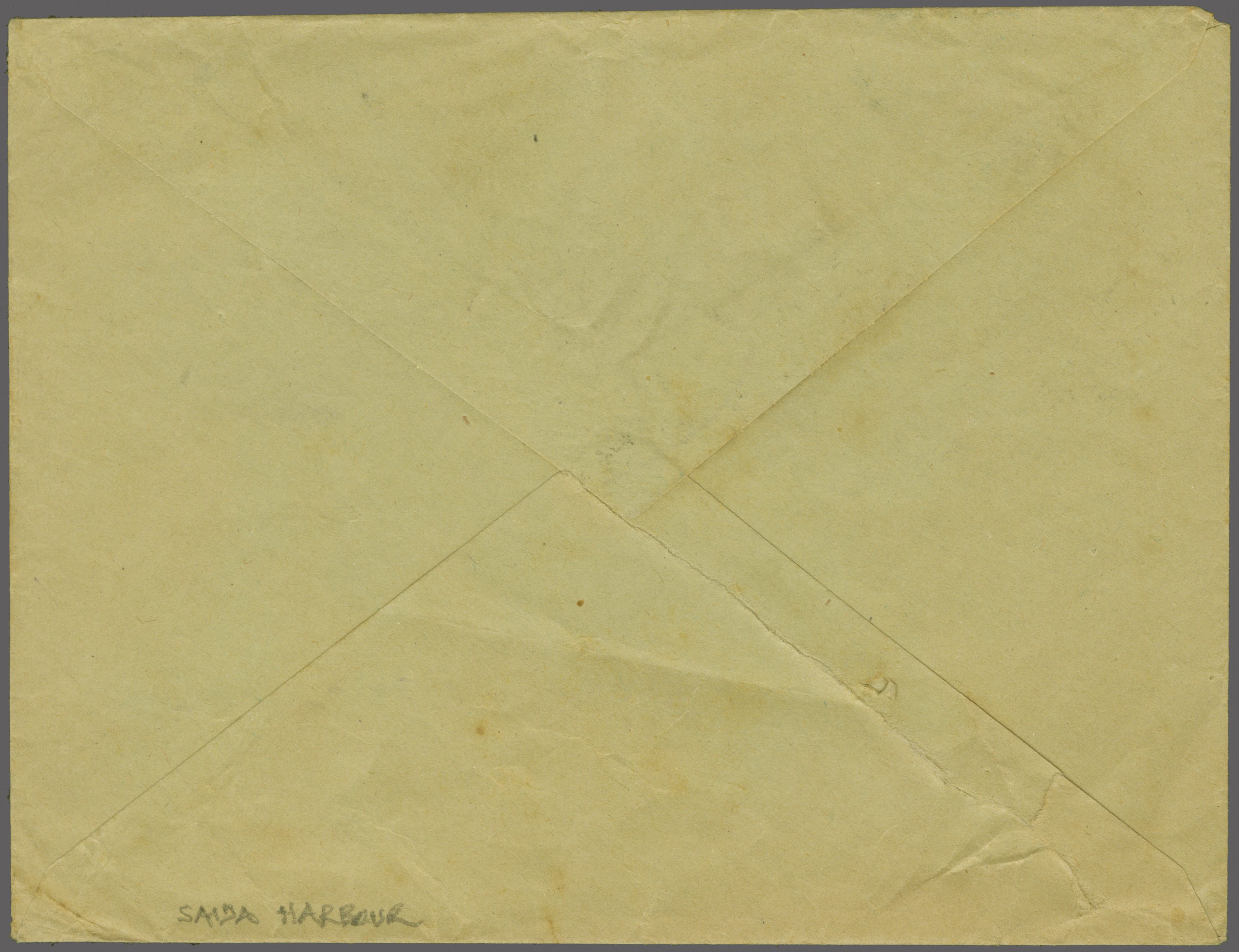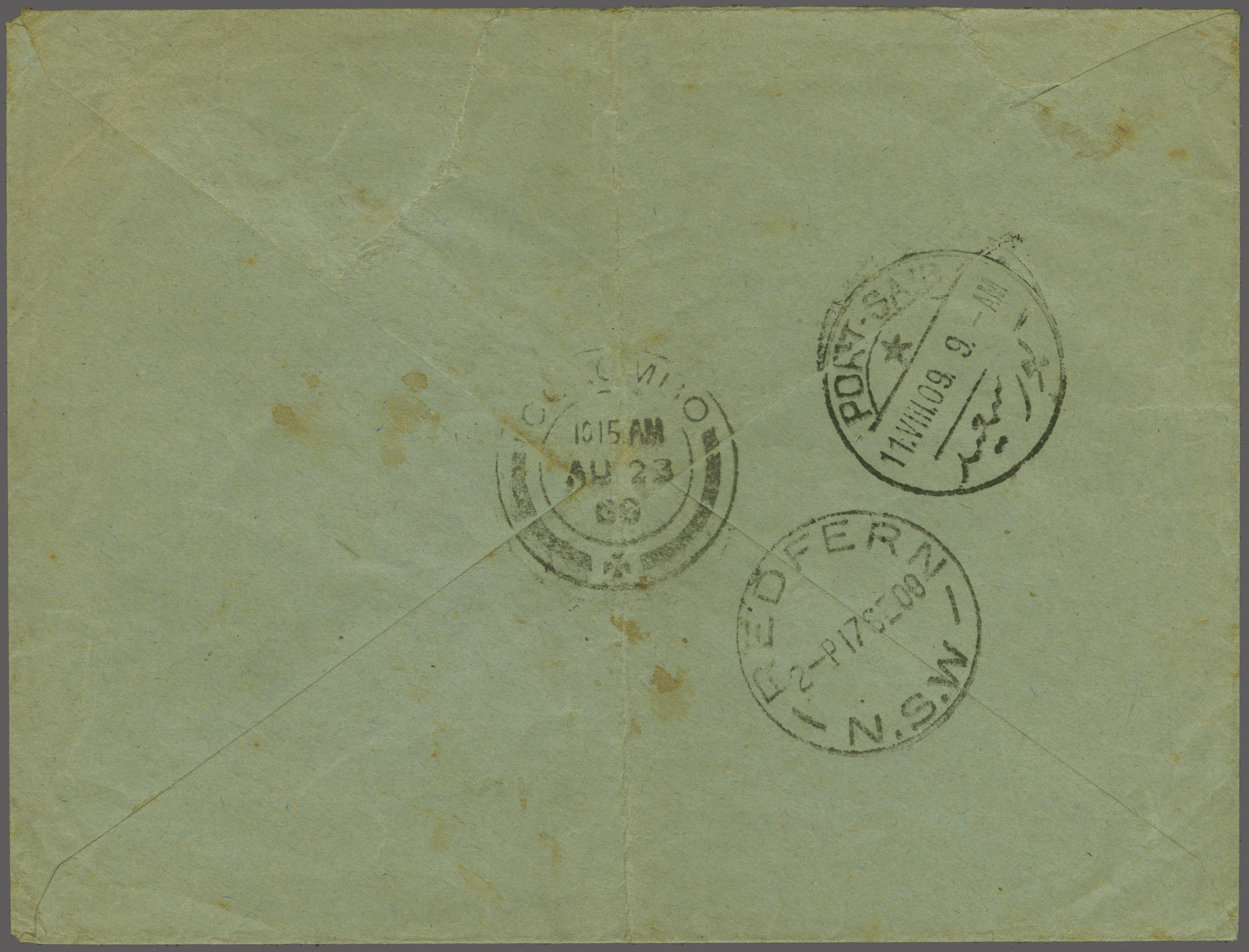 (Aug) in black (Ziya 1 - rated 'RRR'). Port Said cds (Aug 11), Colombo transit cds (Aug 23) and Redfern arrival (Sept 17) on reverse. Some ageing and file fold away from the adhesive, but a very rare cover - just two examples of this cancellation are
