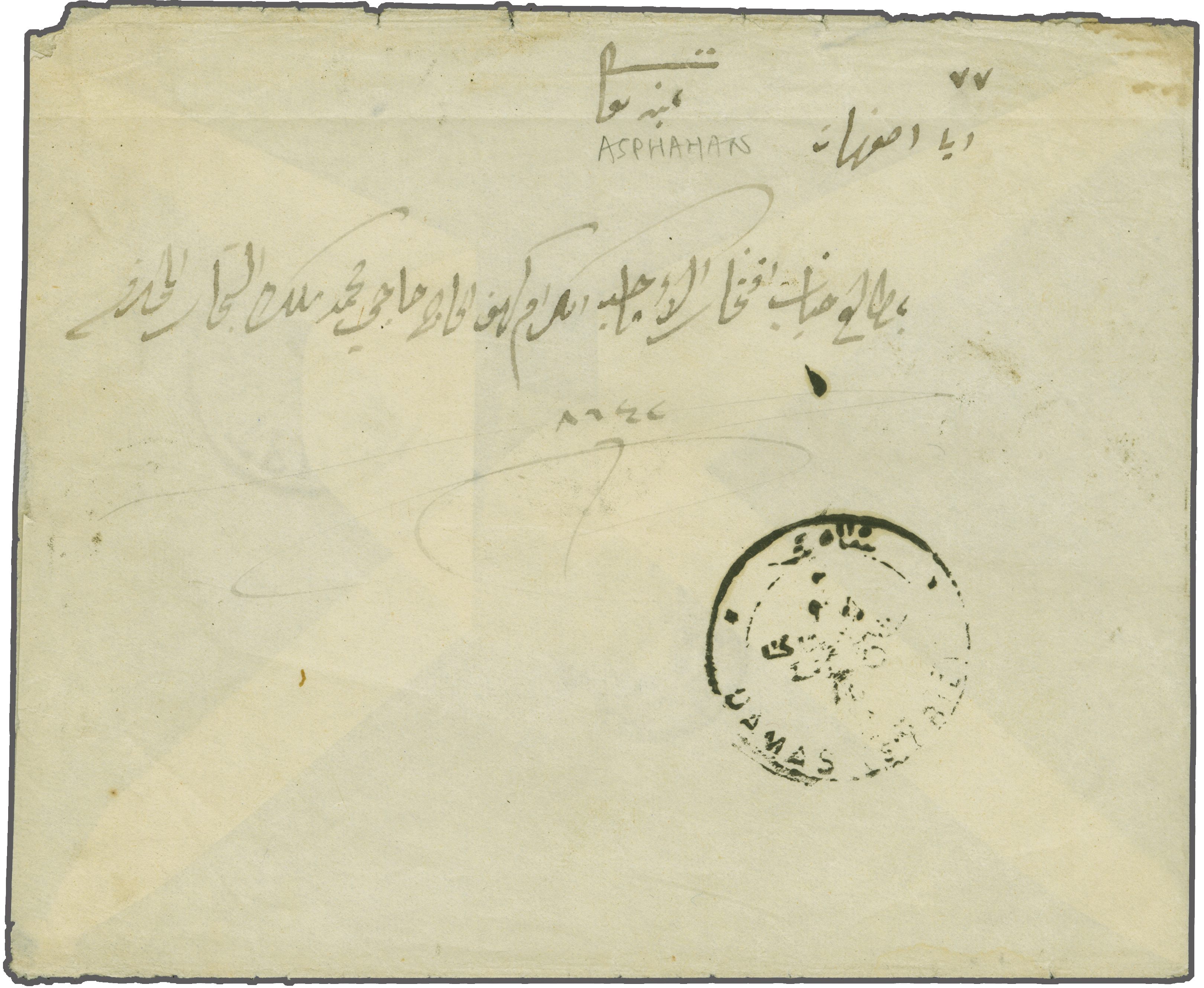 / 1307" negative seal handstamp in black (Coles & Walker fig. 30, Ziya fig. 1 - rated 'RRR'). Obverse with "Damas-Syrie" transit cds in black (Dec 10) and Teheran transit cds (Jan). A wonderful strike and a very scarce cover. Note: Illustrated in