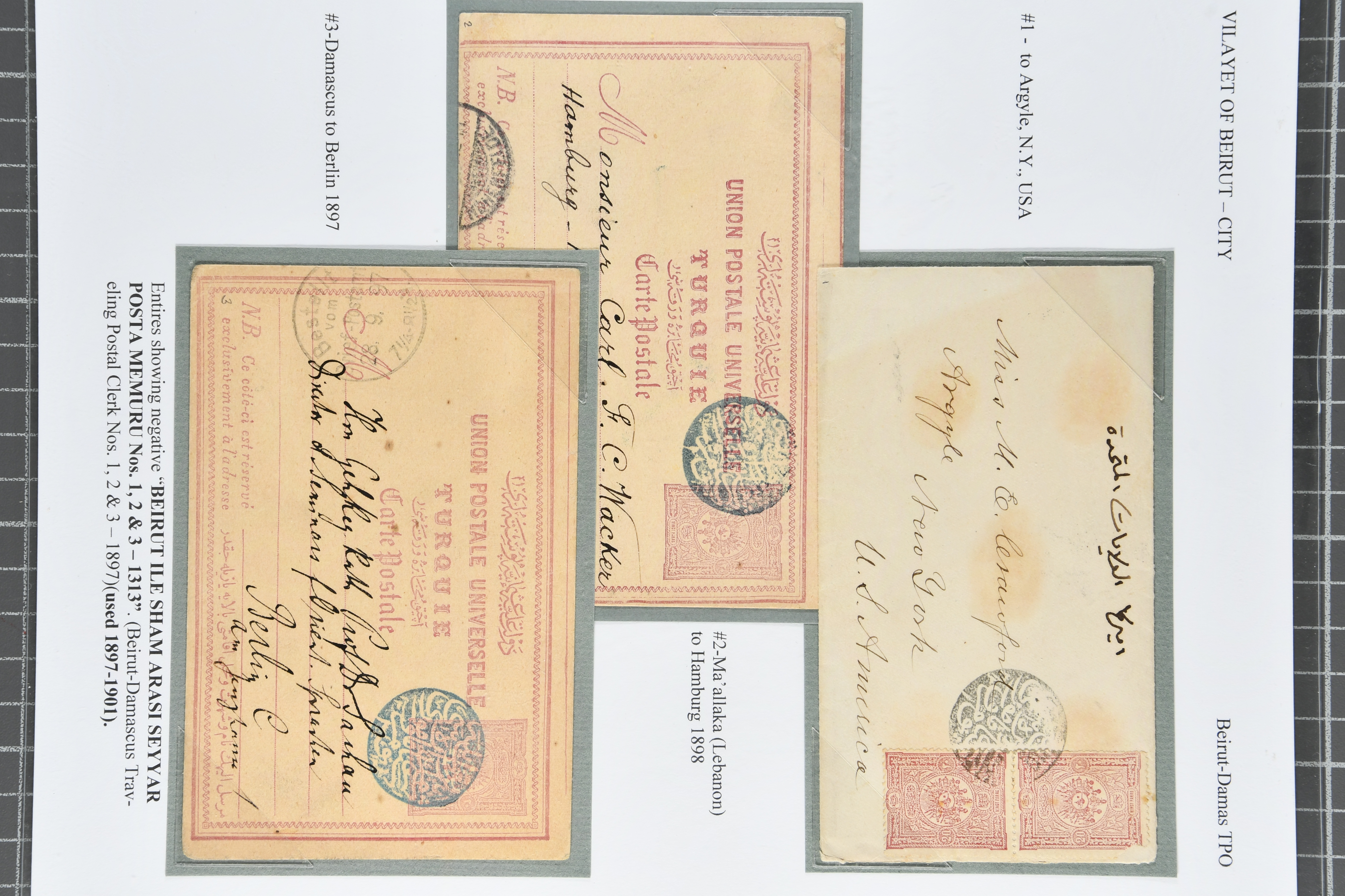 Beirut to Damascus T.P.O. 1892: Turkey 20 pa. claret vertical pair on cover to Argyle, New York USA, 1892 20 pa. postal stationery cards (2) , both to Germany, each item cancelled by strikes of Beirut-Damascus TPO