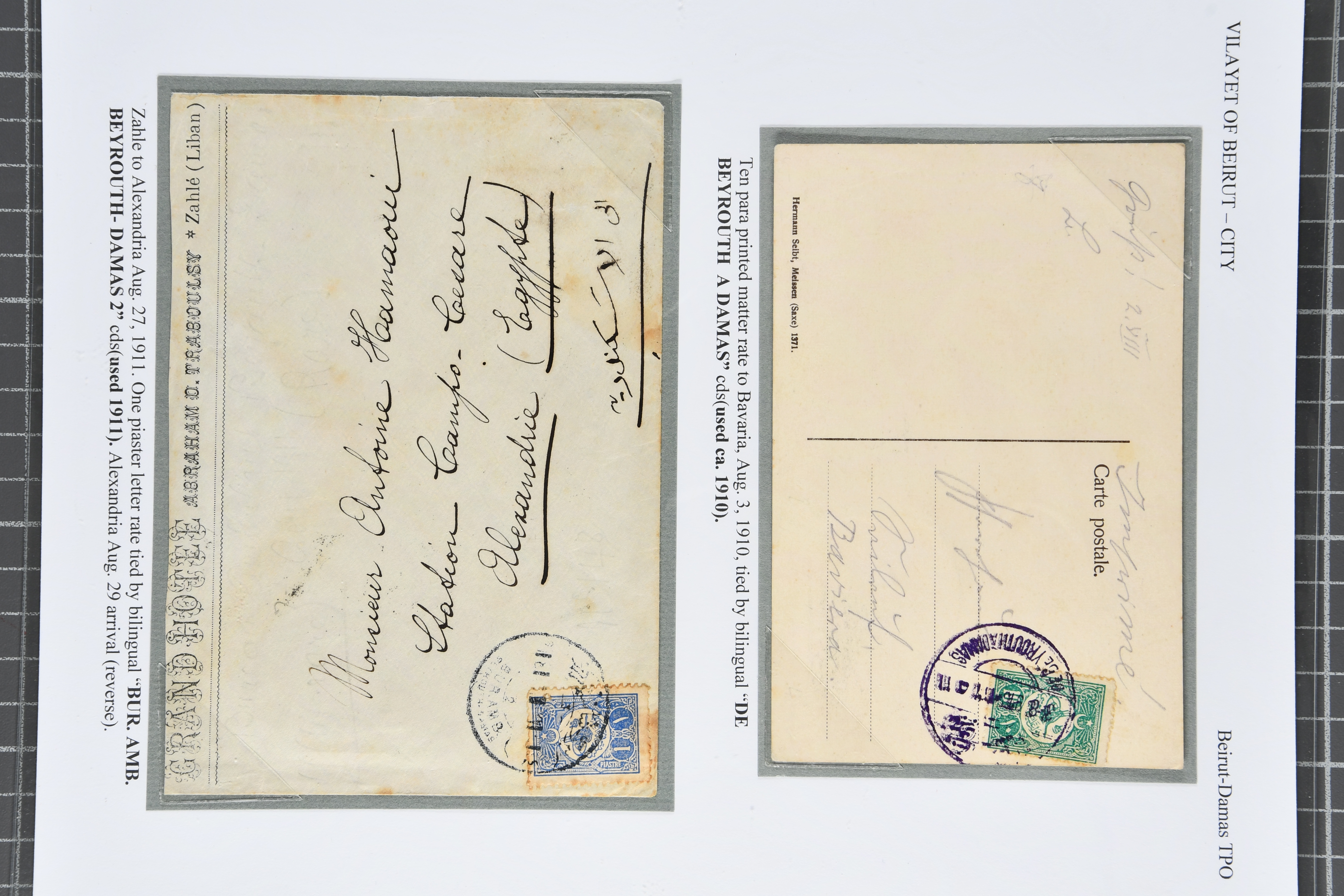 Beirut to Damascus T.P.O. 1909: Turkey 10 pa. green on postcard tied by "DE BEYROUTH À DAMAS" bilingual cds (Aug 3, 1910) in violet (Ziya fig. 506 - rated 'RR') and 1909 1 pi. blue, toned, used on 1911 cover to