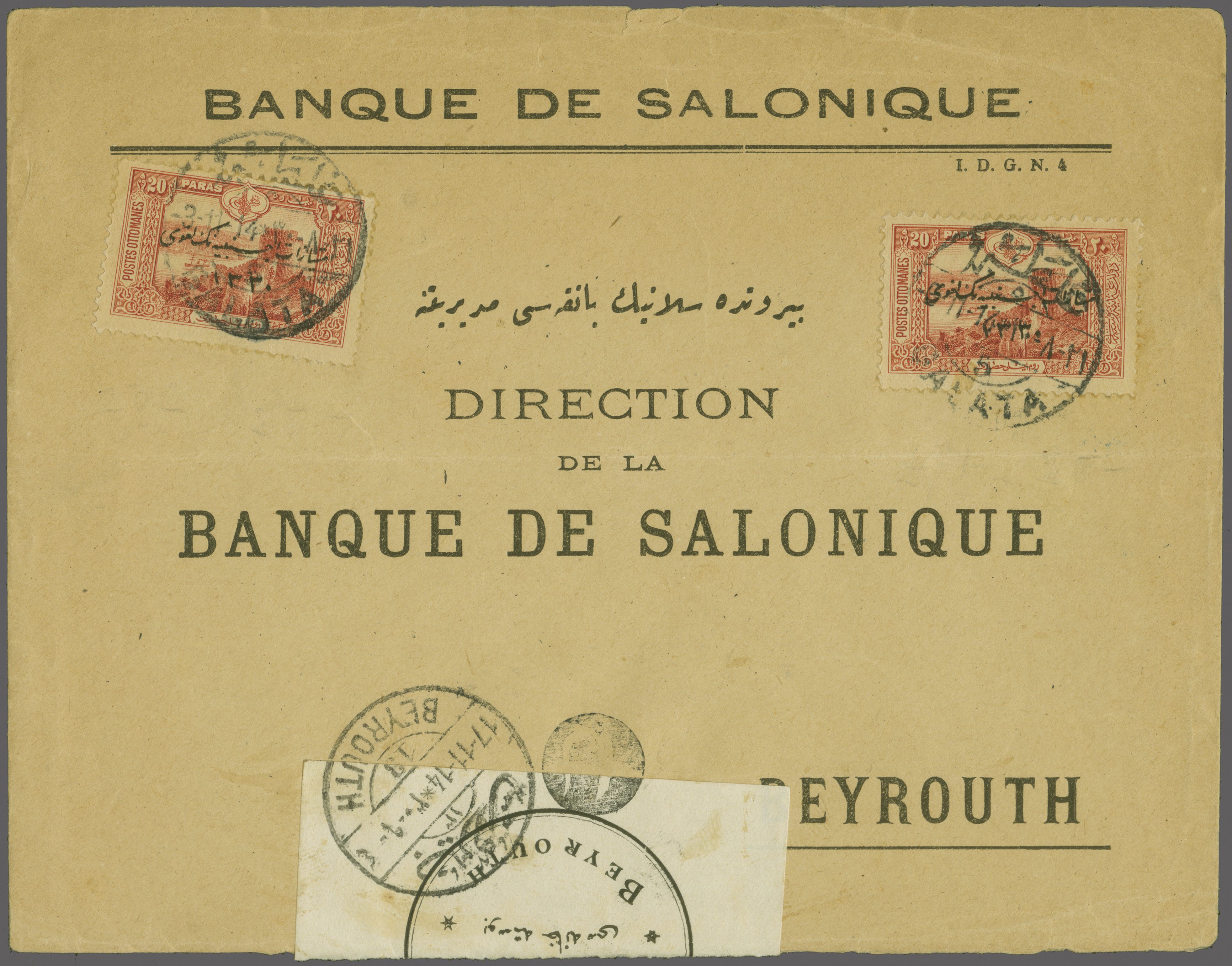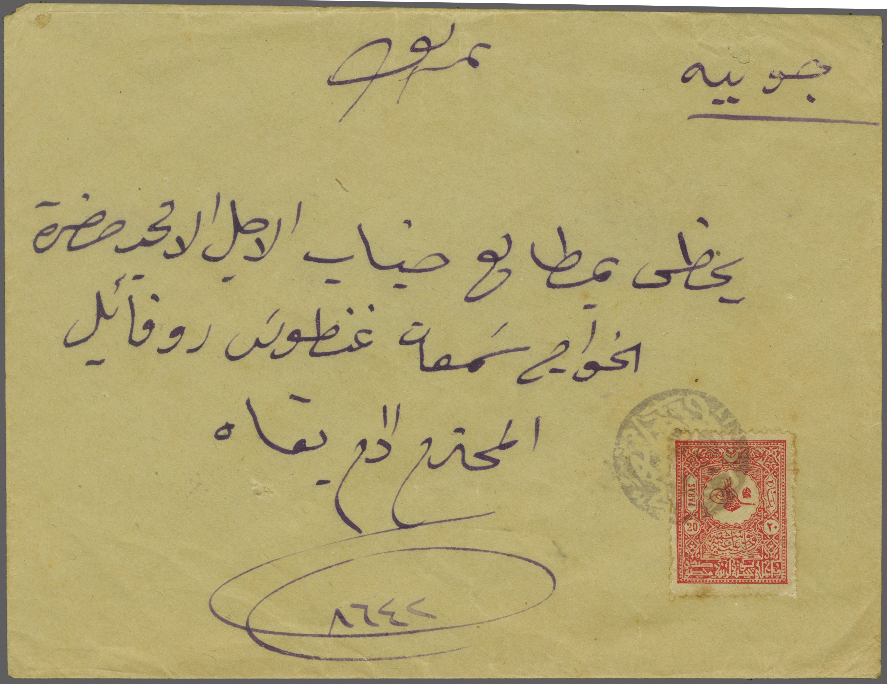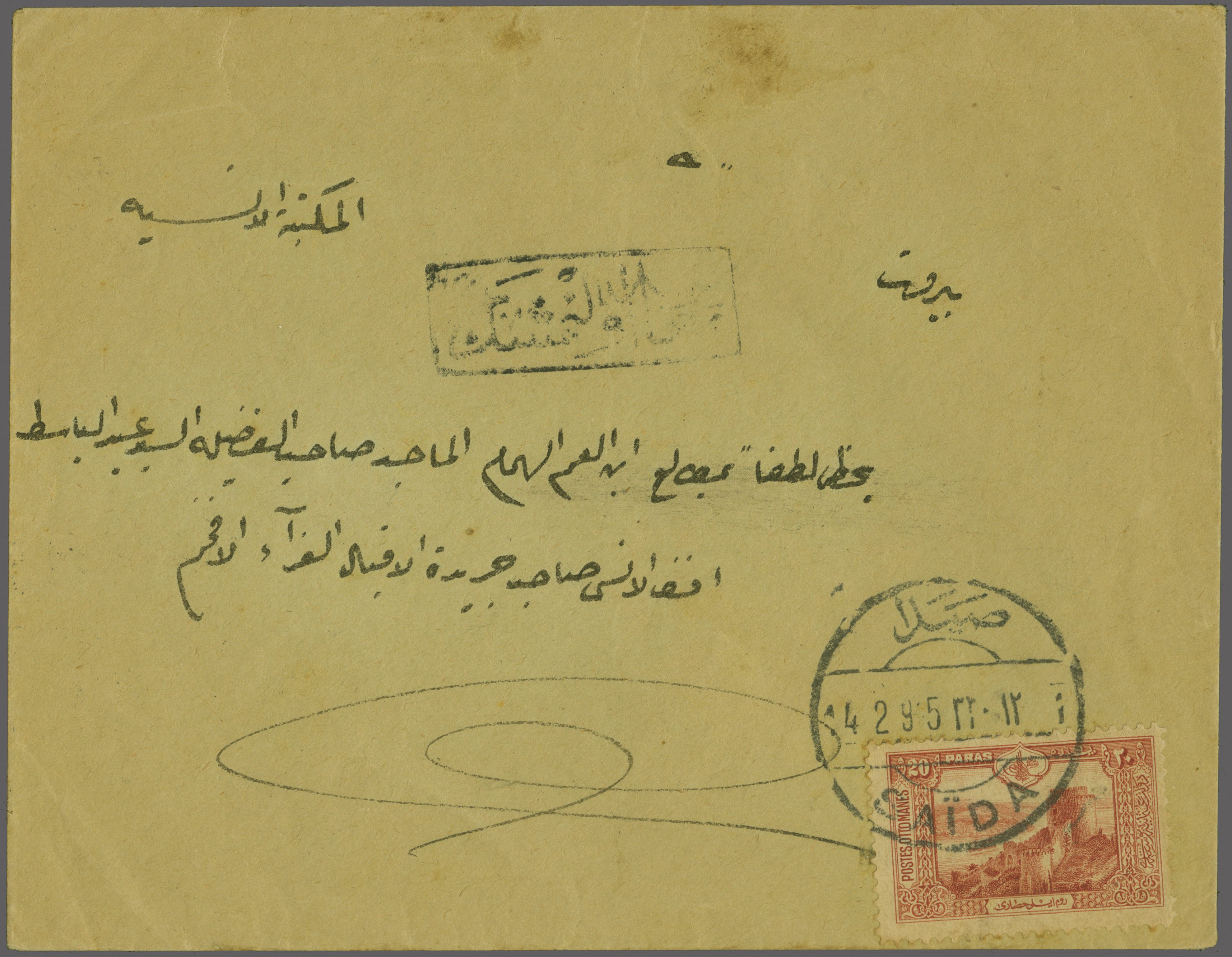 Vilayet of Beirut - Säida / Sidon 1914: Turkey 20 pa. rose, a single example used on 1915 cover at littoral / port to port rate from Saida to Beirut tied by bold strike of bilingual "SAIDA" circular datestamp (Feb 14) in black