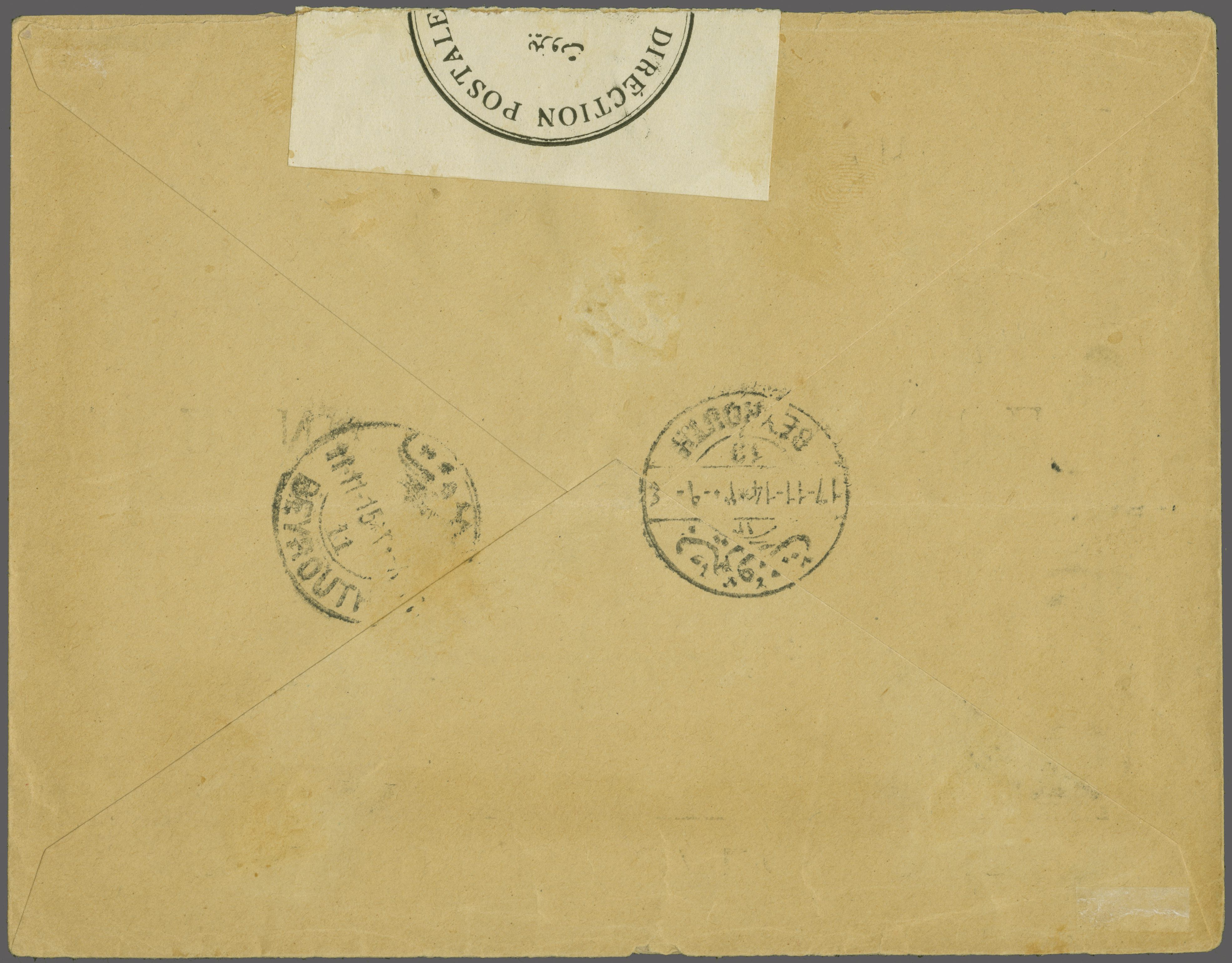 black (Coles & Walker fig. 46. Ziya fig. 2 - rated 'RR'). Flap partly missing on reverse but showing "Beyrouth / 11" arrival cds (July 24) A superb strike on one of the only two covers recorded. Note: Illustrated in the Ziya catalogue 'A' on page