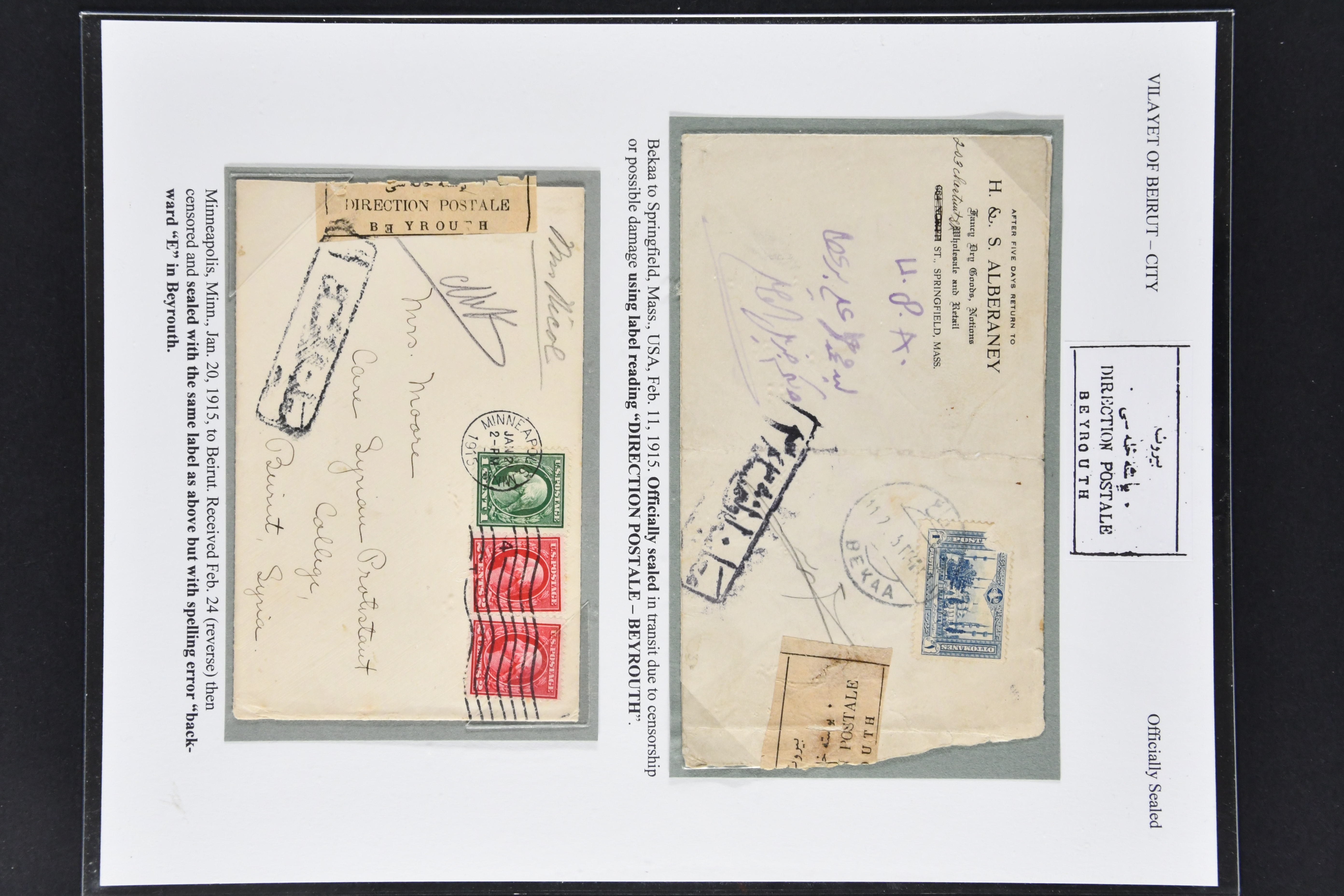 POSTALE / BEYROUTH" Reseal Censor and framed Censor cachet in black; second 20 Jan 1915 cover from Minneapolic, USA at 5 c. rate also Censored and resealed with the same label but with reversed "Ǝ" in BƎYROUTH, this tied by framed Censor cachet in