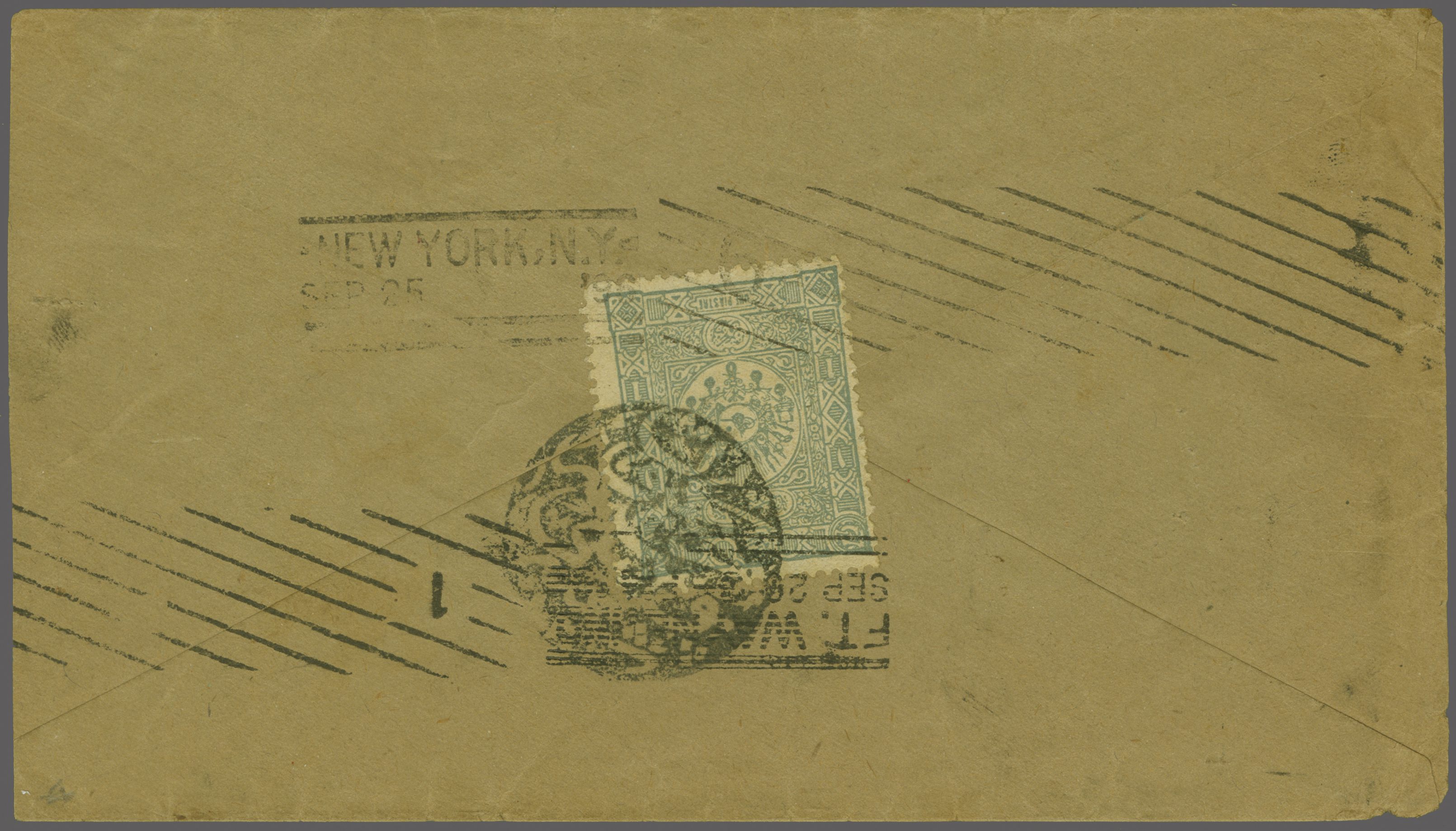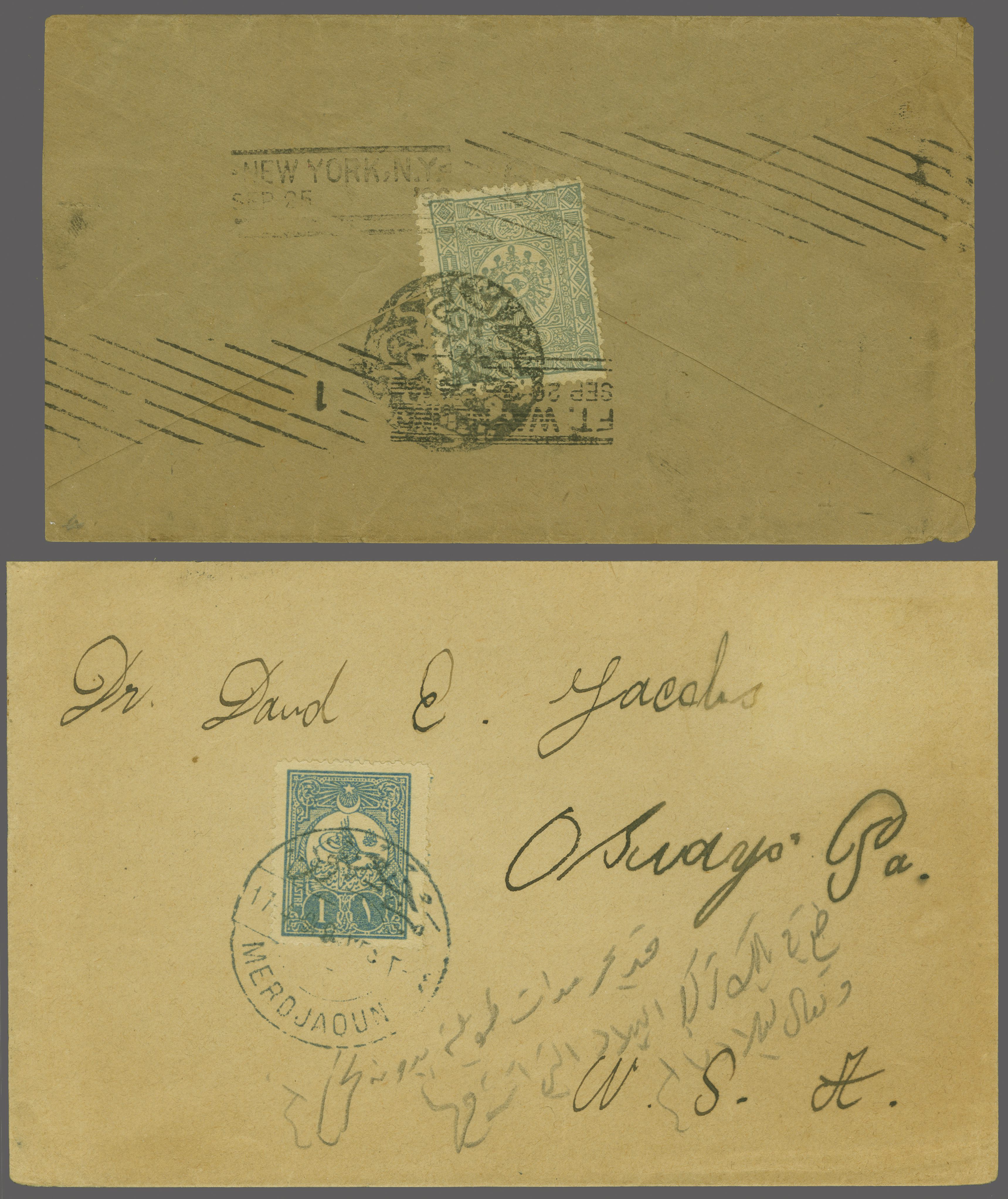 (Merdjaoun Postal Branch) in black (Coles & Walker listed by not illustrated, Ziya fig. 1 - rated 'RRR') with New York transit (Sept 25) and Fort Wayne arrival (Sept 28); and cover to USA with 1908 1 pi. blue used on cover to Oswayo, Pa., USA