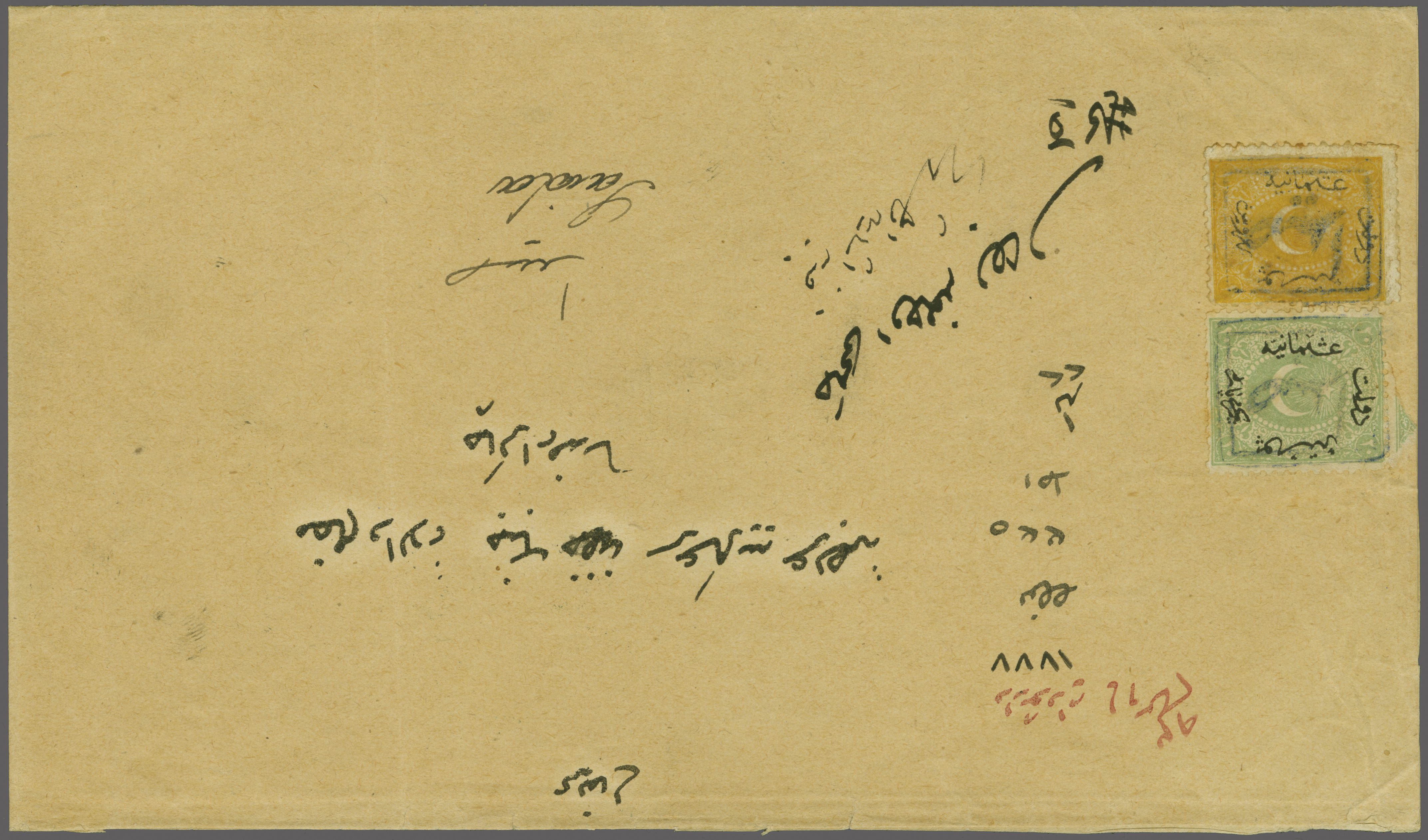 Vilayet of Beirut - Säida / Sidon 1868/71: Turkey 20 pa. green and 1 pi. yellow, used on 1876 cover to Constantinople, each cancelled by double boxed all arabic handstamp in watery blue ink (Coles & Walker fig. 112, Ziya