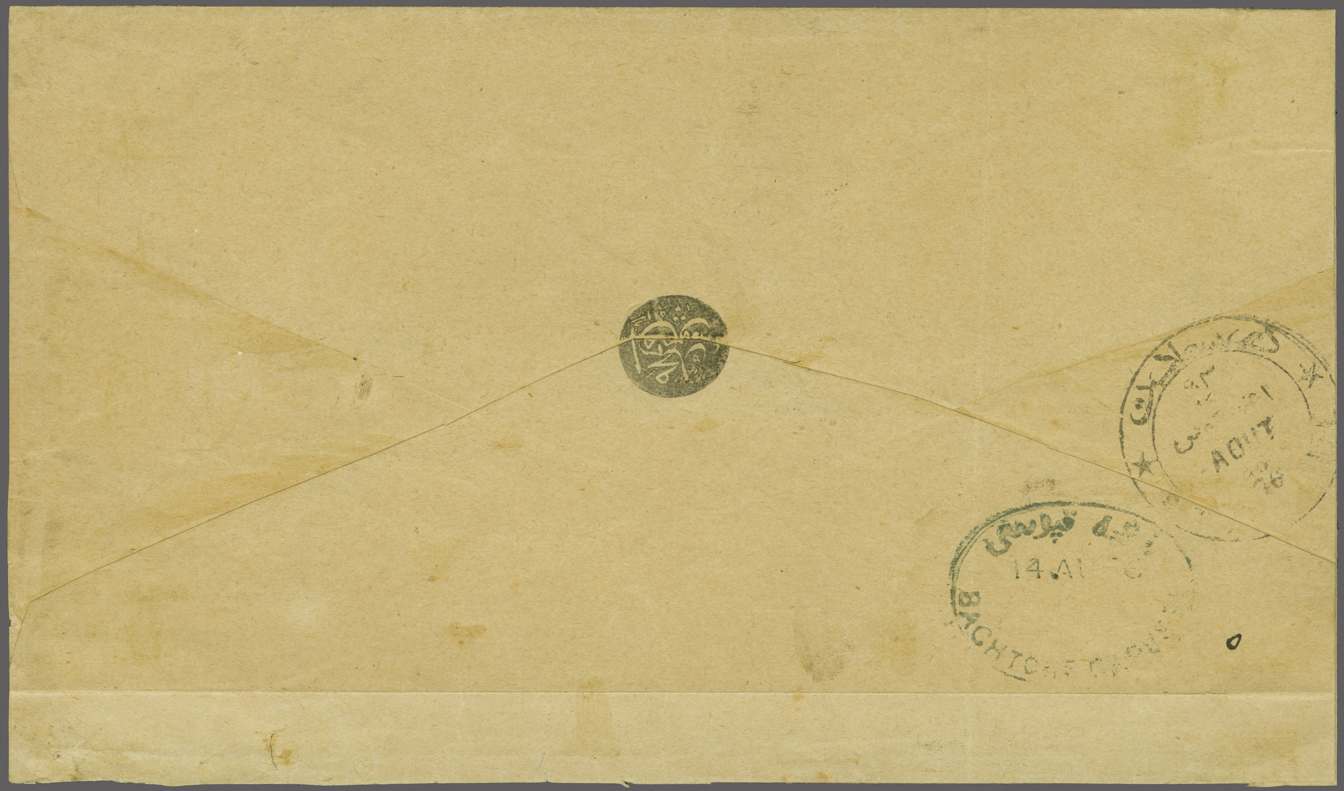 fig. 1 - rated 'RRR') carried at 1½ piastre littoral rate: 1 pi. up to 3 dirhems weight plus 20 pa. per extra dirhem (rate schedule of 1868). Reverse with Bagtche Capussi arrirval datestamp (Aug 14, 1876) in black. A scarce and appealing cover (Image 1)