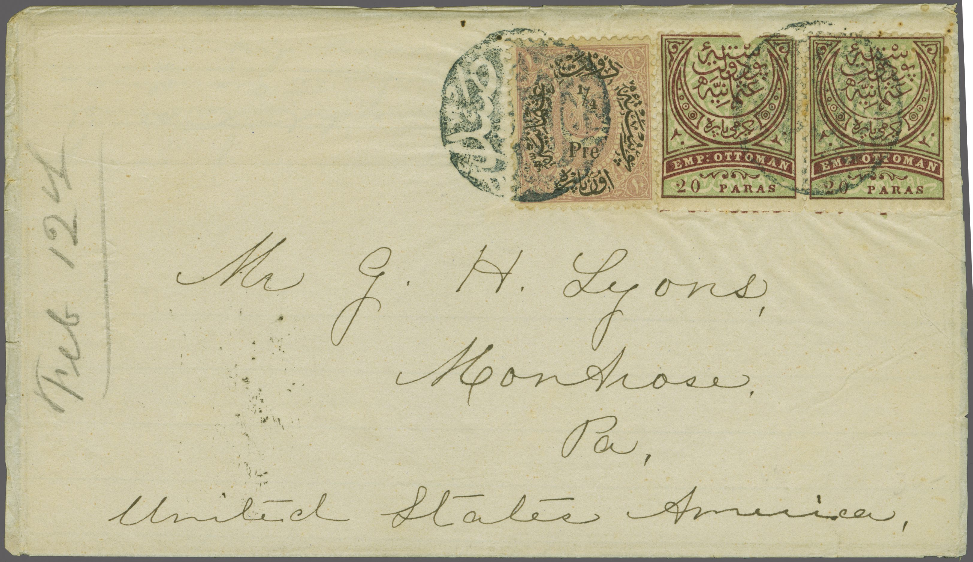 Vilayet of Beirut - Säida / Sidon 1876: ¼ pia. on 10 pa. mauve and Empire 1876 20 pa. violet on green horizontal pair, one stamp small nick at top, used on 1881 cover with complete contents to Montrose, Pa., USA tied by two