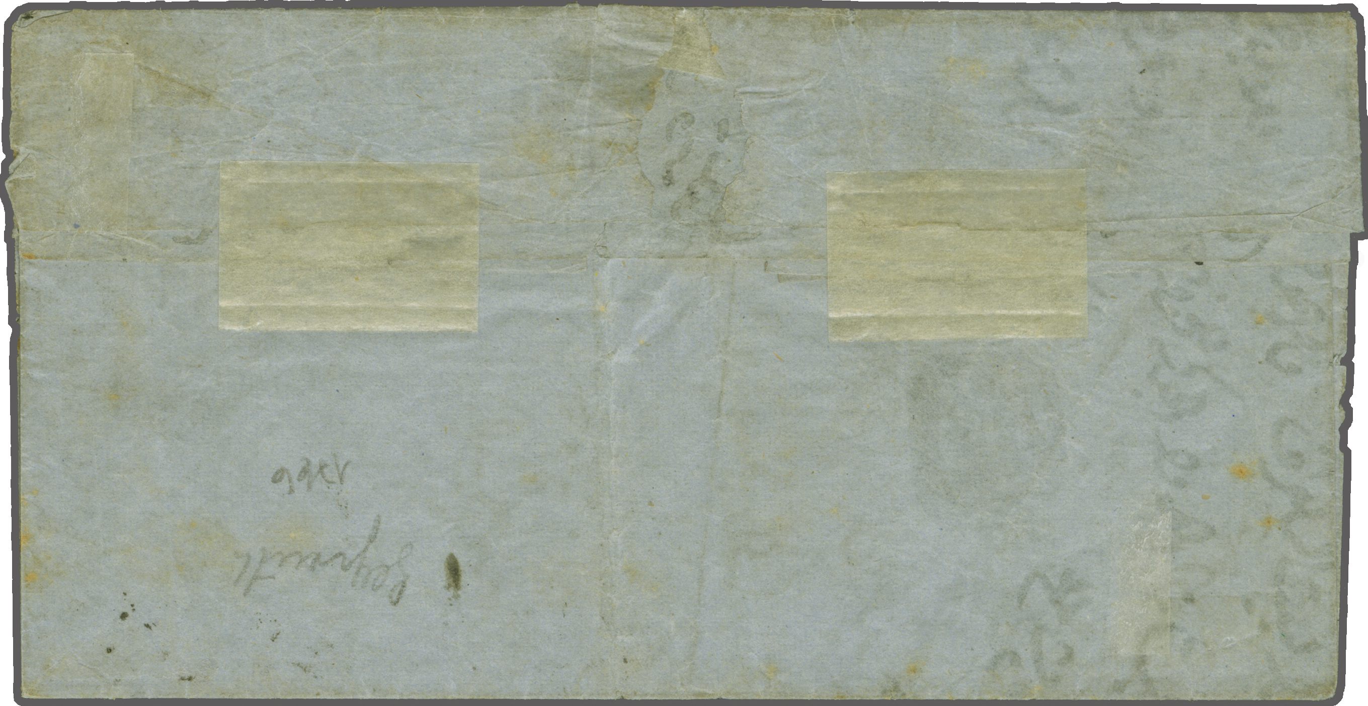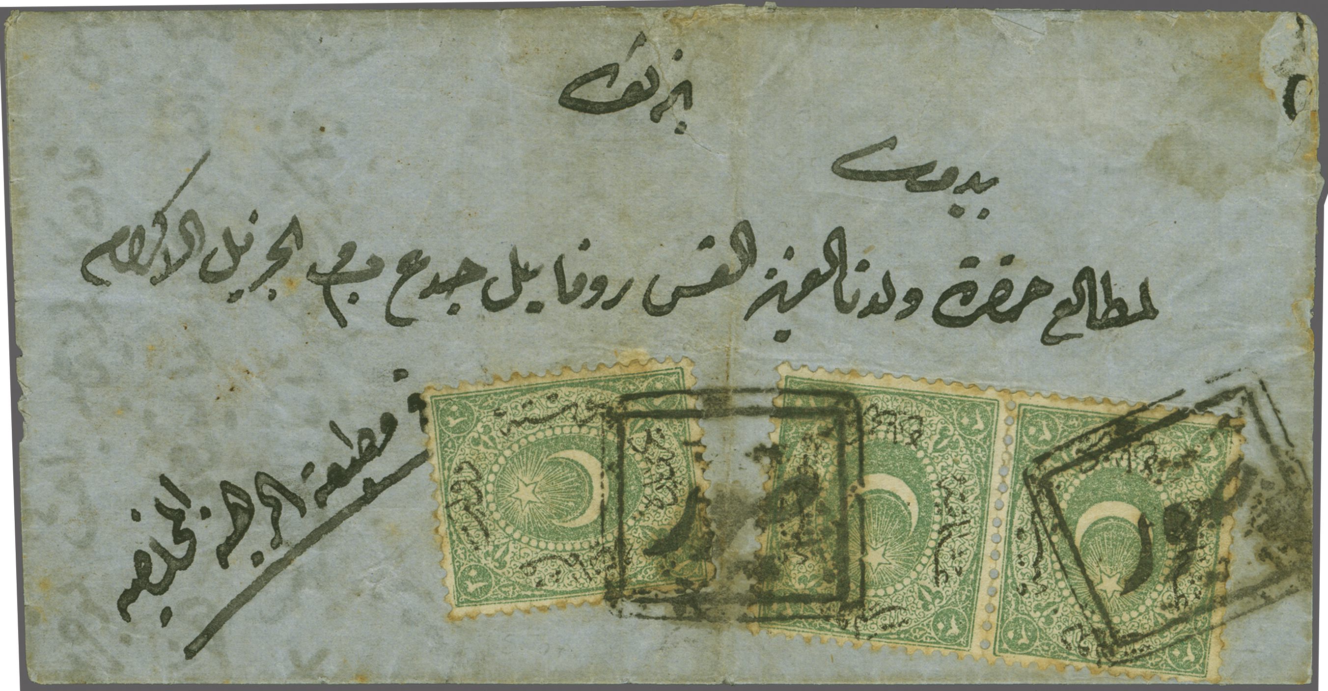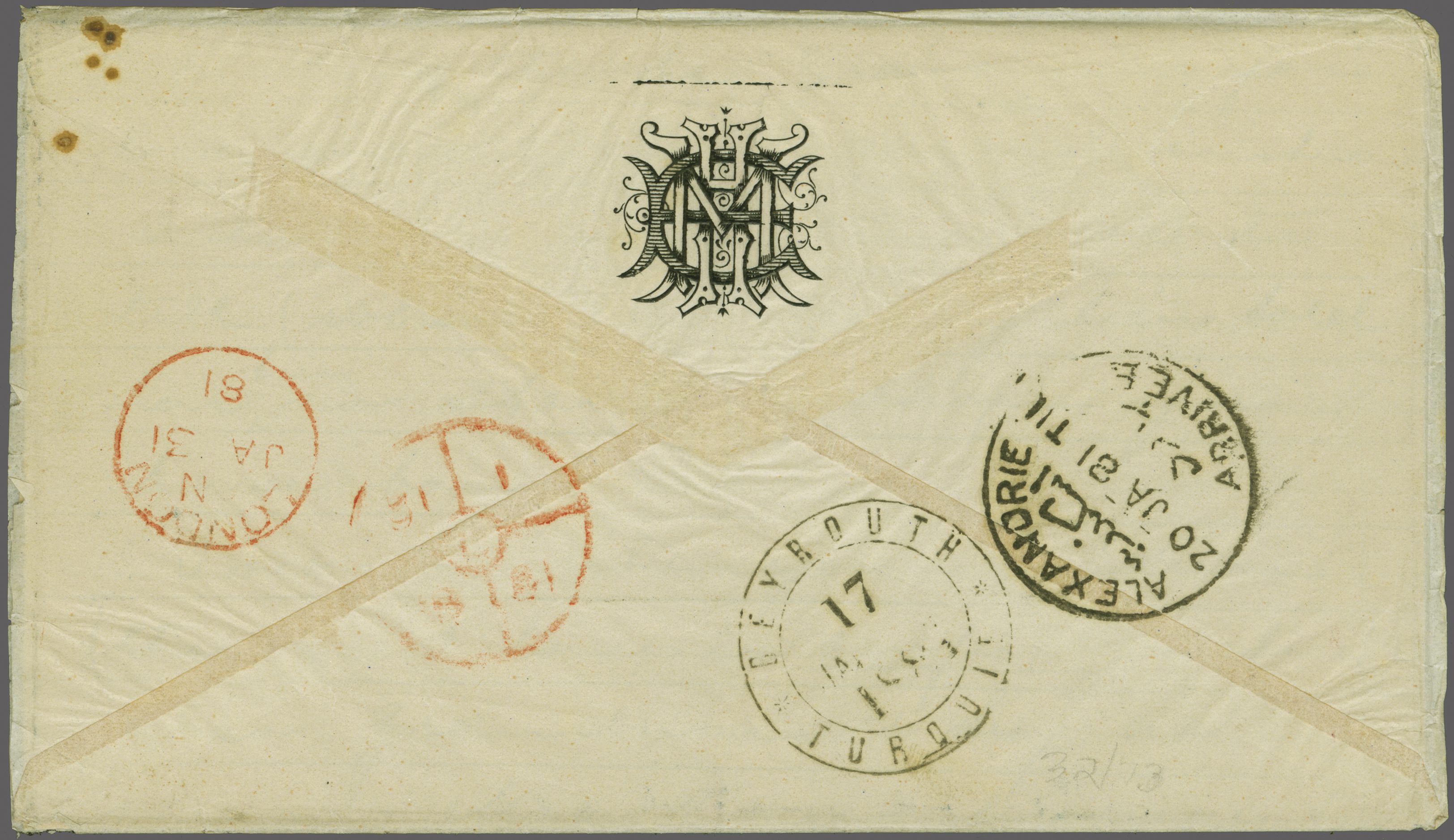strikes of circular "SAIDA POSTA SHUBESI - 1287" negative seal (Saida Postal Branch 1871) handstamps in blue-black ink (Coles & Walker fig. 111, Ziya fig. 2 - rated 'RRR'). Reverse with "Beyrouth / Turquie" cds (Jan 17), Alexandria cds (Jan 20),