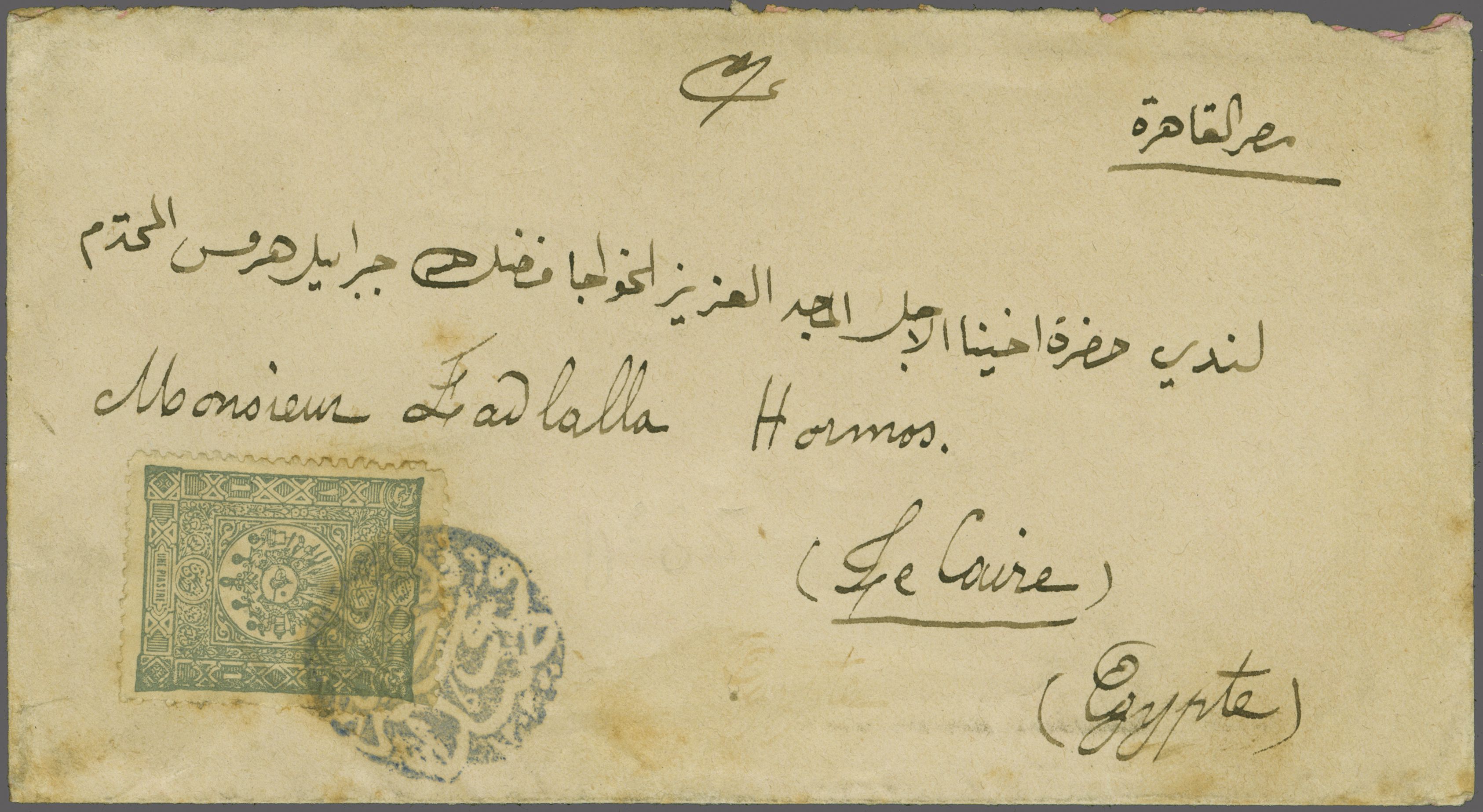 Vilayet of Beirut - Säida / Sidon 1892: Turkey 1 pi. grey-blue, a used example on 1898 cover to Cairo, Egypt tied by superb strike of circular "TELEGRAF VE POSTA HANE SAIDA - 1303" negative seal handstamp (Telegraph & Post