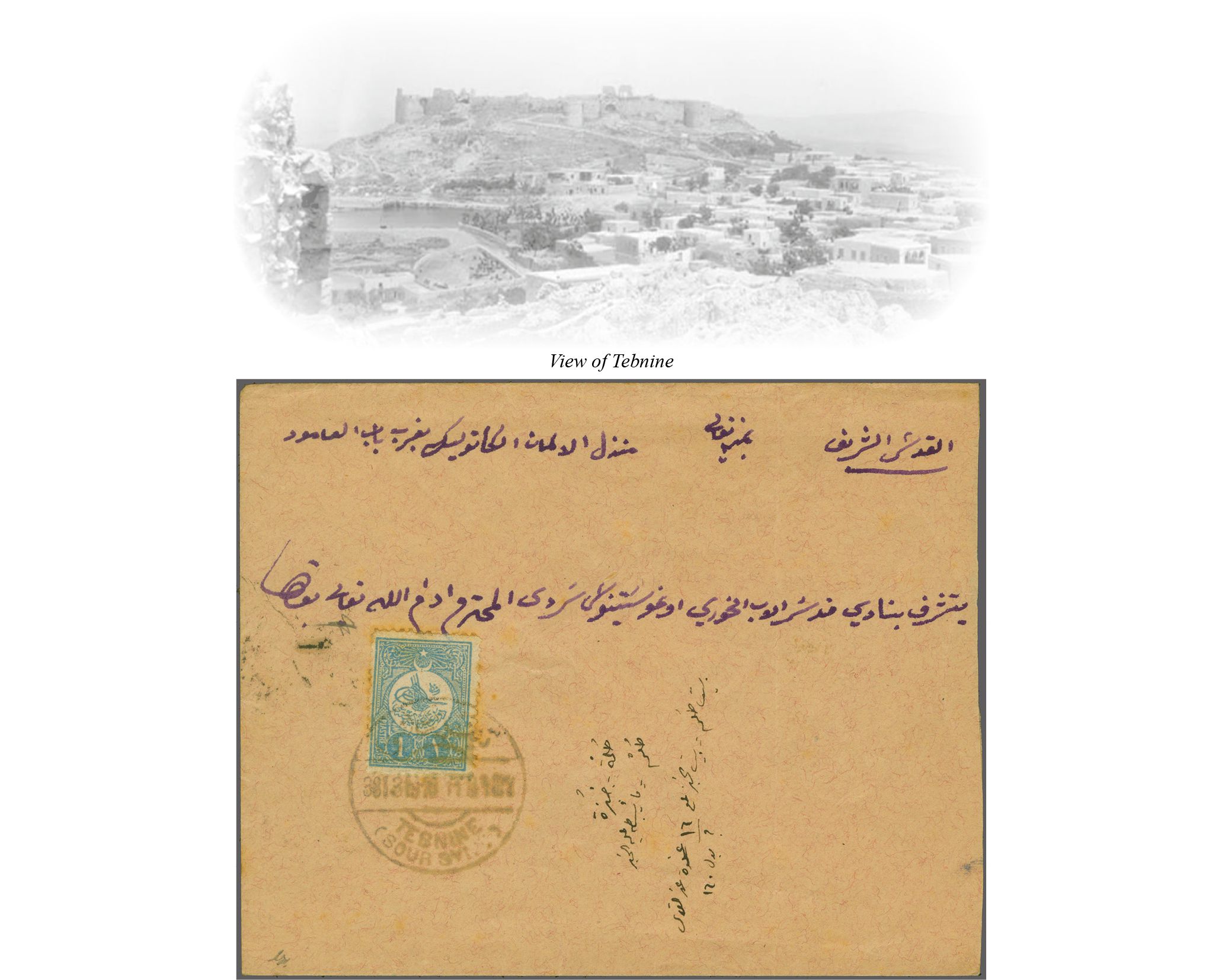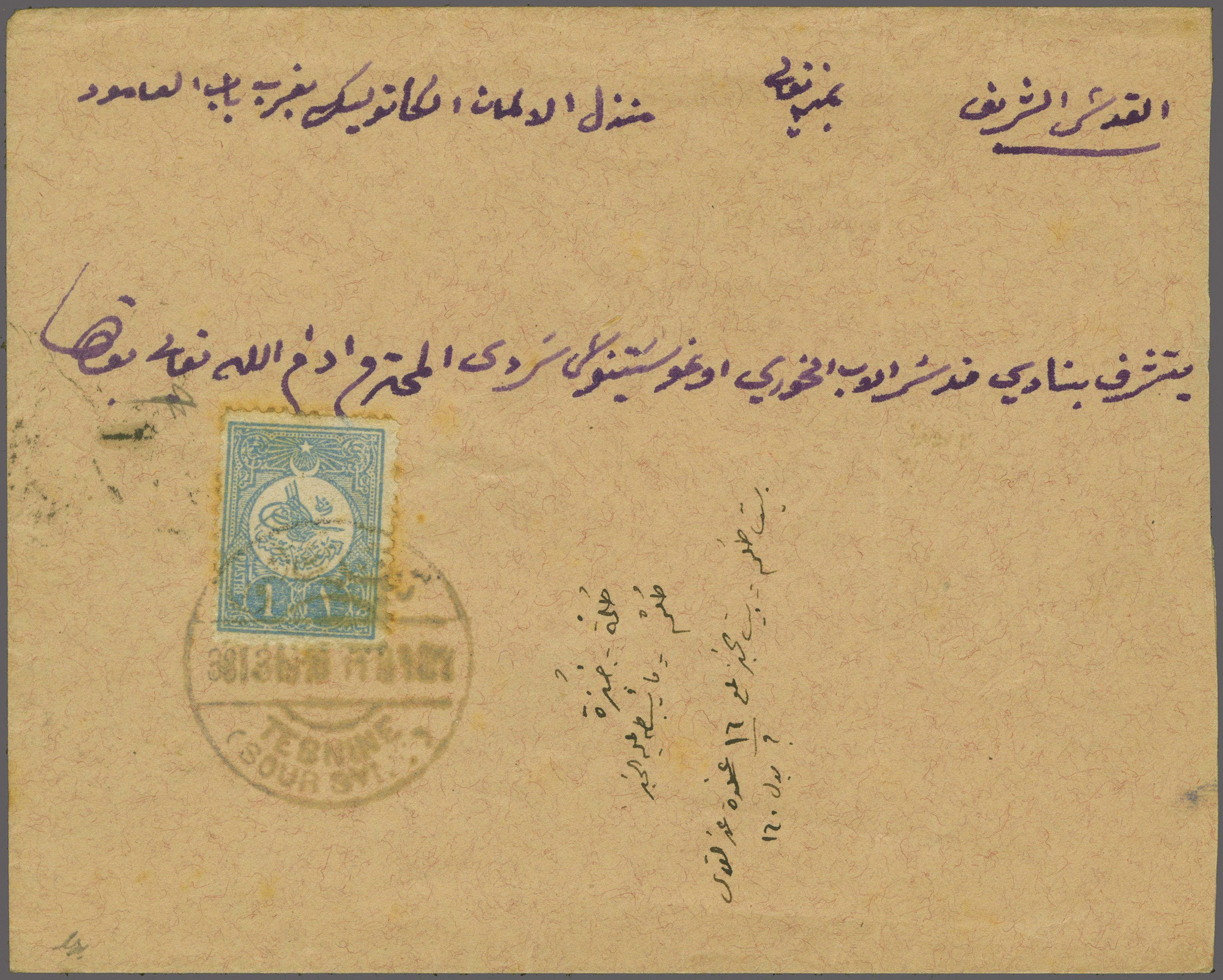 Vilayet of Beirut - Tebnine 1909: Turkey 1 pi. blue, a slightly aged used example on 1910 cover from Tebnine to Jerusalem boldly tied by bilingual "TEBNINE / (SOUR SYRIE)" circular datestamp in black (Coles & Walker