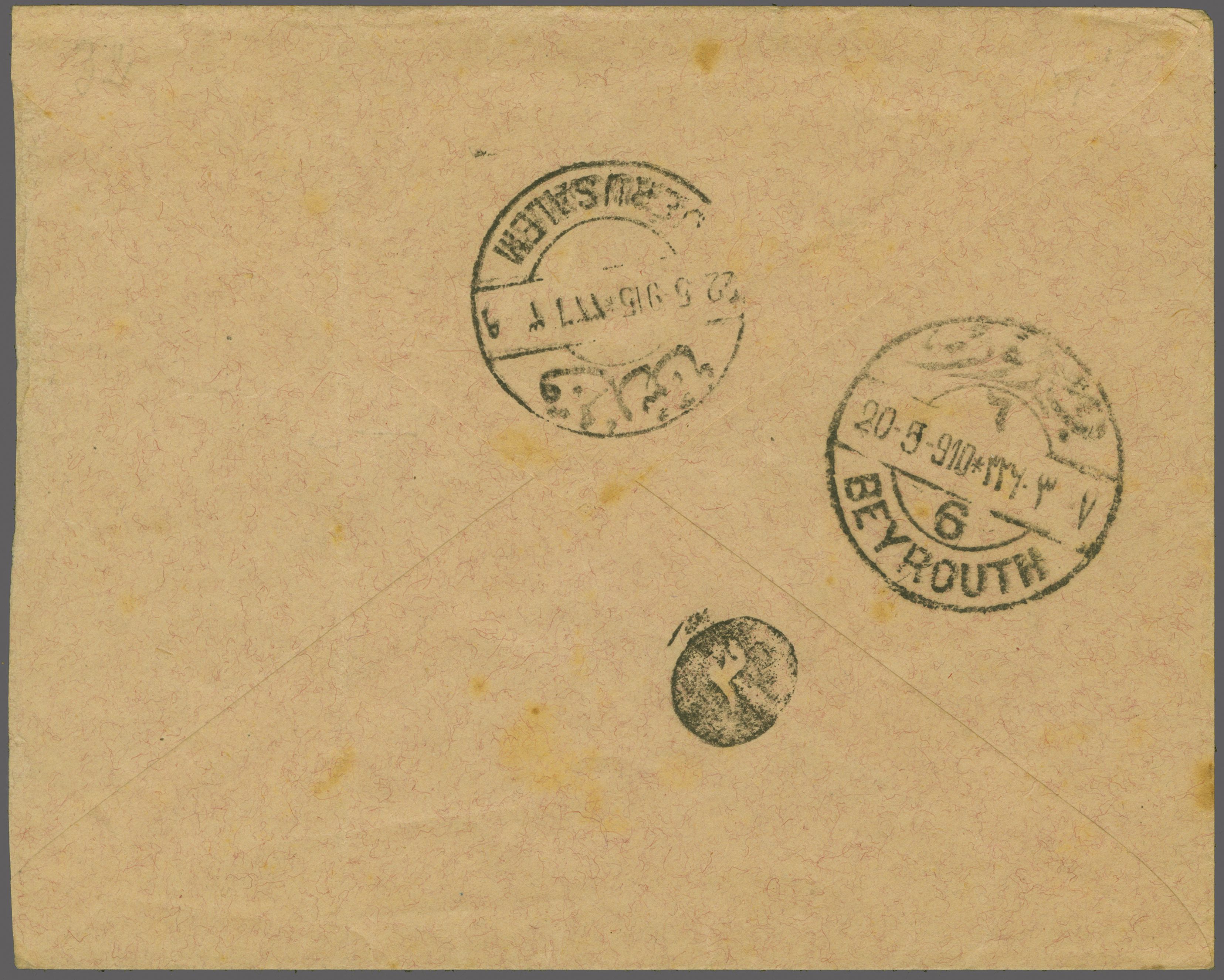 Alexandria, Egypt tied by "BUR. AMB. BEYROUTH-DAMAS 2" circular datestamp (Ziya fig. 507 - rated 'RR') in black with Alexandria cds (Aug 29, 1911) on reverse and Ramleh arrival (Aug 30). The cover slightly trimmed and with flap fault but a scarce