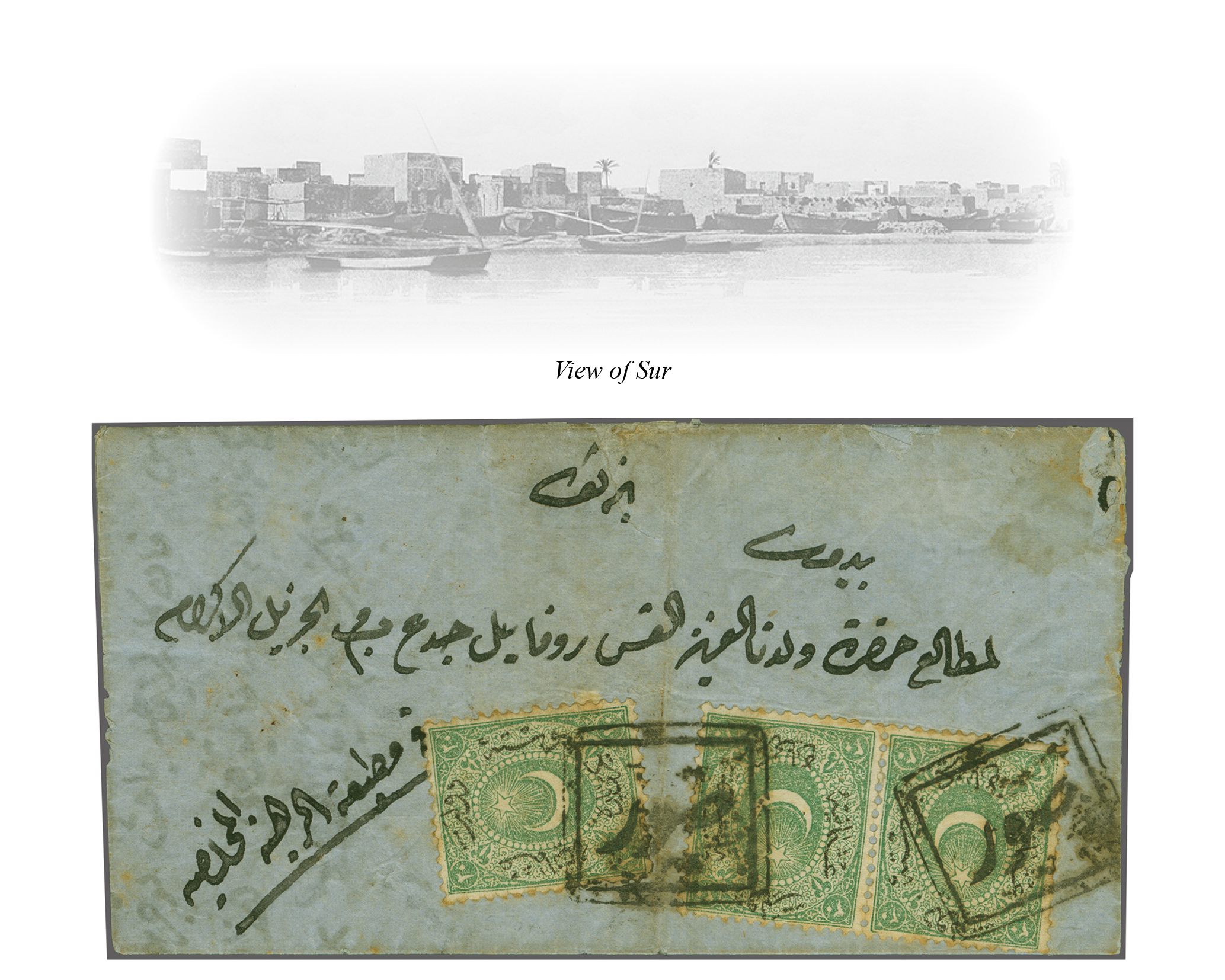 route hours, tied by fine strikes of double framed all Arabic "SUR" handstamps in black (Coles & Walker fig. 124, Ziya fig. 1 - rated 'RRR'). Minimal ageing and central file fold away from the adhesives, a very rare entire. Note: This cover is
