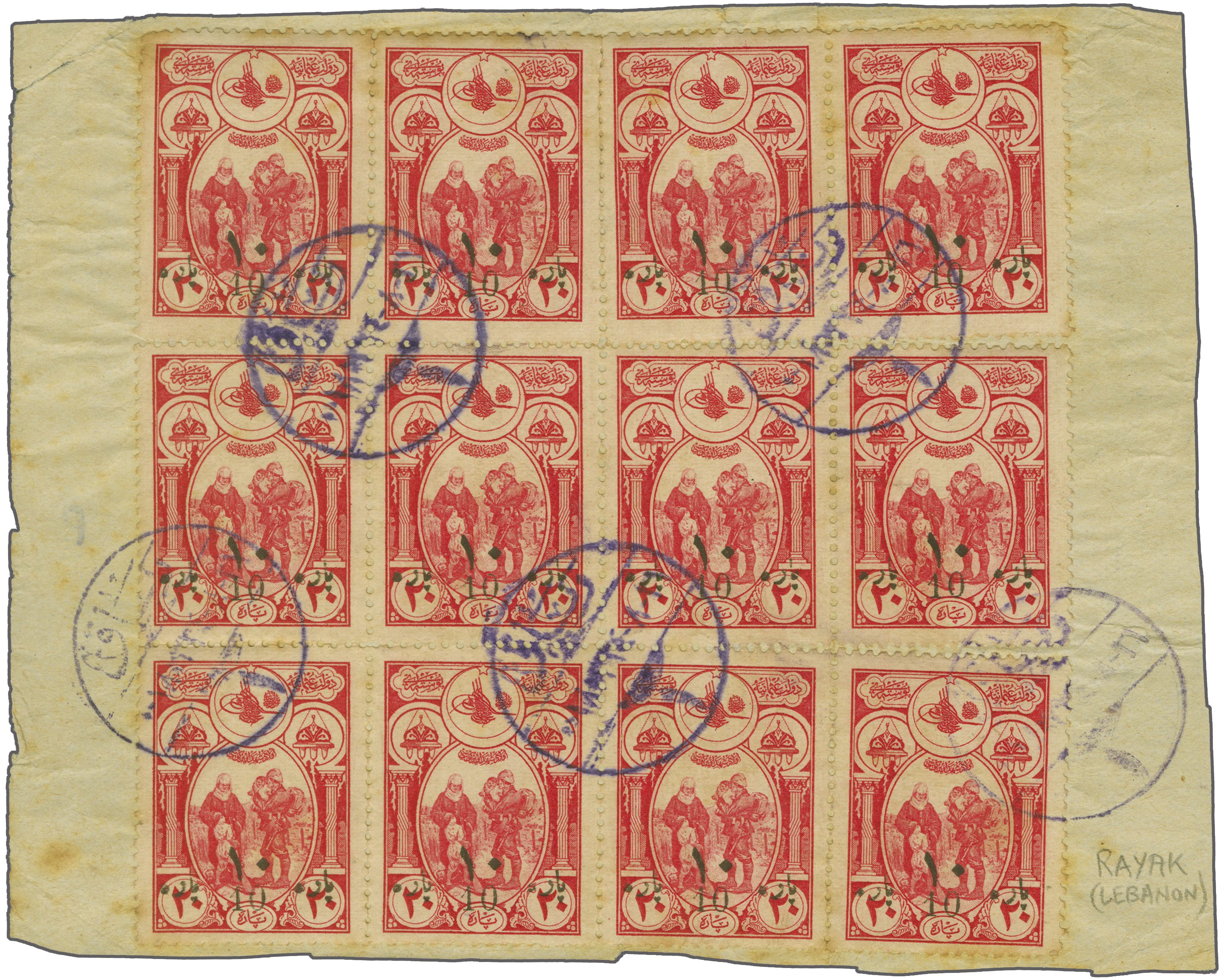 Vilayet of Beirut - Rayak / Riyaq 1917: 10 pa. on 20 pa. rose, twelve examples used on piece, all tied by five strikes of circular all arabic "RAYAK / 1" datestamp (Coles & Walker fig. 196, Ziya fig. 3) in violet. Some