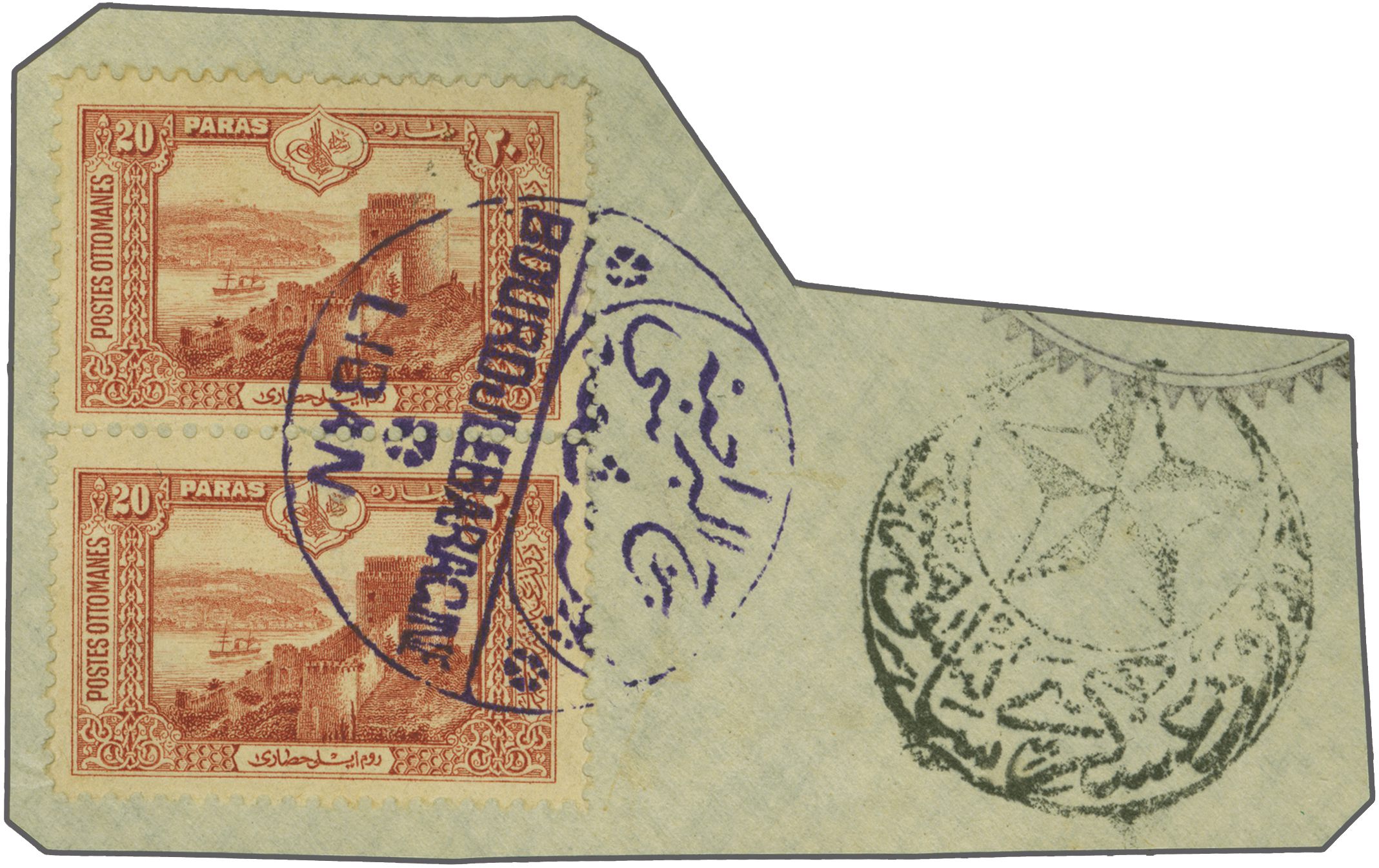 Vilayet of Beirut - Borj al-Barajneh 1914: 20 pa. red, a vertical pair used on small piece tied by decorative bilingual circular dated "BOURDJ LE BARACINE LIBAN" handstamp in violet with Star and Crescent Censor cachet above
