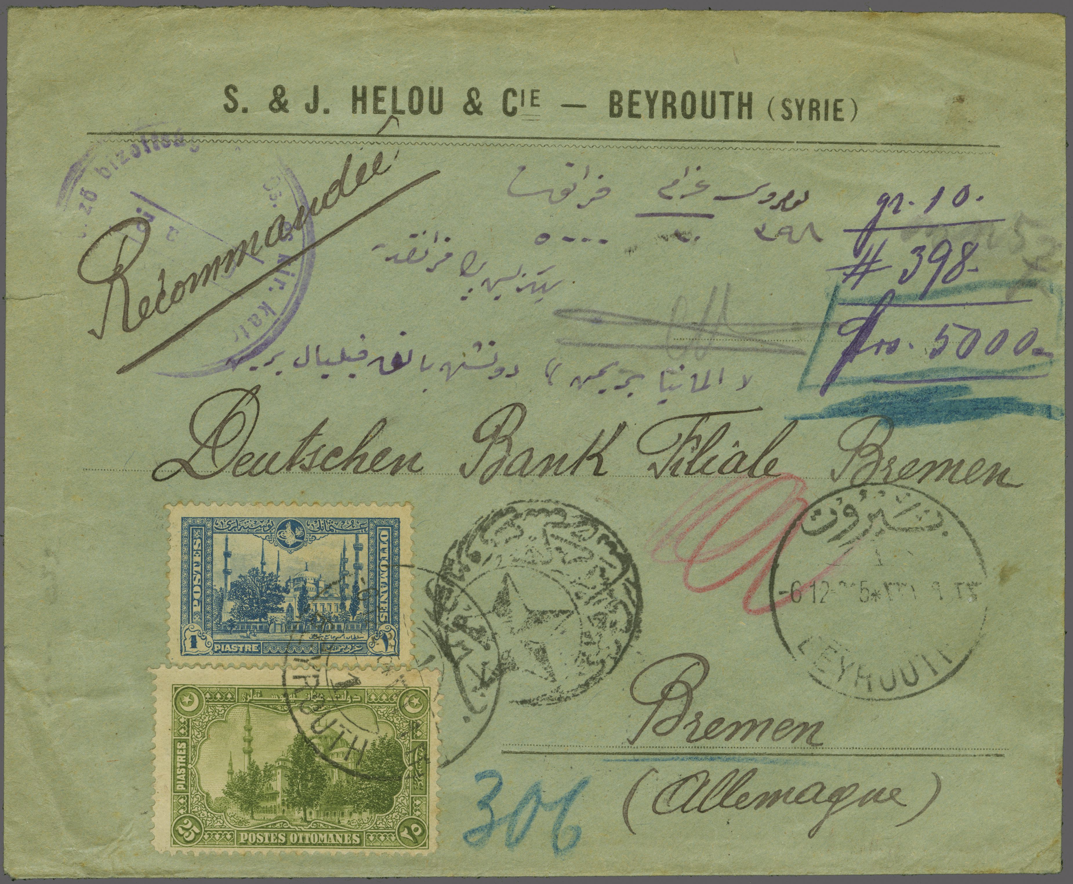 Vilayet of Beirut - Beirut / Beyrut 1914: Turkey 20 pa. red, 1 pi. deep blue (2) and rare usage of 25 pi. olive-green on 1915 registered Money Letter to Bremen, Germany insured for 5'000 francs, all tied by "BEYROUTH / 1"