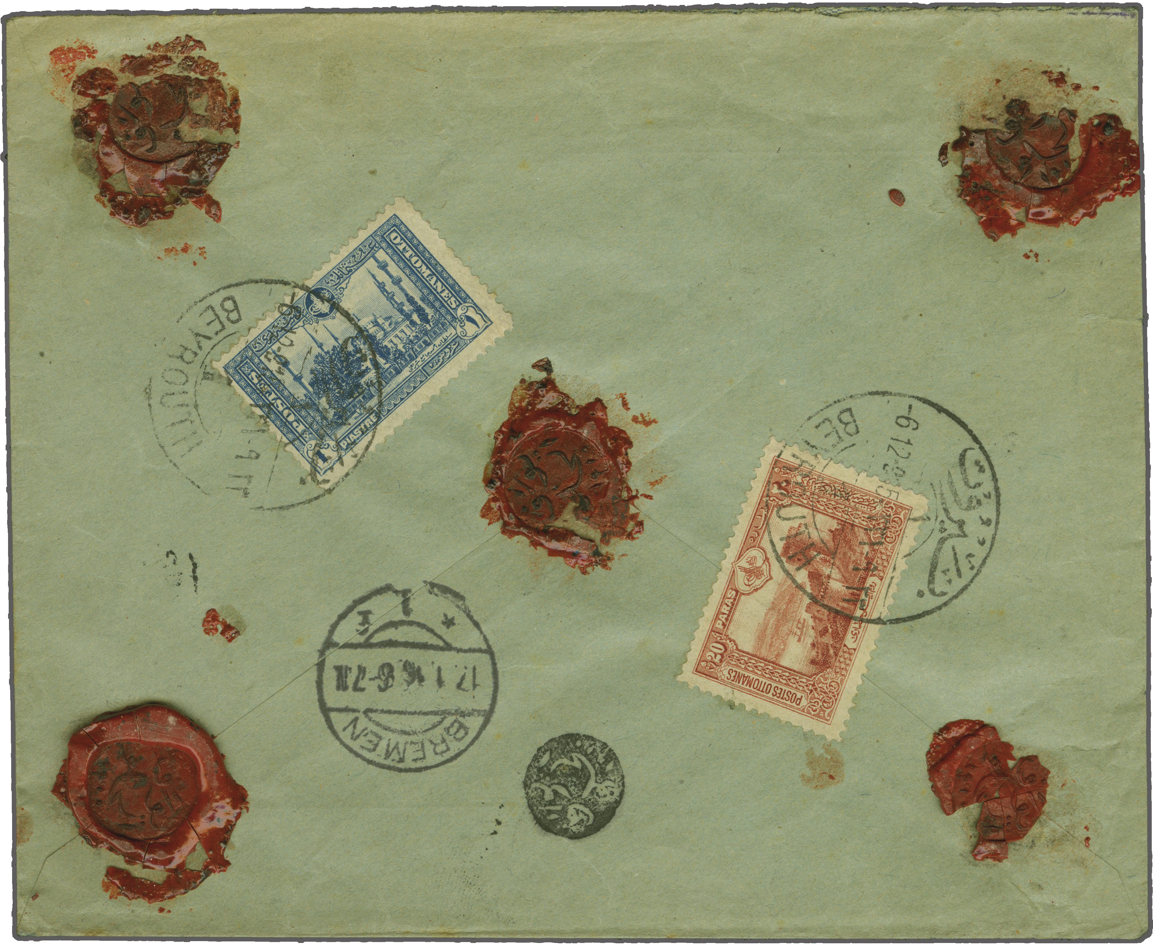 circular datestamps (Dec 6) in black (the 20 pa. and one 1 pi. on reverse). Beirut Star and Crescent Censor cachet in black and German Censor in violet with Bremen arrival on reverse. An unusual usage (Image 1)