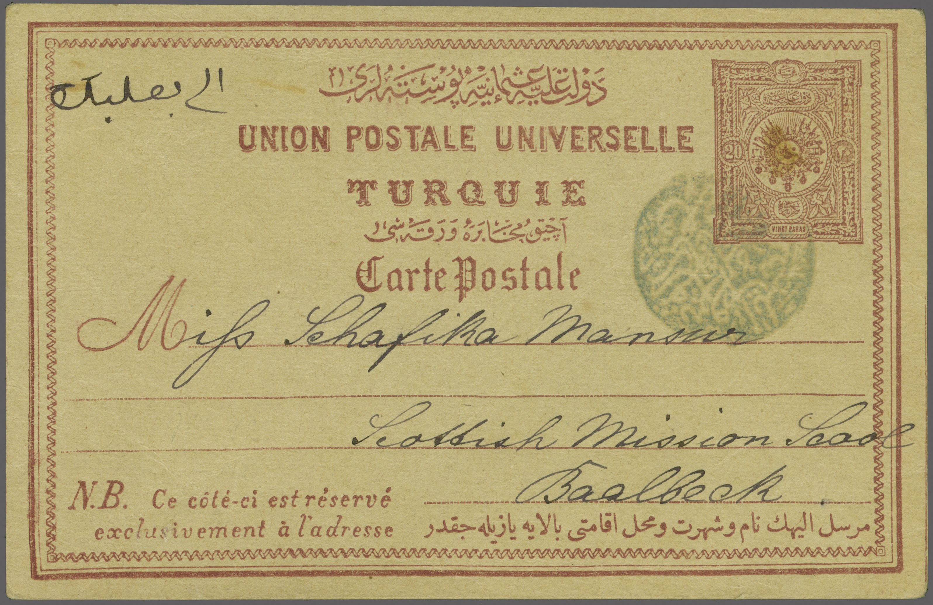 Vilayet of Beirut - Aria / Arya / Araya 1892: Turkey 20 pa. claret postal stationery card used from Araya to the Scottish Mission School in Baalbek, cancelled by "ARYA POSTA SHUBESI" negative seal handstamp struck in