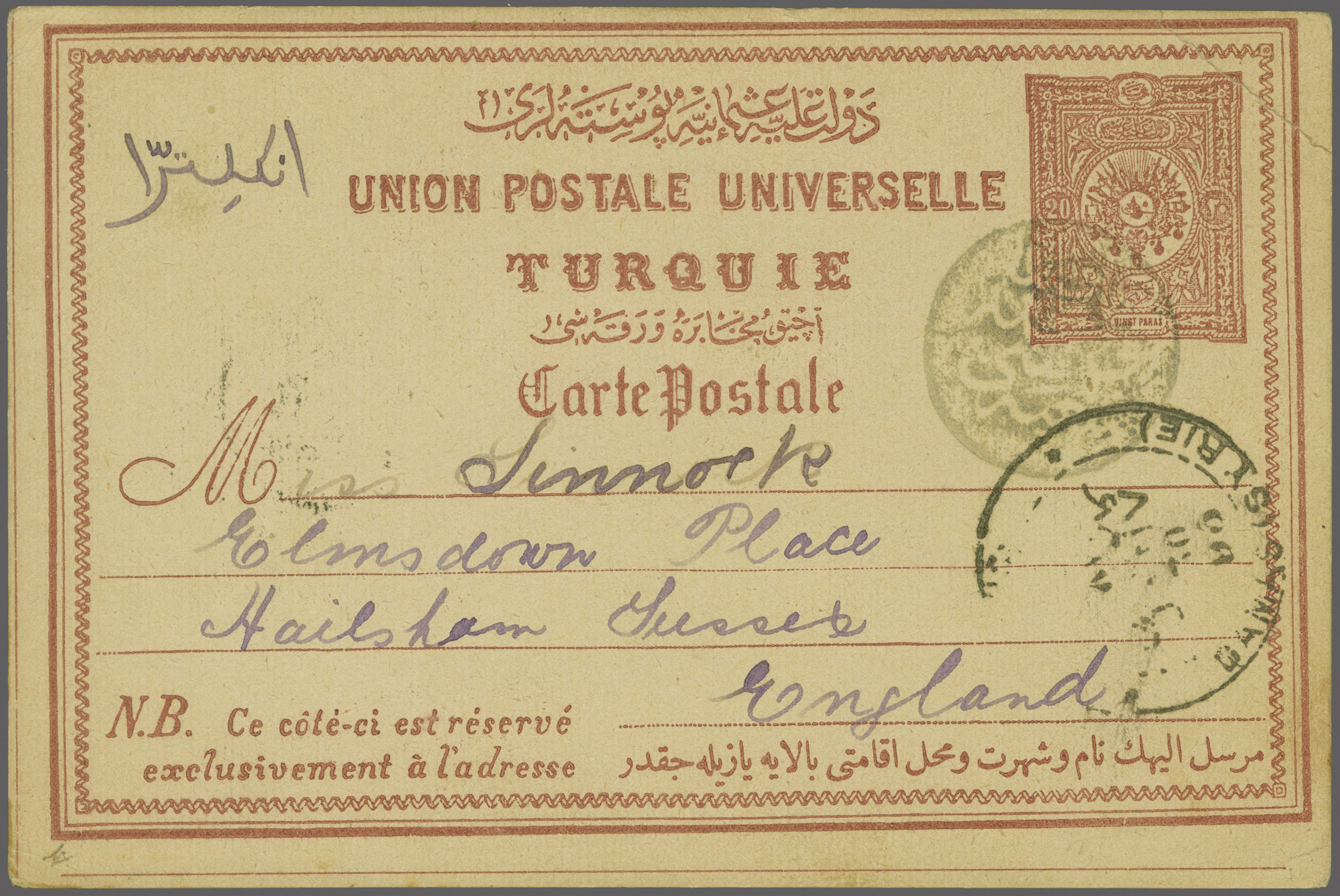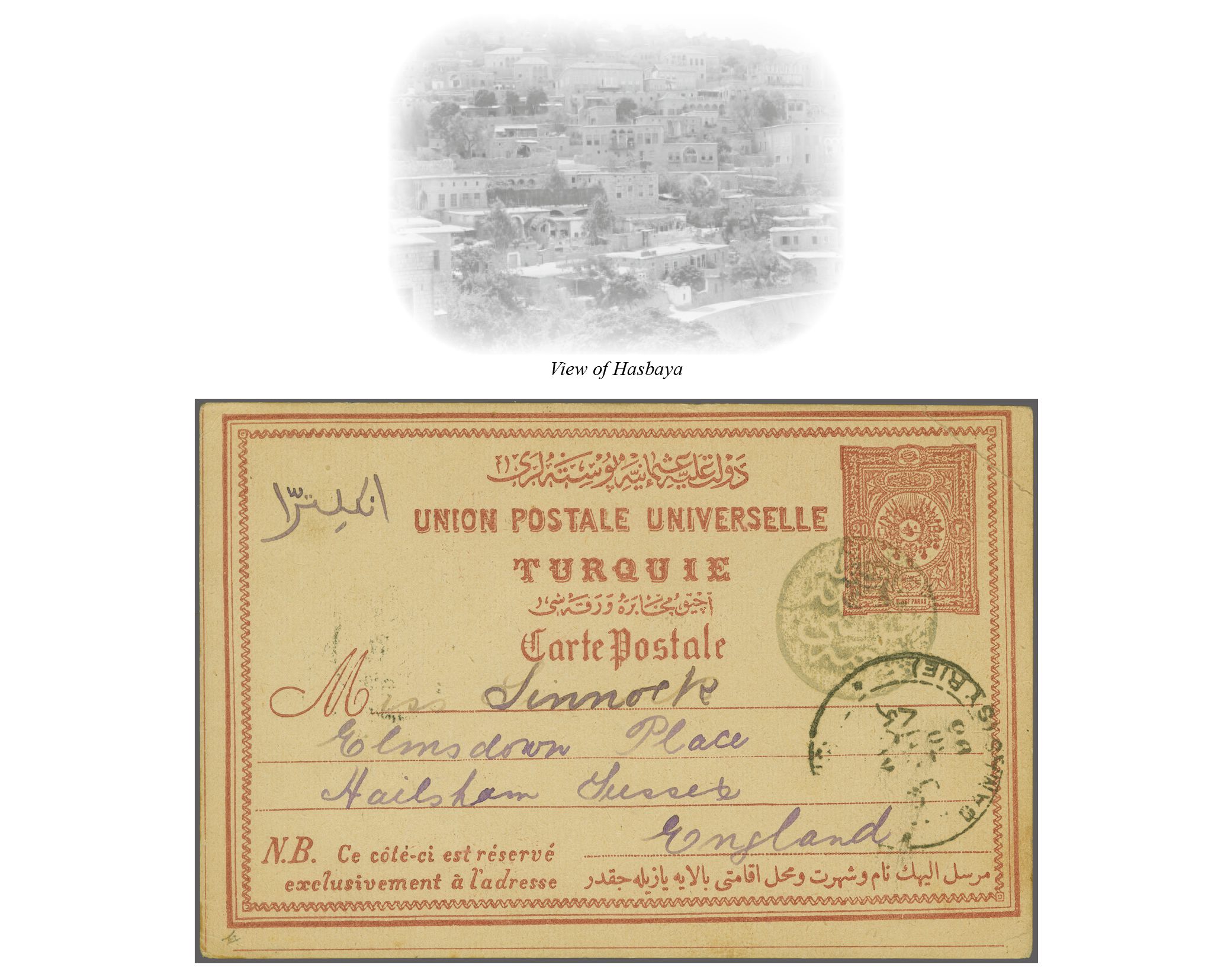 Vilayet of Syria - Hasbaya 1892: Turkey 20 pa. claret postal stationery card used from Hasbaya (January 26, 1895) to Hailsham, England struck with circular "HASBAYA POSTA SHUBESI" negative seal (Hasbaya Postal Branch) in black