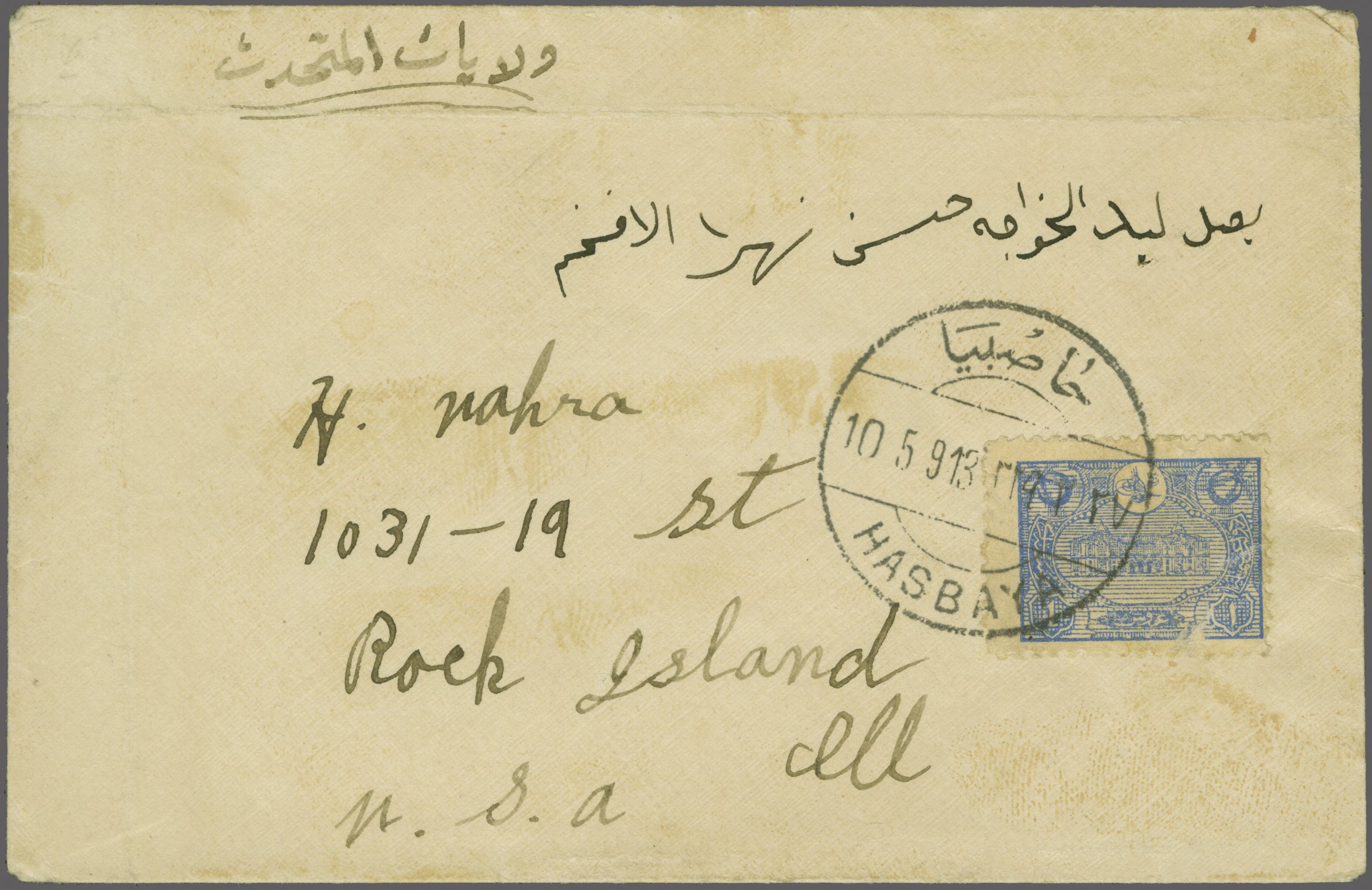 Vilayet of Syria - Hasbaya 1913: 1 pi. ultramarine, a used example on 1913 cover to Rock Island, Illinois, USA tied by bold strike of bilingual "HASBAYA" circular datestamp (May 10) in black (Coles & Walker fig. 95, Ziya