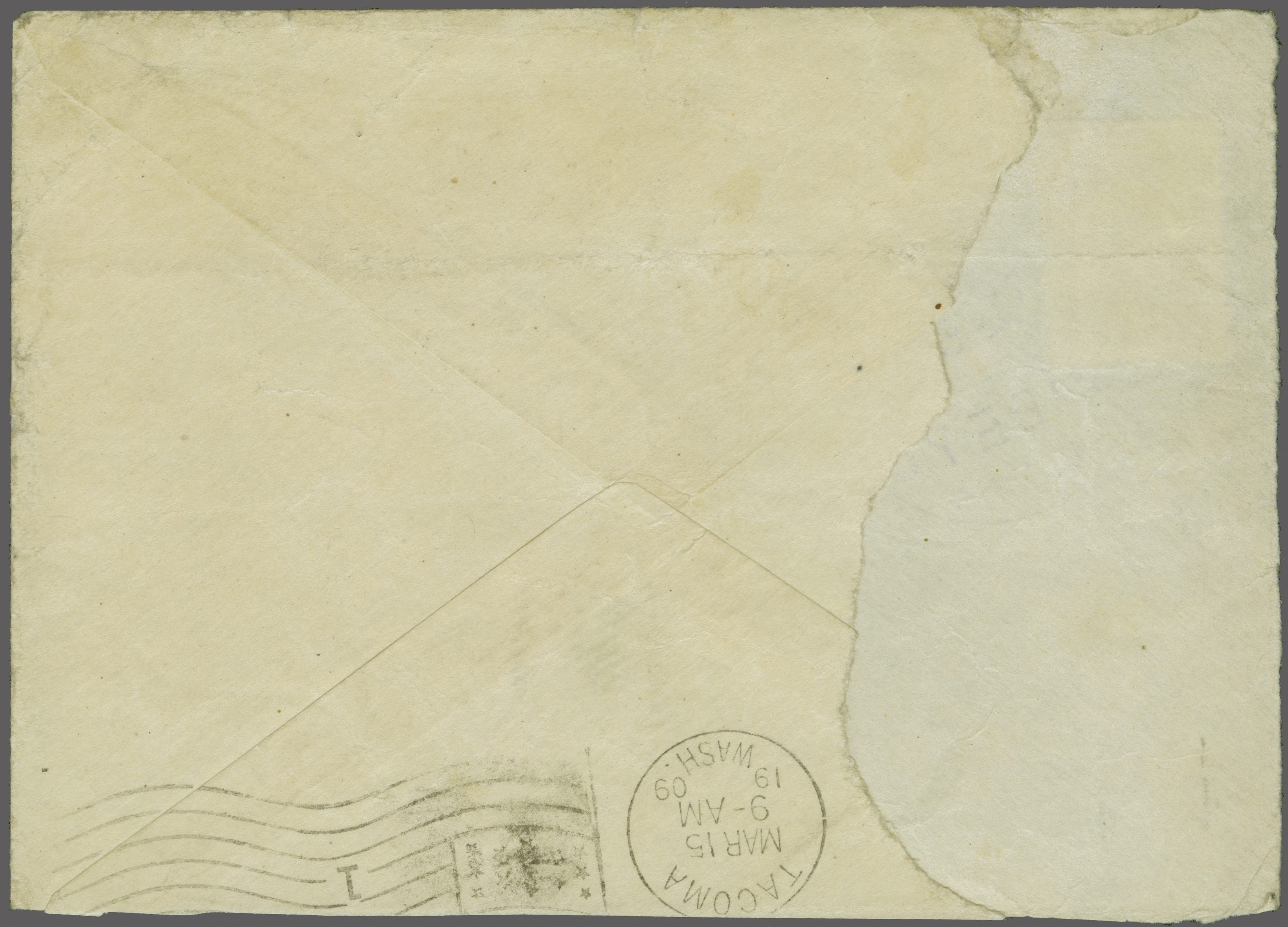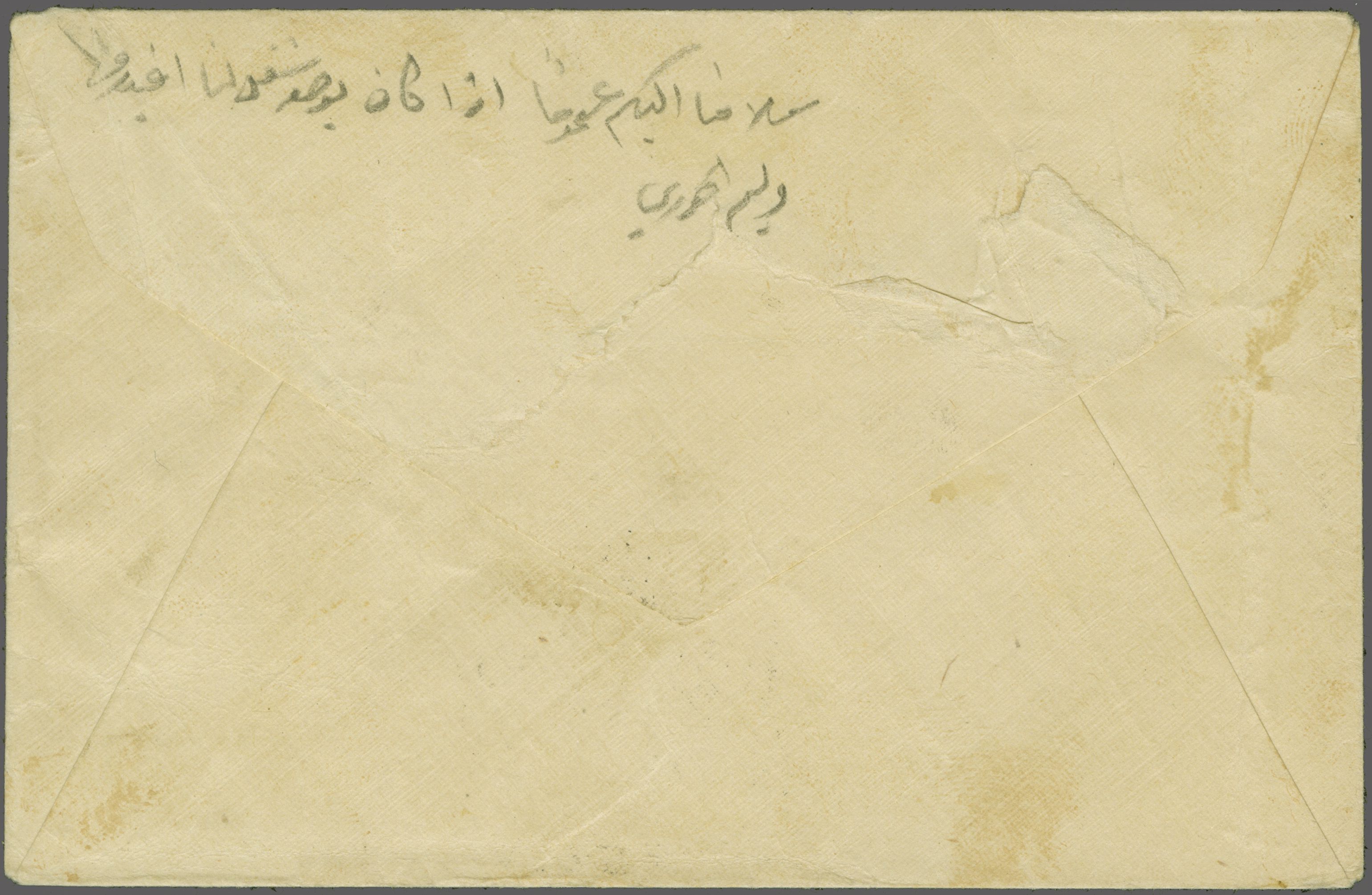 unlisted) with arabic reading "ABIEH POSTA SHUBESI". Somewhat roughly opened with side flap missing on reverse but with Tacoma arrival (March 15). A magnificent usage: Unique (Image 1)