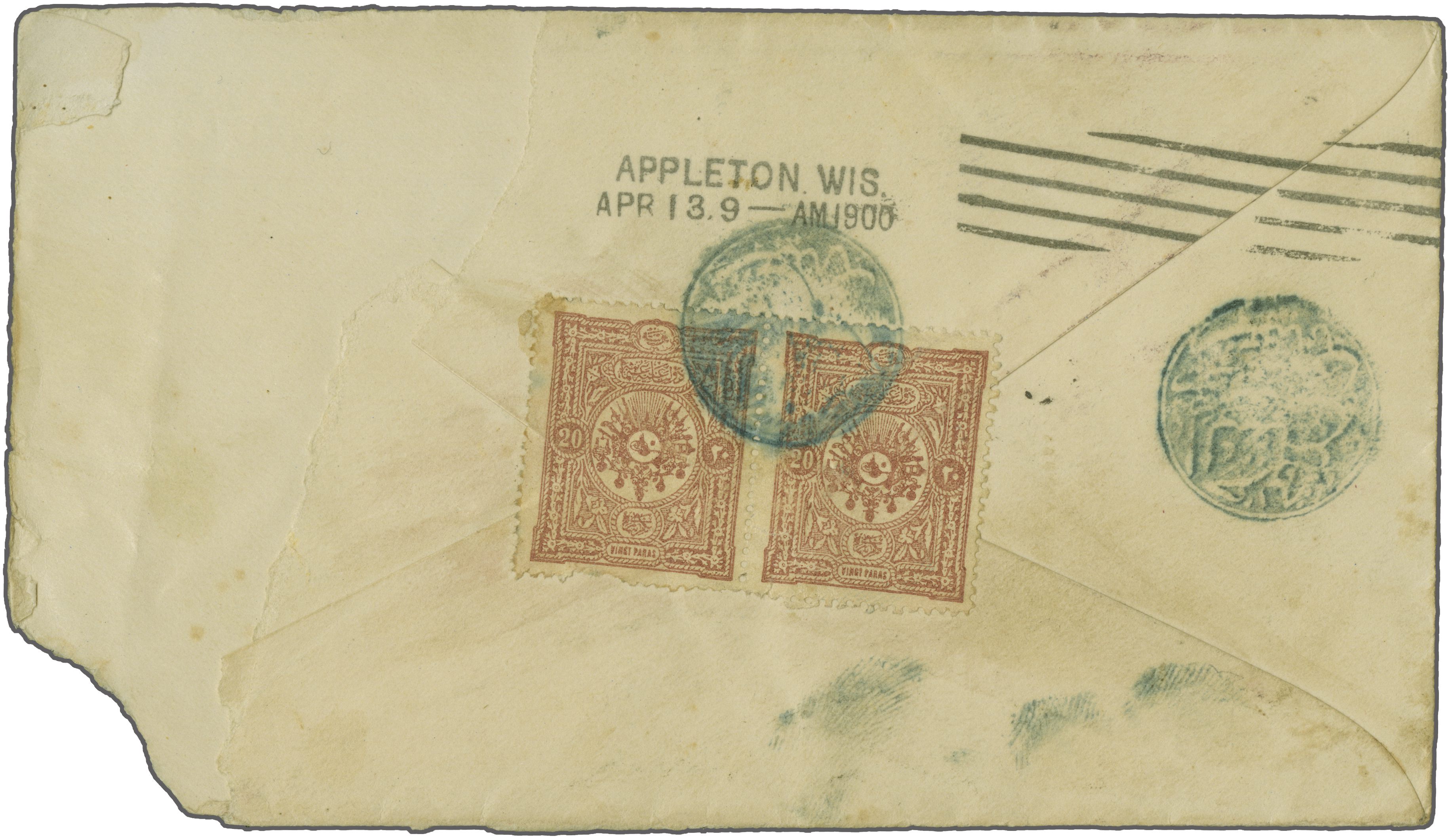 Vilayet of Syria - Hirbet el Bekaa 1892: Turkey 20 pa. claret, a horizontal pair used as seal on reverse of 1900 cover to Appleton, Wisc., USA tied by circular "HIRBET EL BEKAA POSTA SHUBESI" negative seal handstamp (Hirbet el