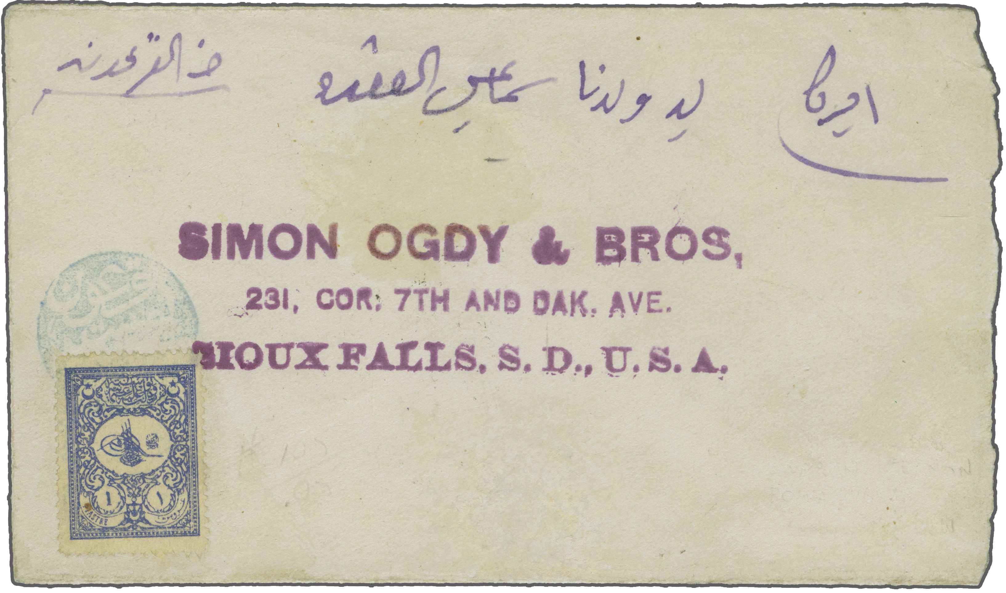 Vilayet of Syria - Karun / Kar-Oun / Karaoun 1901: Turkey 1 pi. violet-blue, a single example used on 1904 cover to Sioux Falls, USA tied by circular "KARAOUN POSTA SHUBESI" negative seal handstamp (Karaoun Postal Branch) in
