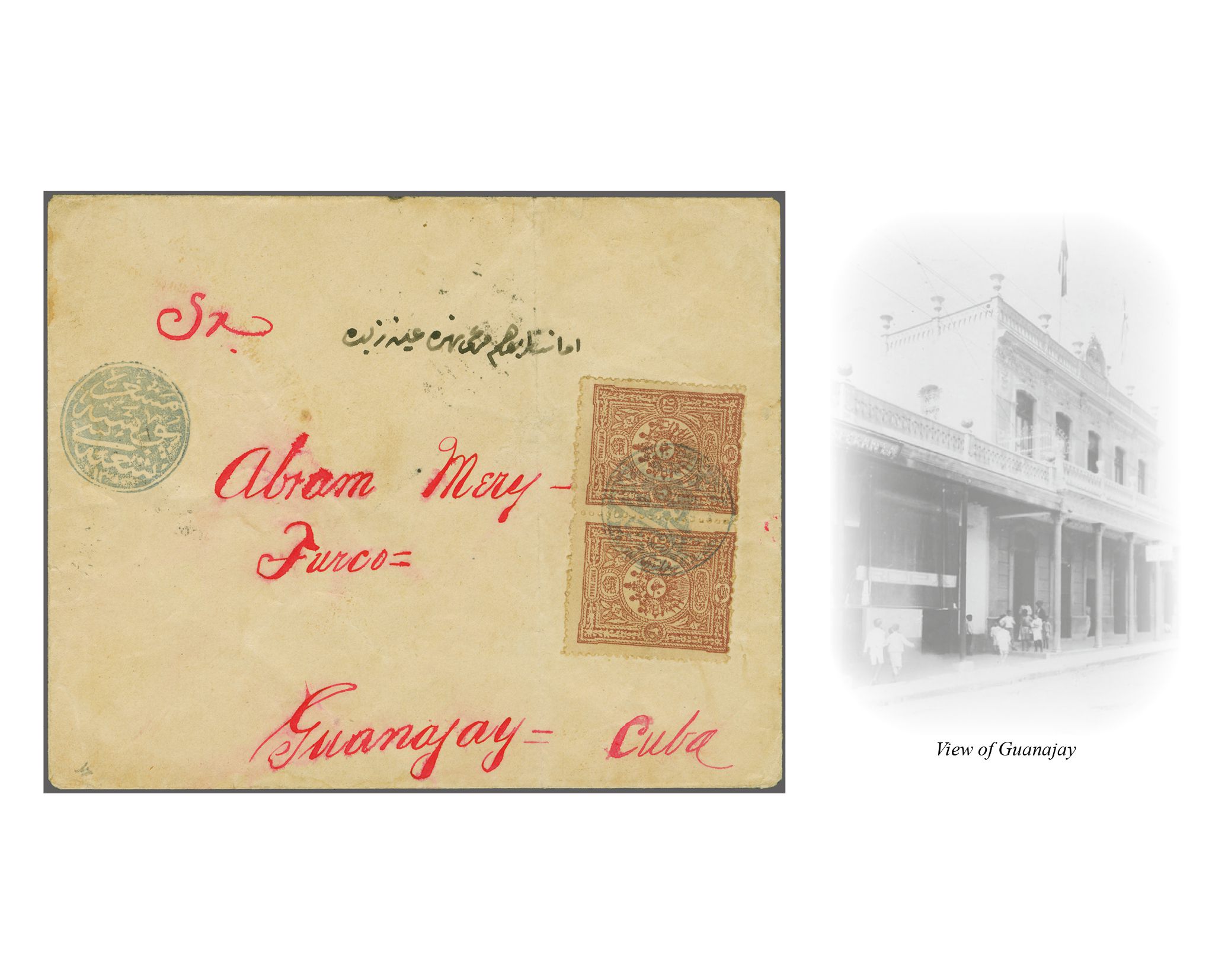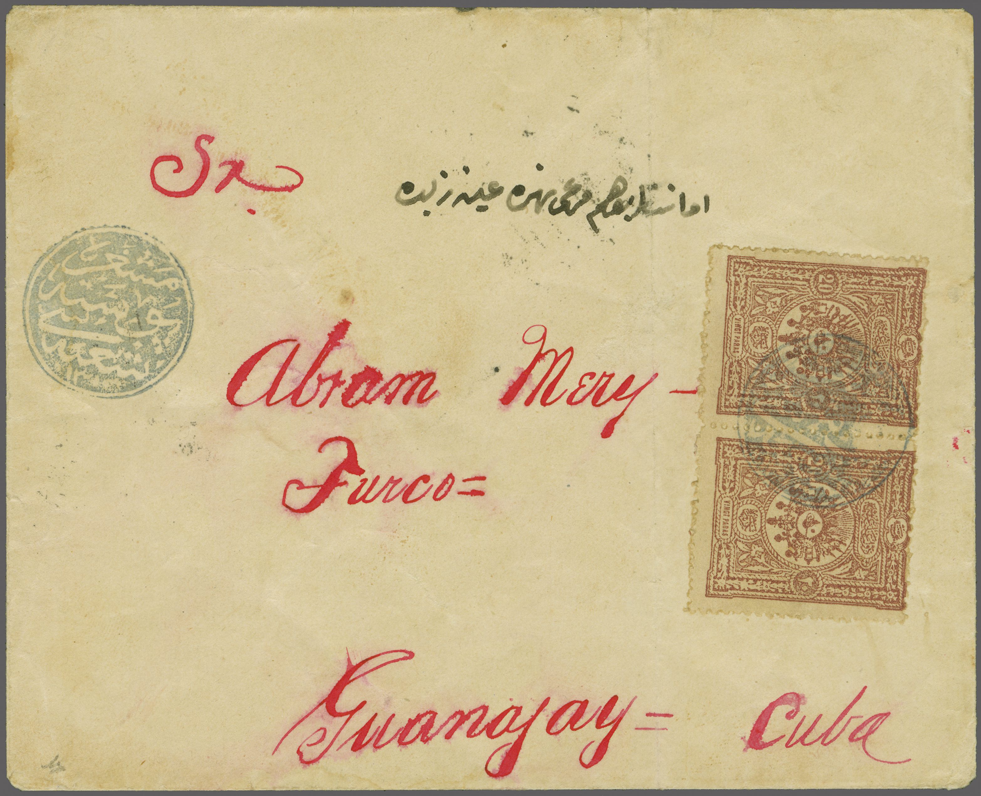 Vilayet of Syria - Machgara / Maşgara 1892: Turkey 20 pa. claret in a horizontal pair, used on 1900 cover from Machgara to Guanajay, Cuba cancelled by complete strike of circular "MACHGARA POSTA SHUBESI - 1300" negative seal