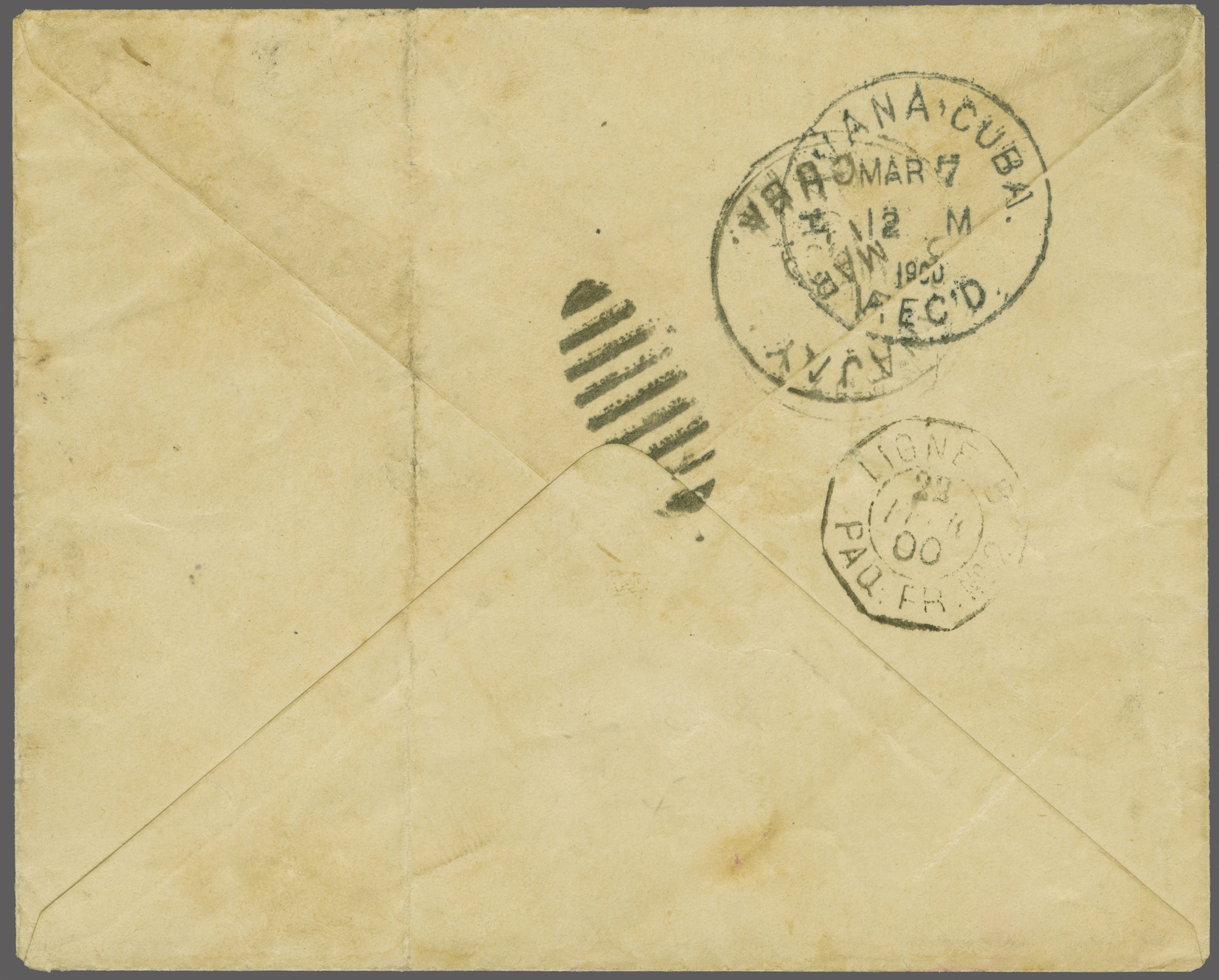 handstamp in blue with exceptional information strike adjacent at left (Coles & Walker fig. 103. Ziya fig. 1 - rated 'RRR'). Reverse with octagonal "LIGNE B / PAQ. FR. No. 2" datestamp (Feb 22) and carried on the "La Navarre" to Havana (March 7)