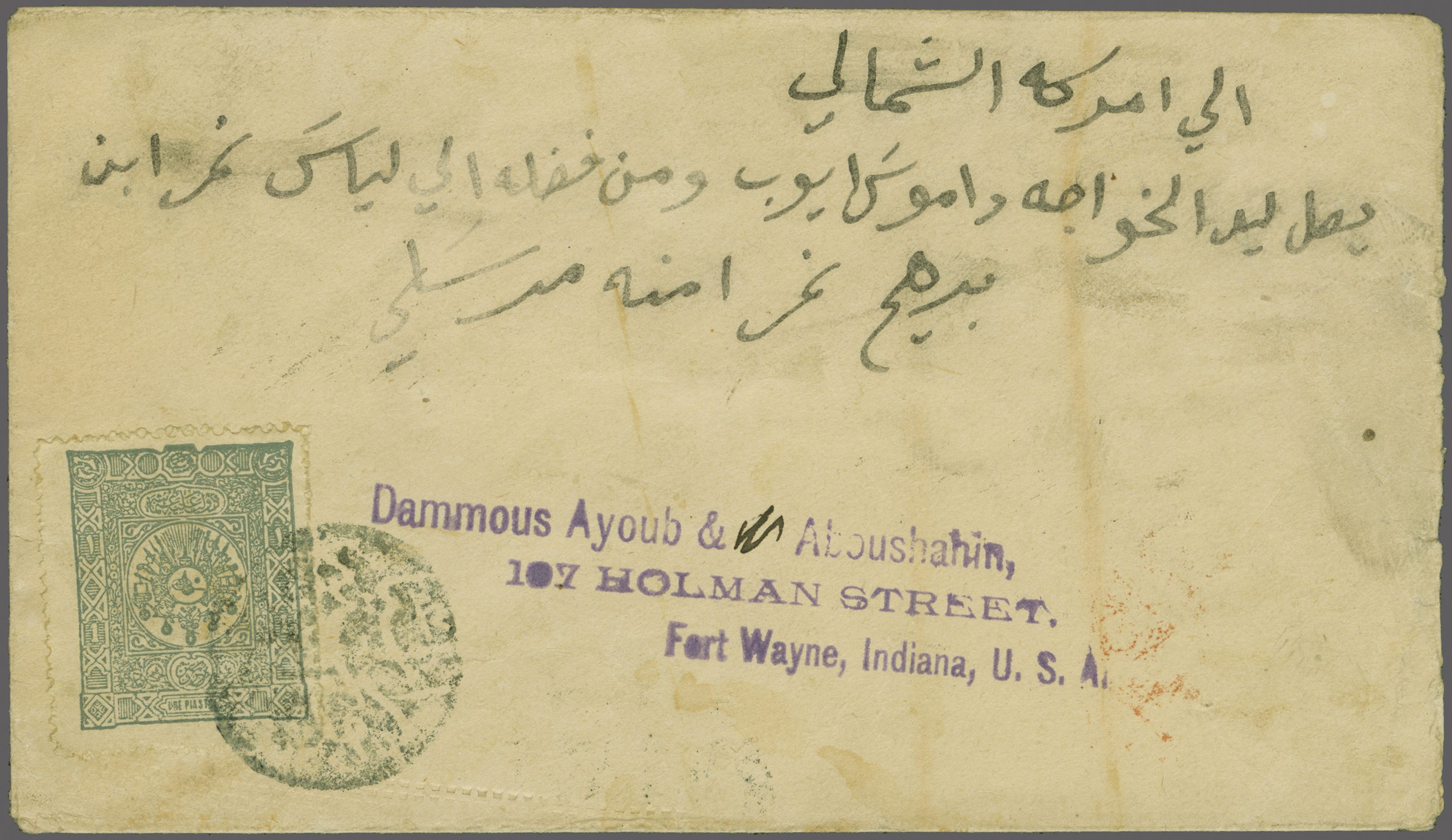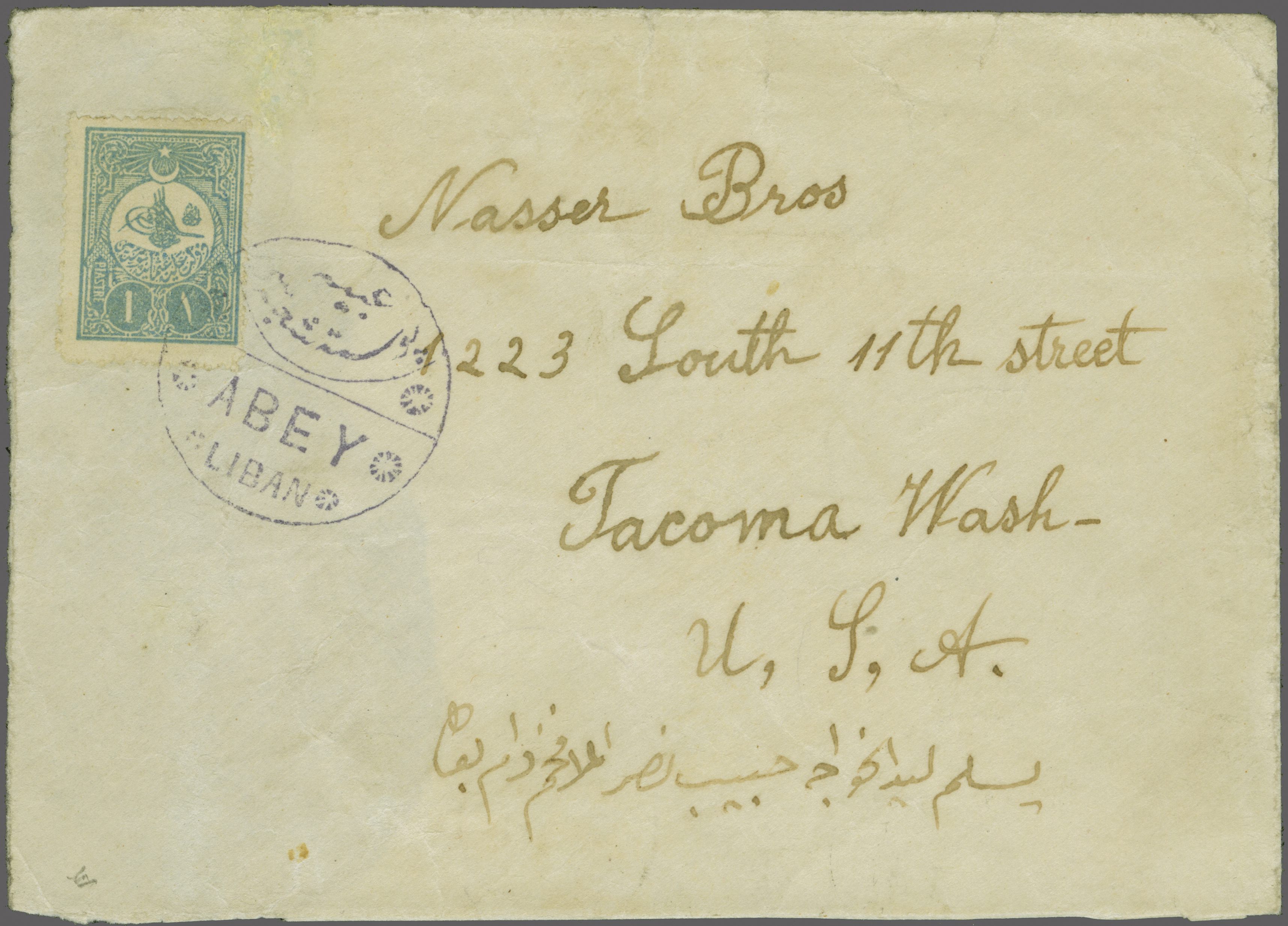 Sanjak of Djebel Lubnan - Abieh / Abiye / Abai 1908: Turkey 1 pi. blue used on 1909 cover from Abieh to Tacoma, Washington, USA tied by decorative bilingual "ABEY / LIBAN" circular handstamp in violet (Coles & Walker, Ziya