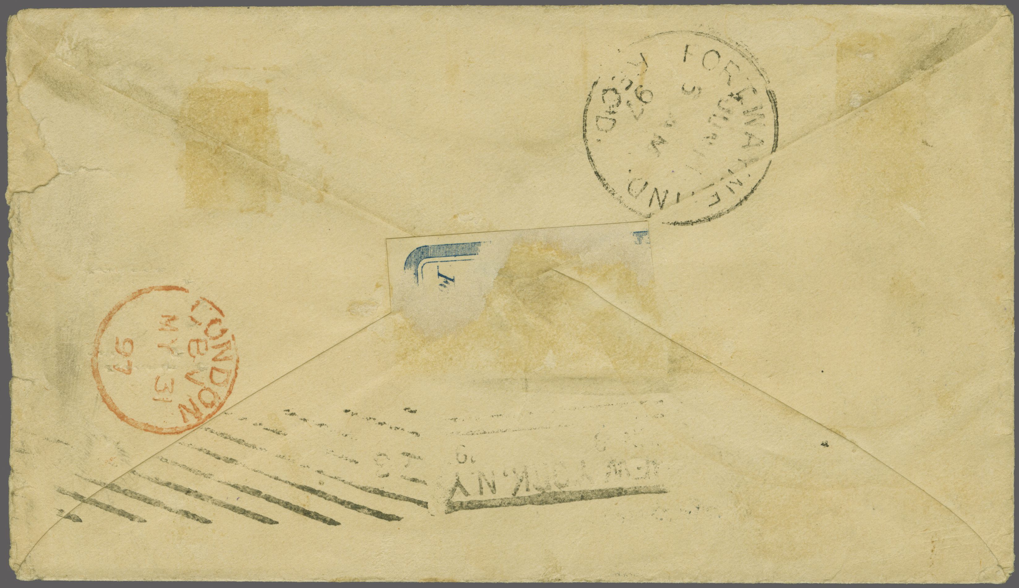 1312" negative seal handstamp (Ain es Salaam Village Postal Branch 1896) well struck in black (Coles & Walker fig. 80, Ziya fig. 1 - rated 'RRR'). Cover with slight trim at left, Baltimore arrival on reverse (Feb 6). Rare and most appealing