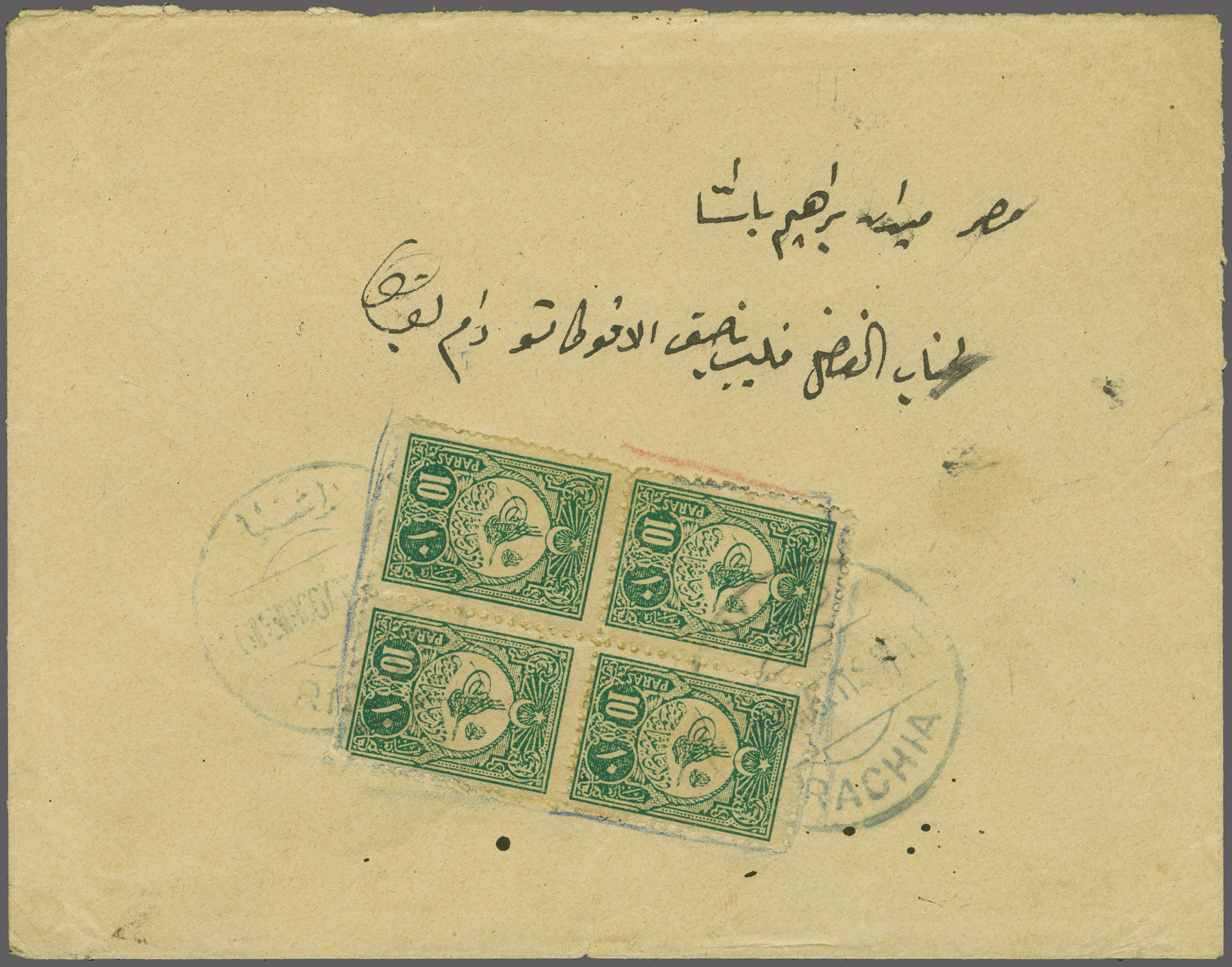 Vilayet of Syria - Racheya / Rachia / Raşeya 1908: Trukey 10 pa. blue-green in a block of four, used on 1909 cover to Cairo, Egypt tied by two strikes of bilingual "RACHIA" circular datestamps (March 6) in blue (Coles &