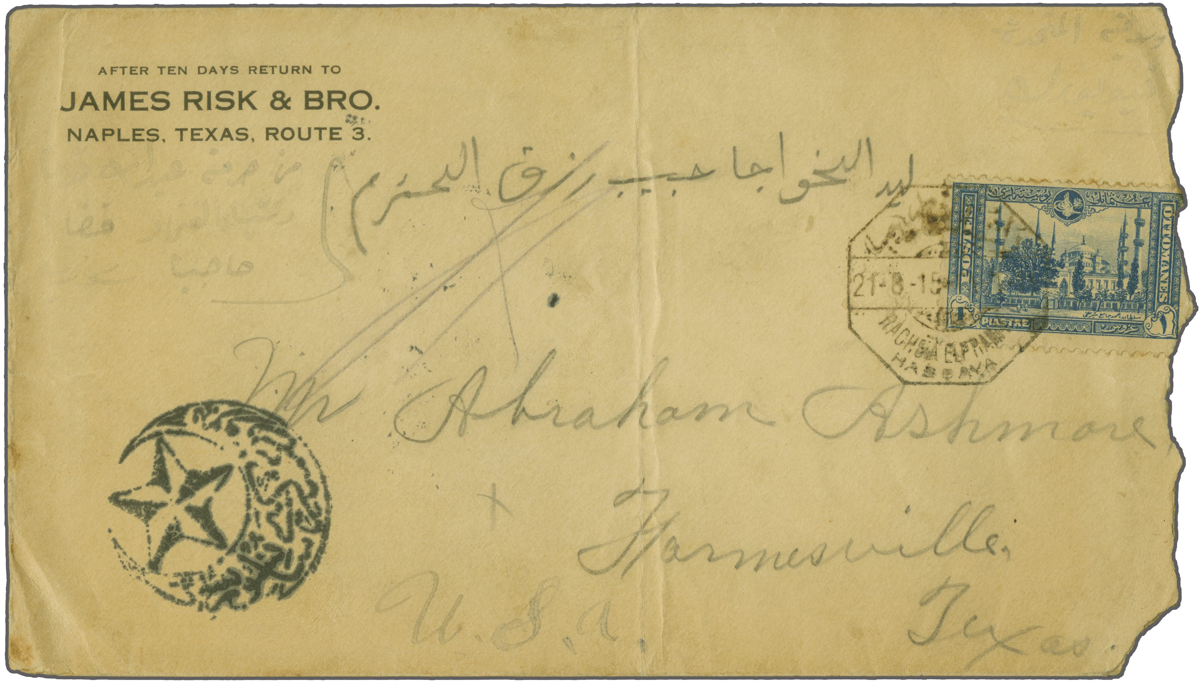 Vilayet of Syria - Racheya Elphahar Hasbaya / Raşeya Elfehar Hasbaya 1914: Turkey 1 pi. deep blue, s single example used on 1915 cover to Harmersville, Texas, USA tied by octagonal framed "RACHEIA ELPHAHAR / HASBYA" datestamp