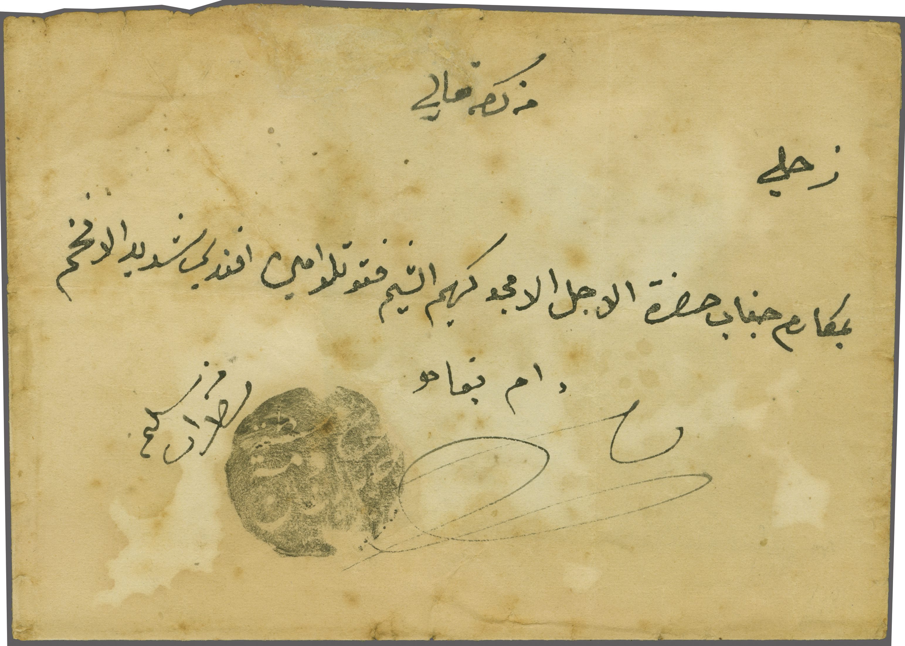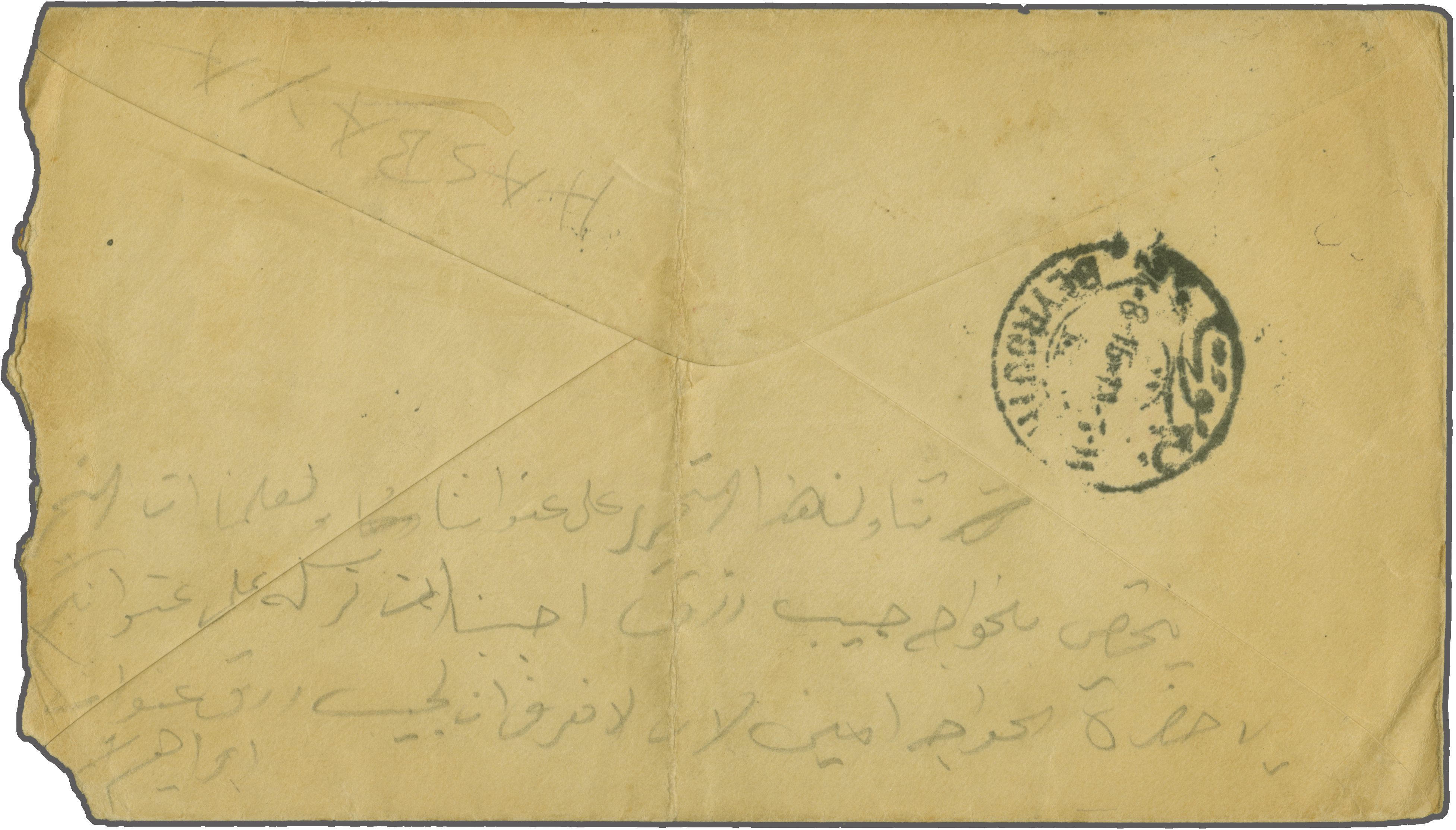 Post of the Government of Mount Lebanon / Mutasserifieh of Djebel Lubnan 1861/62: Front and part back of cover to Zahle struck with "HUKUMATI POSTA CEBEL-I LUBNAN" negative seal handstamp (Post of the Governate of Mount