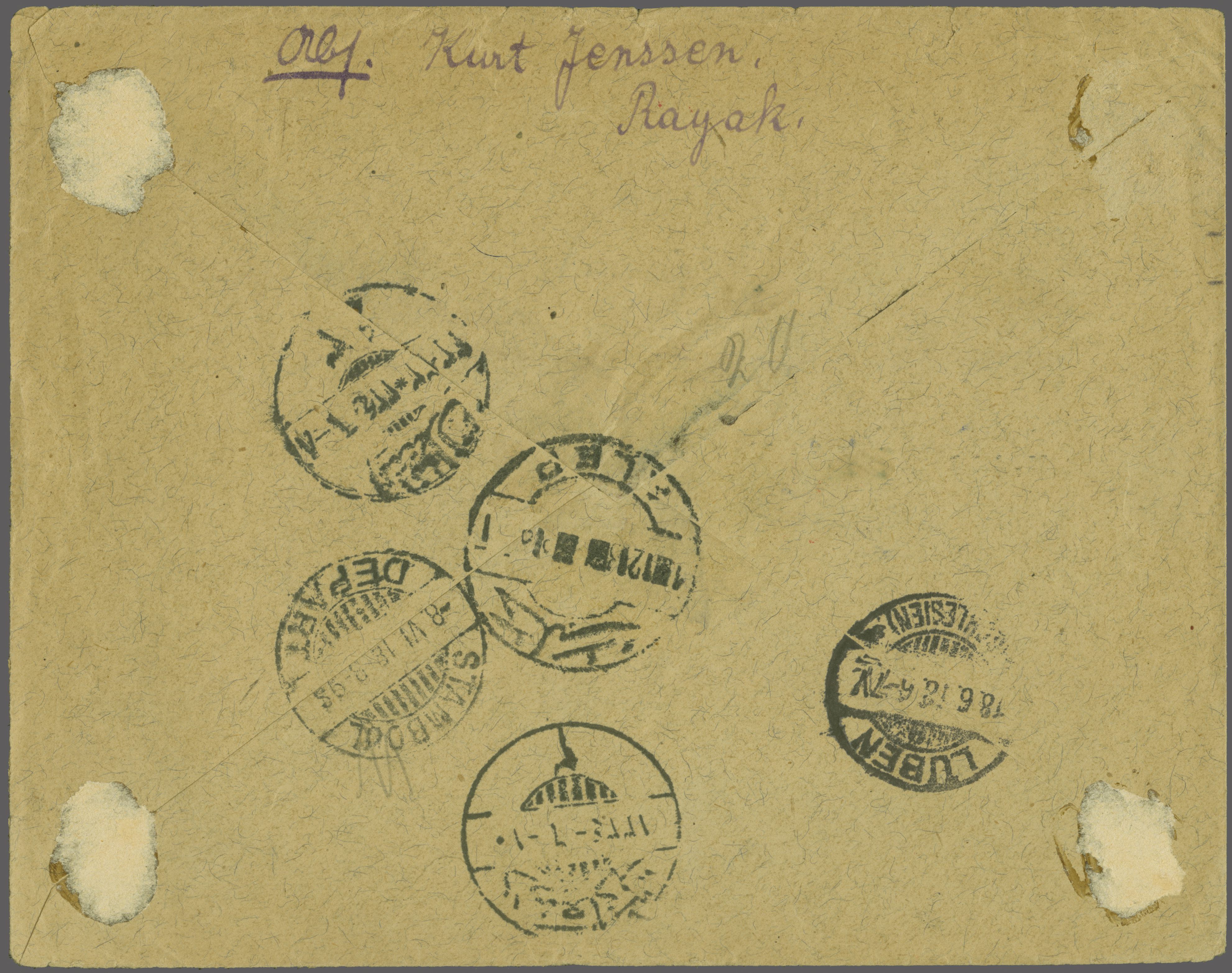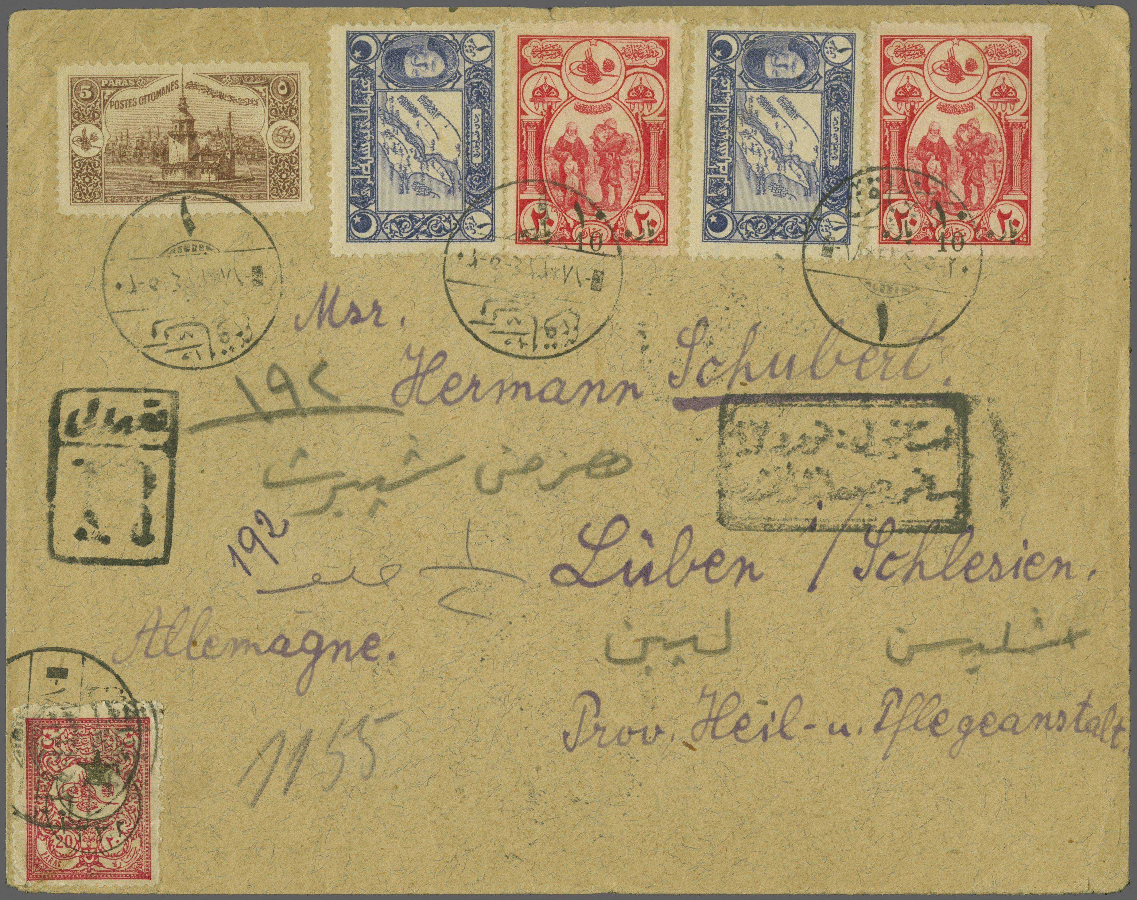 Vilayet of Syria - Rayak / Riyaq 19141914 5 pa. brown, 1915 20 pa. red, 1917 10 pa. on 20 pa. rose (2) and 1917/18 1 pi. blue-violet all tied to 1918 registered cover to Luben, Germany by all Arabic "RAYAK / 1" datestamps (May