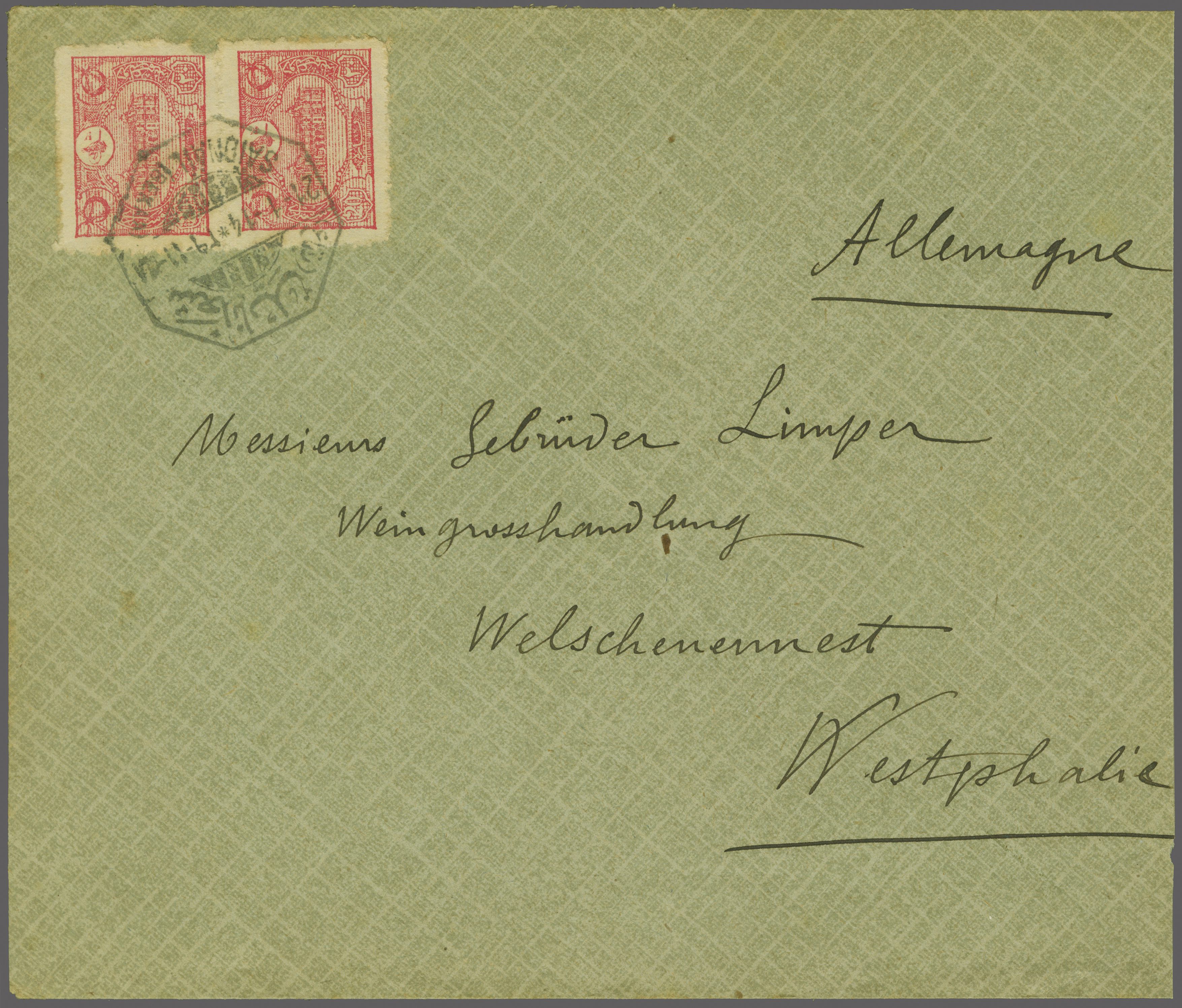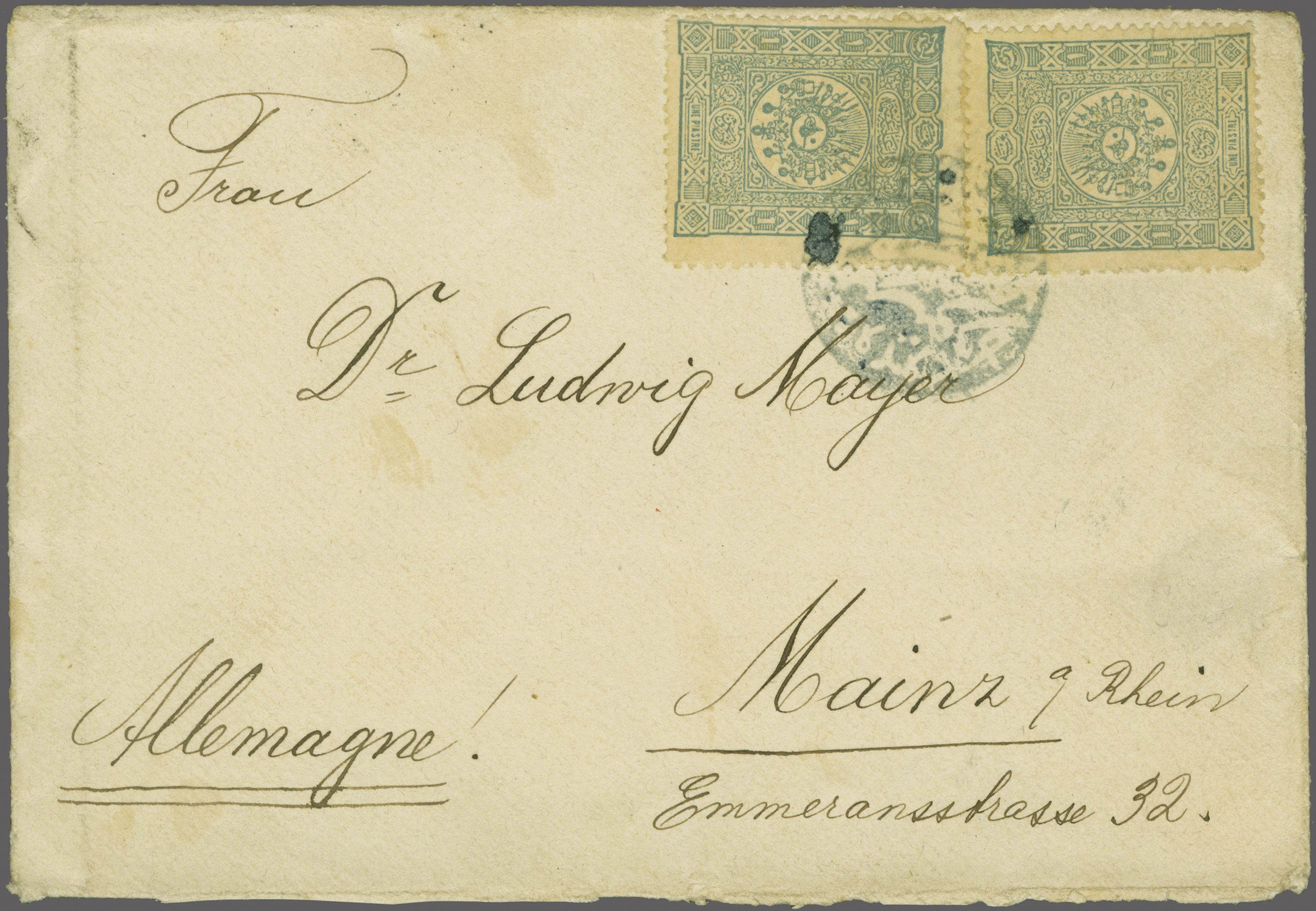 Vilayet of Syria - Chtaura / Shtora / Ashtura 1892: Turkey 1 pi. grey-blue, two examples used on 1893 double weight cover from Chtaura, Bekaa to Mainz, Germany tied by circular "SHTORA POSTA SUBESI" negative seal handstamp