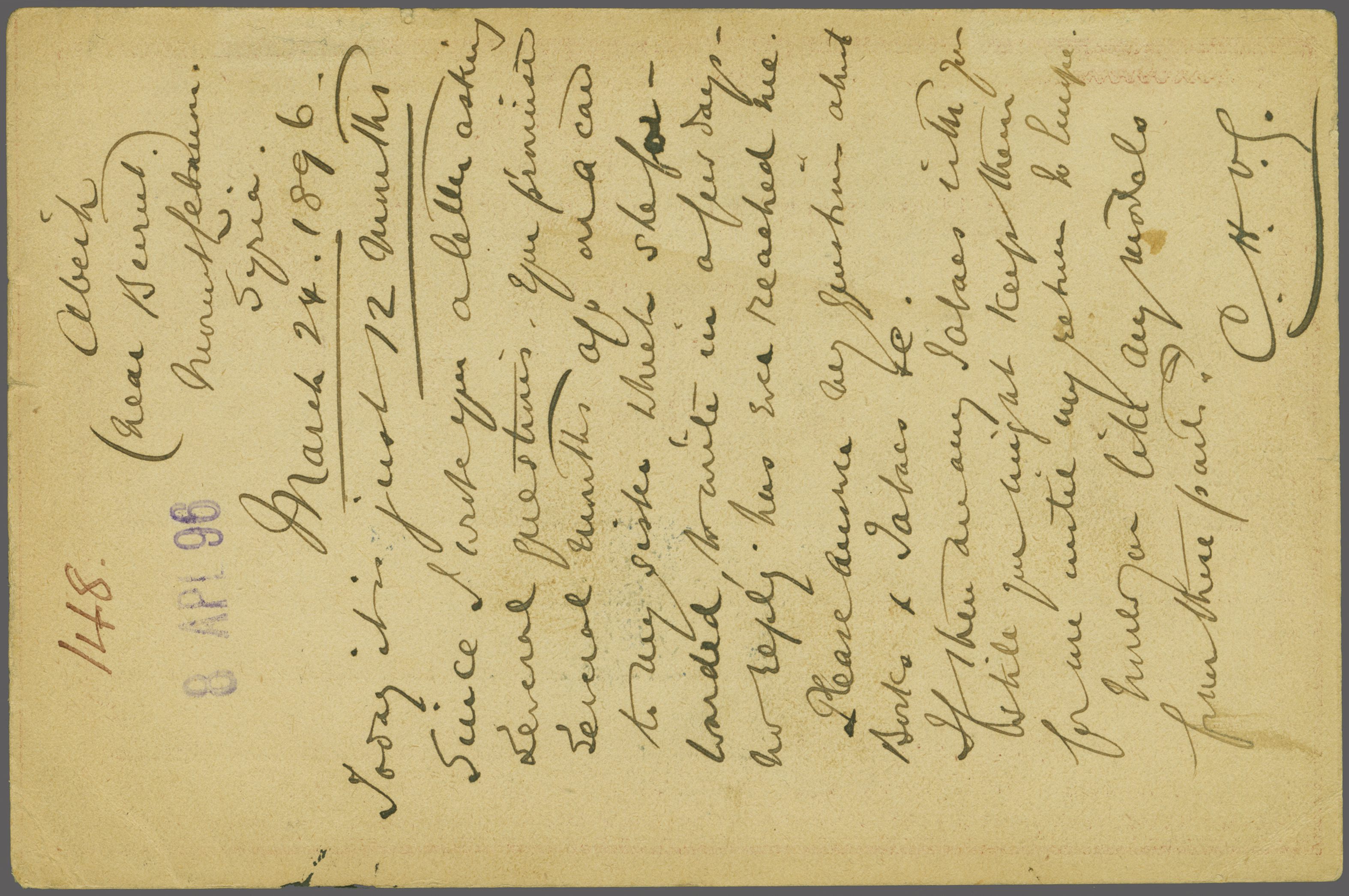 Sanjak of Djebel Lubnan - Abieh / Abiye / Abai 1892: turkey 20 pa. claret postal stationery card sent on 24 March 1896 from Abieh to London, struck with superb strike of circular "ABIEH POSTA SUBESI" negative handstamp (Abieh