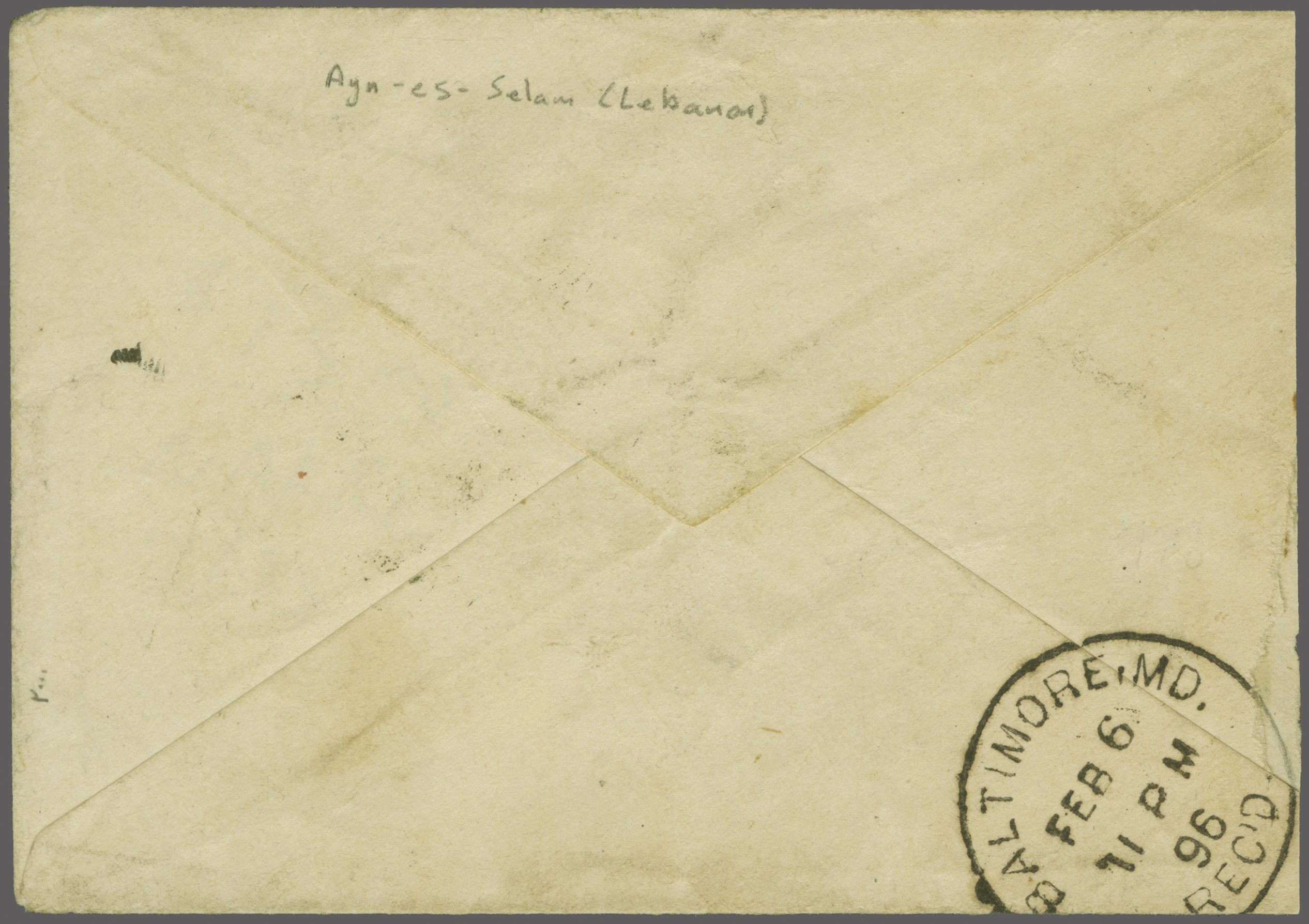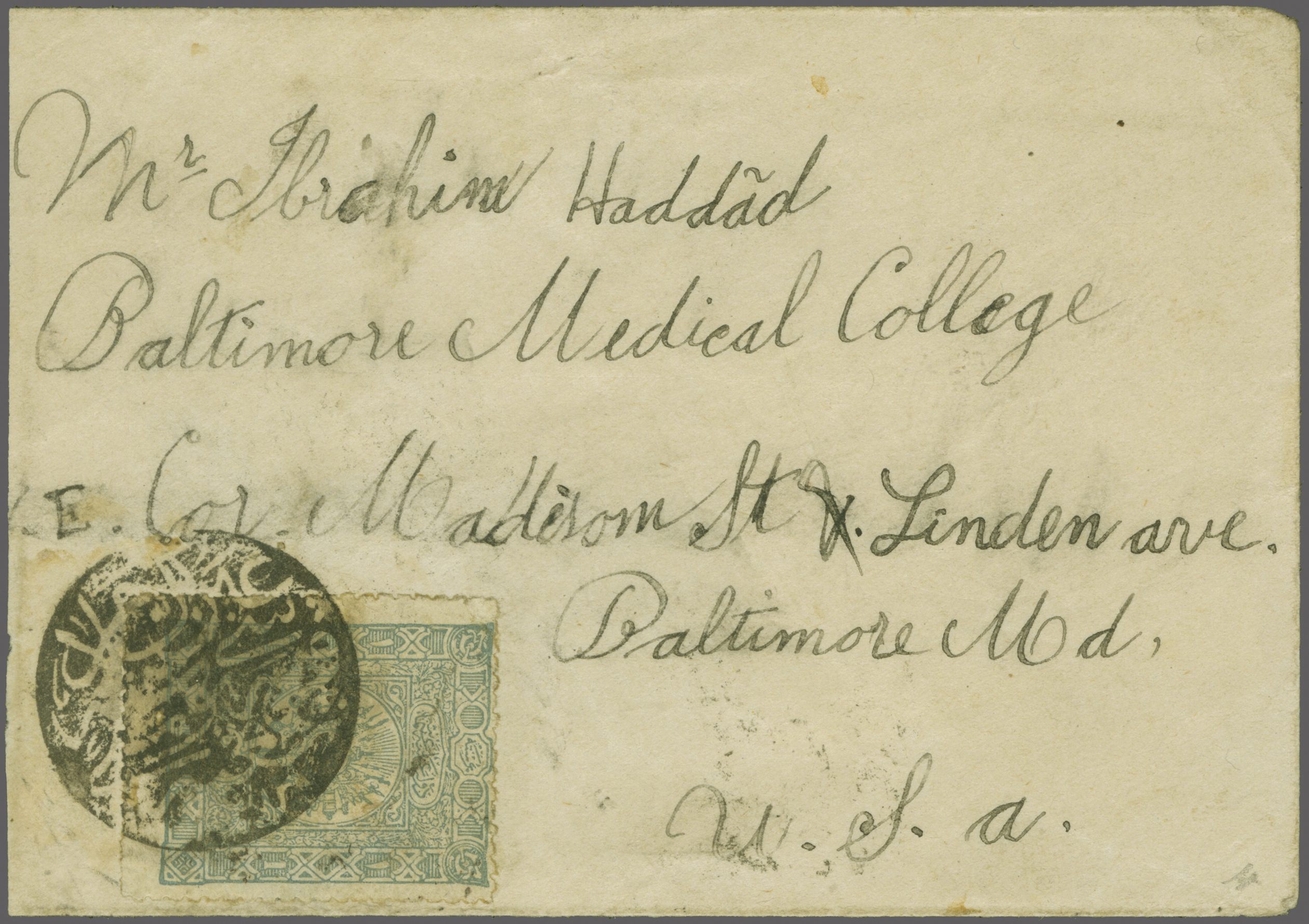 Sanjak of Djebel Lubnan - Ain es Salaam / Ayn Elsalaam 1892: Turkey 1 pi. grey-blue, a single example used on 1896 cover from Ain es Salaam to Baltimore, Maryland, USA tied by circular "AIN ES SALAAM KARIYESI POSTA SHUBESI -