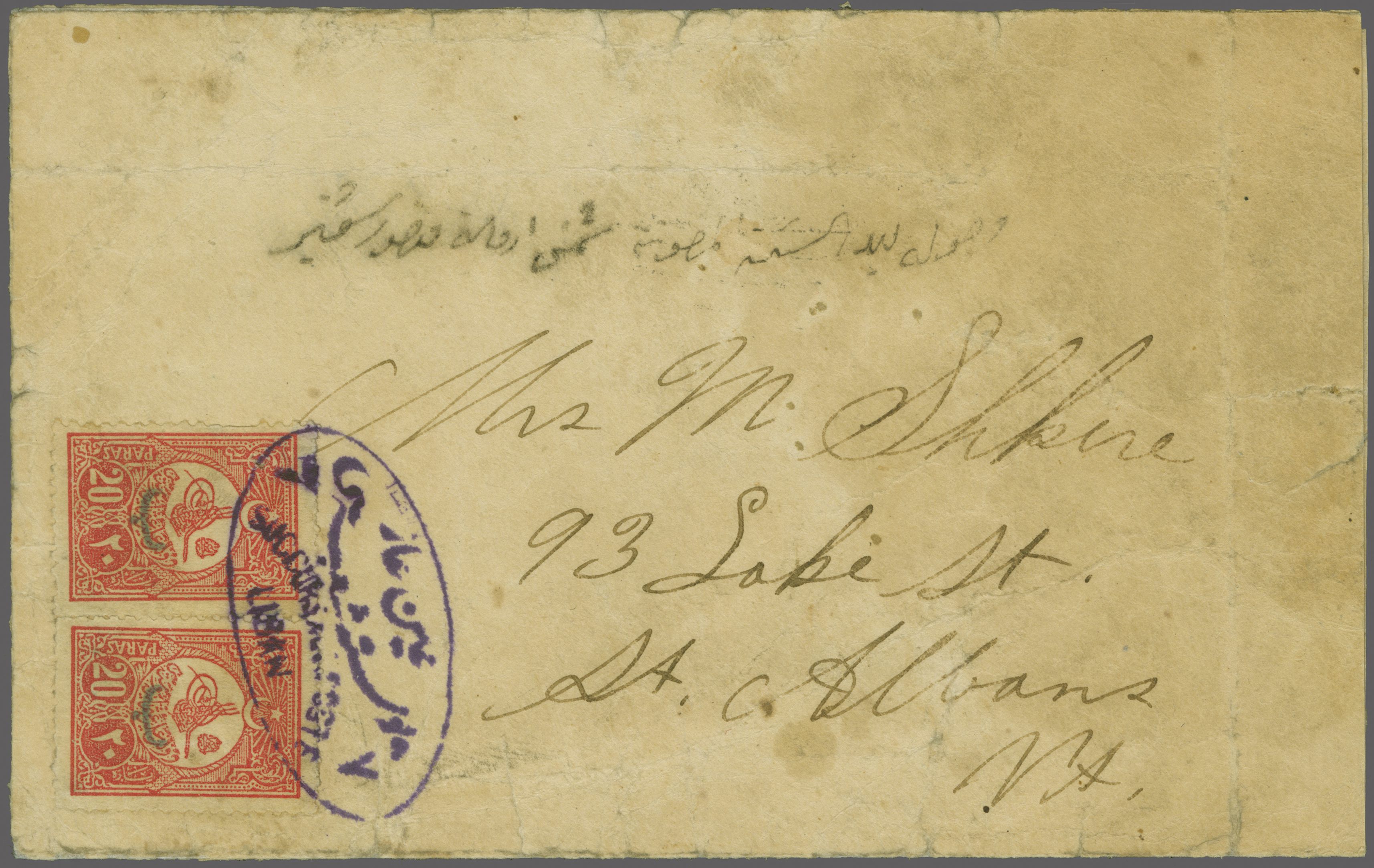 Sanjak of Djebel Lubnan - Ain Aar / Ayn Aar 1908: Turkey 20 pa. rose pair used on 1909 cover from ain Aar to St. Albans, Vermont, USA tied by bold strike of oval framed "7 - AIN AAR SUCCURSALE POSTE LIBAN - V" handstamp in