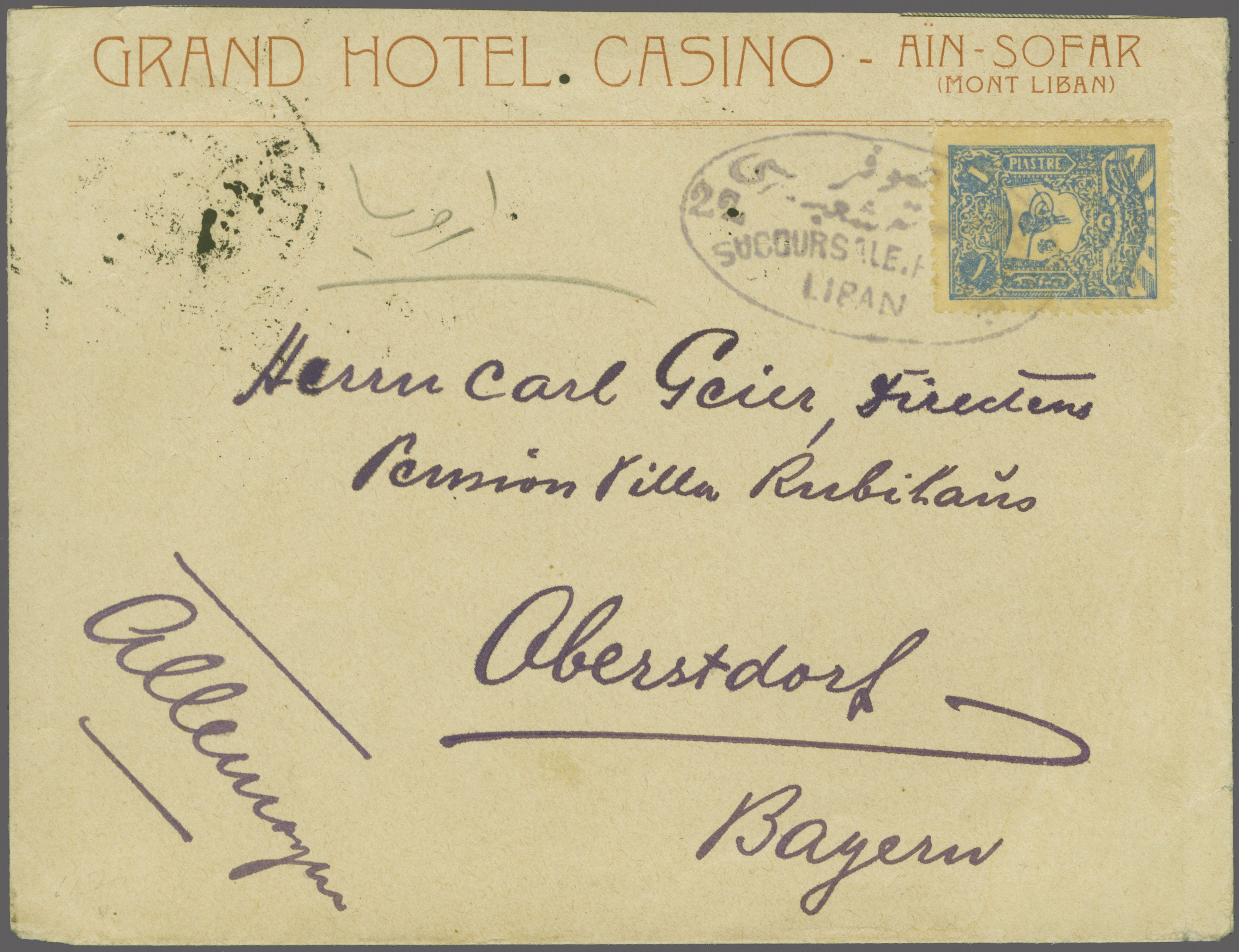 Sanjak of Djebel Lubnan - Ain Sofar / Sofer 1905: Turkey 1 pi. blue, a used example on 1906 printed cover for the Grand Hotel Casino, Ain Sofar to Oberstdorf, Bavaria tied by bold strike of oval framed "22 - AIN AAR SUCCURSALE