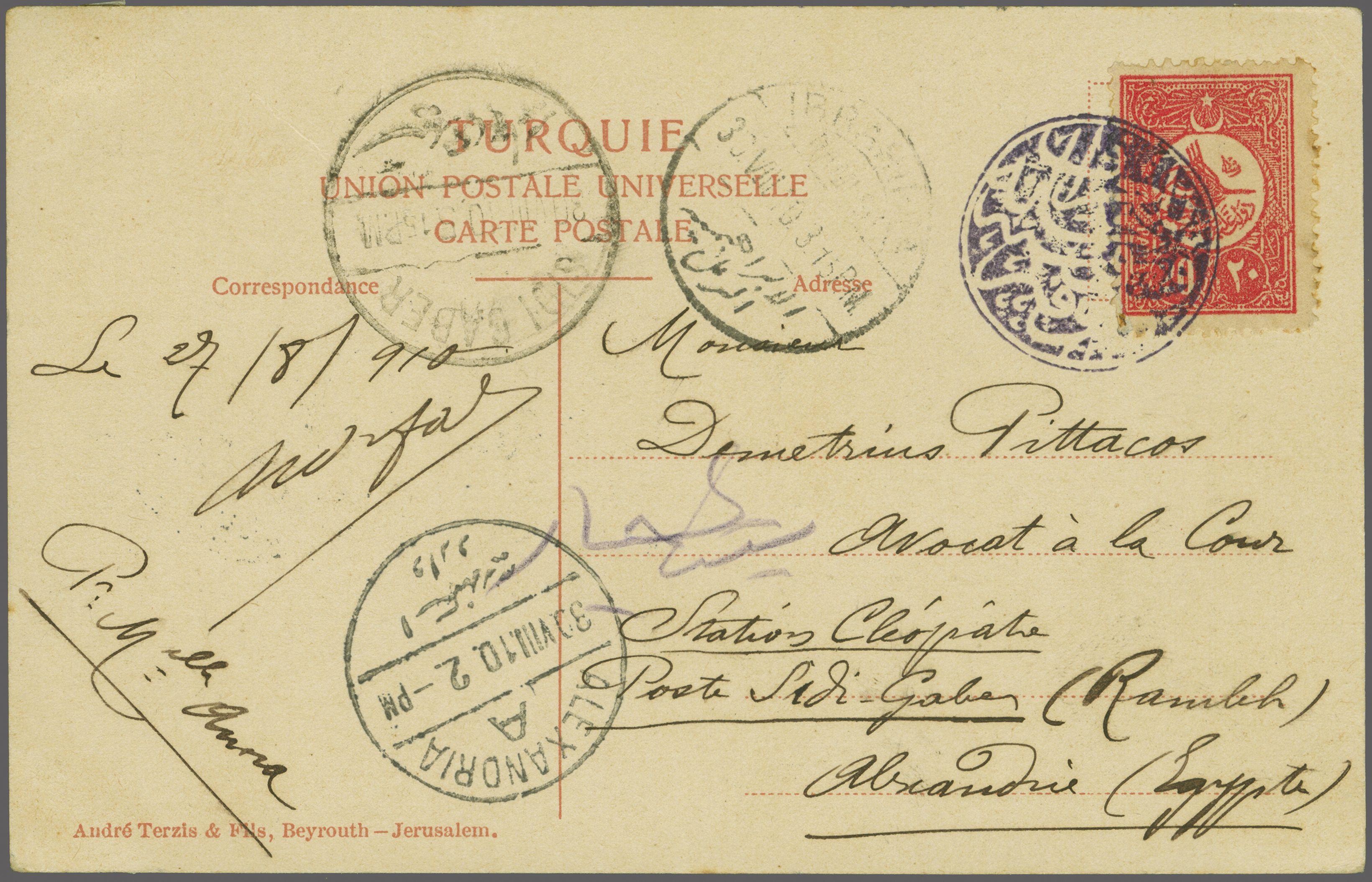 fig. 118, Ziya fig. 1 - rated 'RR') with transit cds's of Alexandria (Aug 30), Ramleh and Sidi Gaber arrival cds in black alongside. Slight perf. tones but a fine strike on an attractive card. Note: This card is illustrated in the Ziya catalogue 'S'