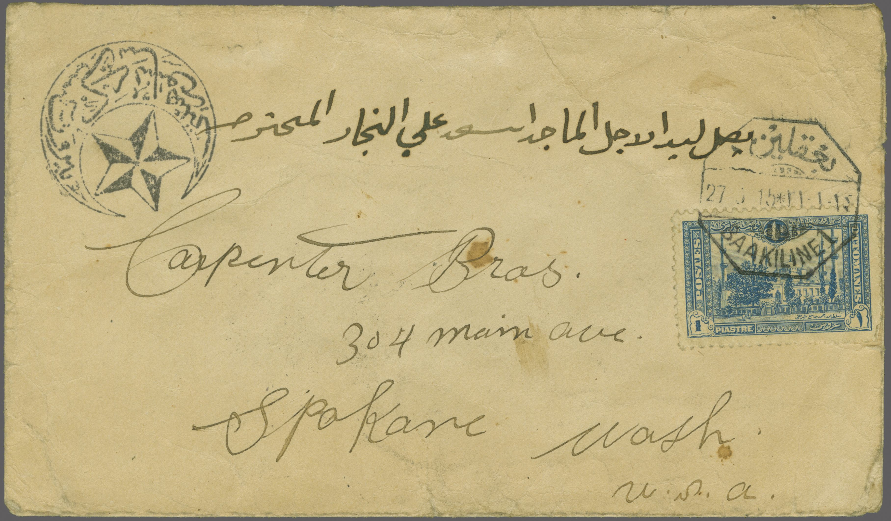 Sanjak of Djebel Lubnan - Baakiline / Baaklin 1914: Turkey 1pi. deep blue, a used example on 1915 cover to Spokane, Washington, USA tied by bilingual octagonal "BAAKALINE / 1" datestamp (March 27) in black (Coles & Walker