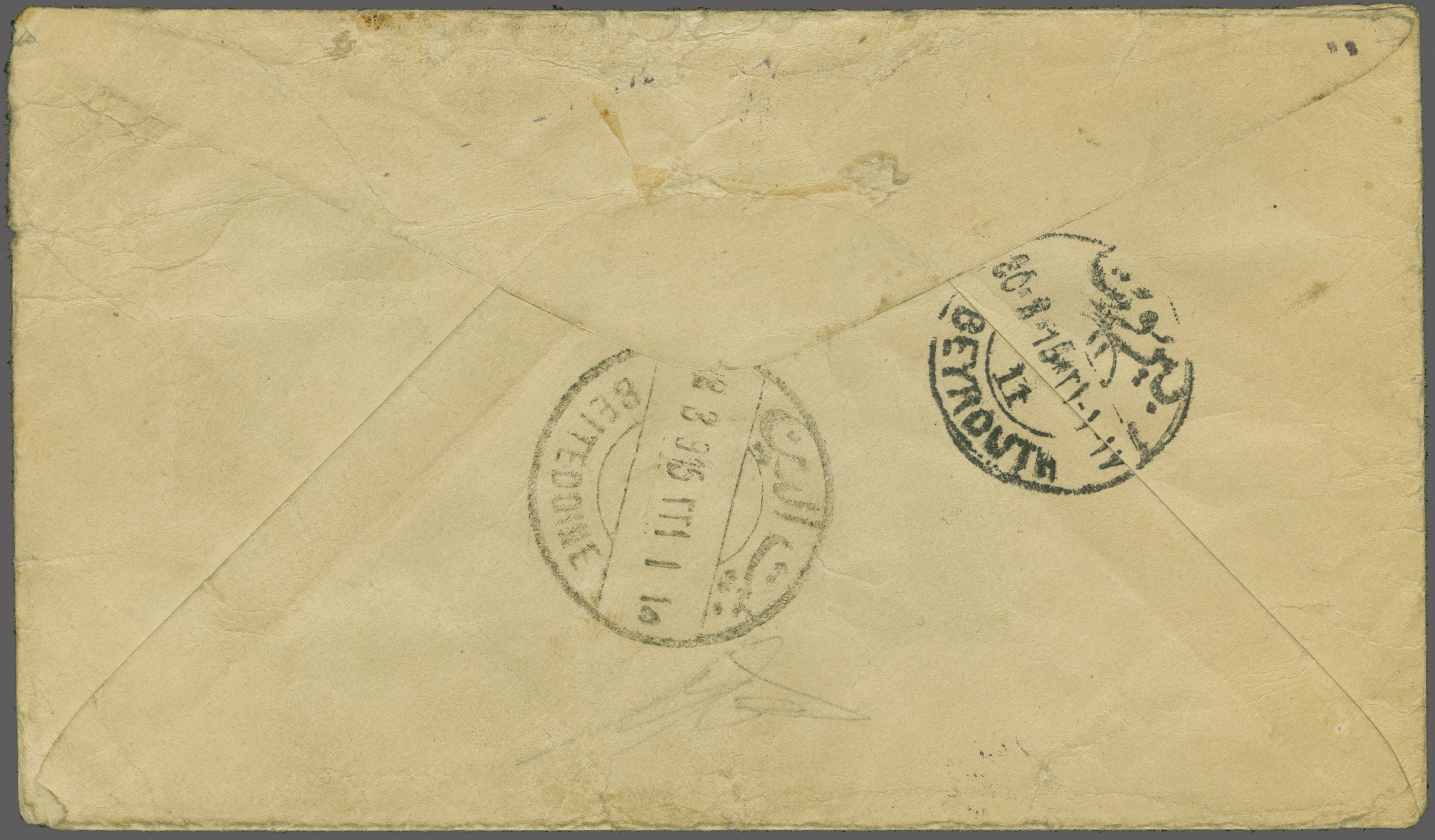 unlisted, Ziya fig. 3 - rated 'RR'). Star and Crescent Beirut Censor handstamp at left in black and reverse with "Beitedoine" cds and "Beyrouth / 11" transits. Cover with wrinkles and slight soiling but scarce. Note: This cover is illustrated in the