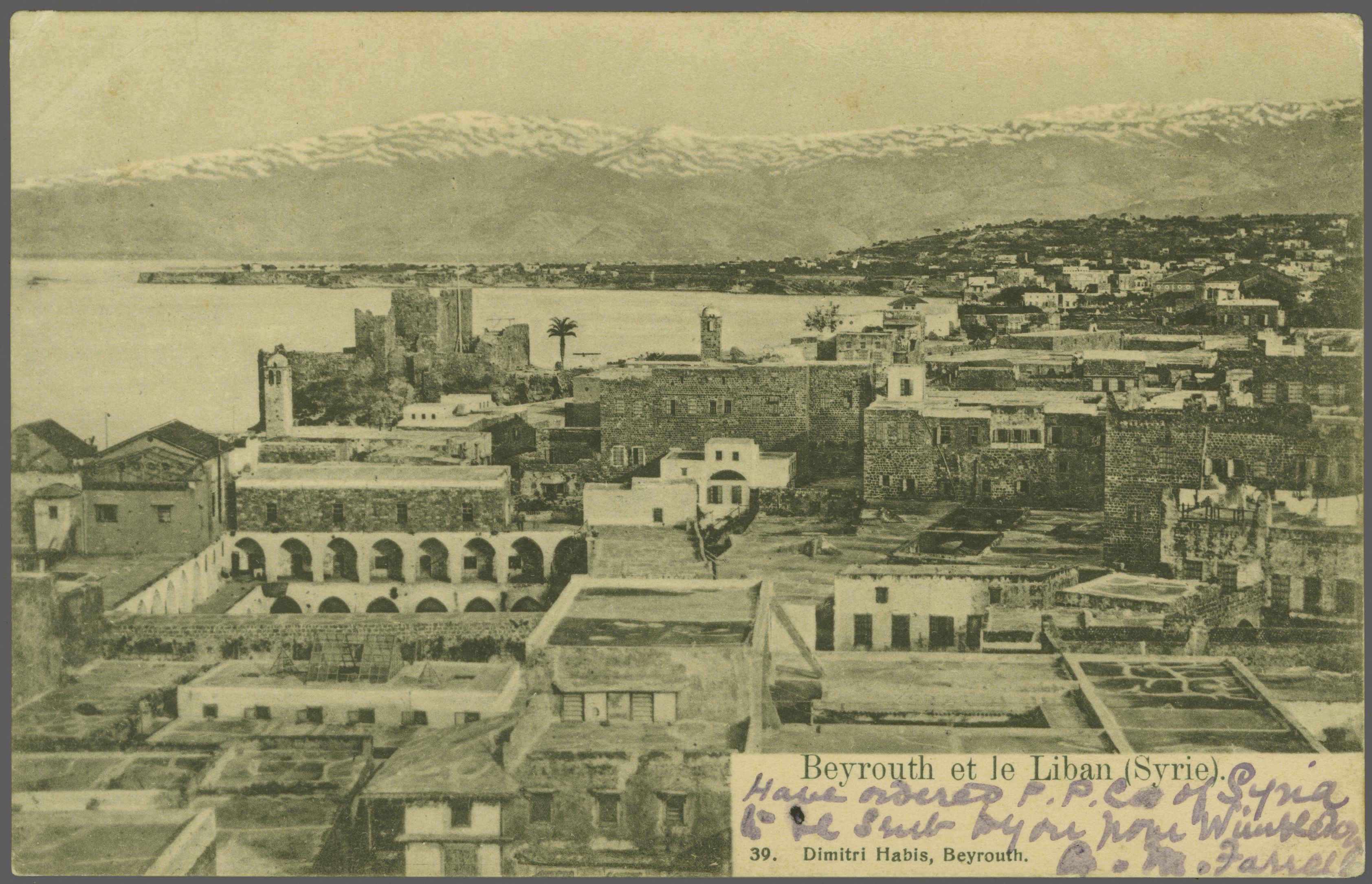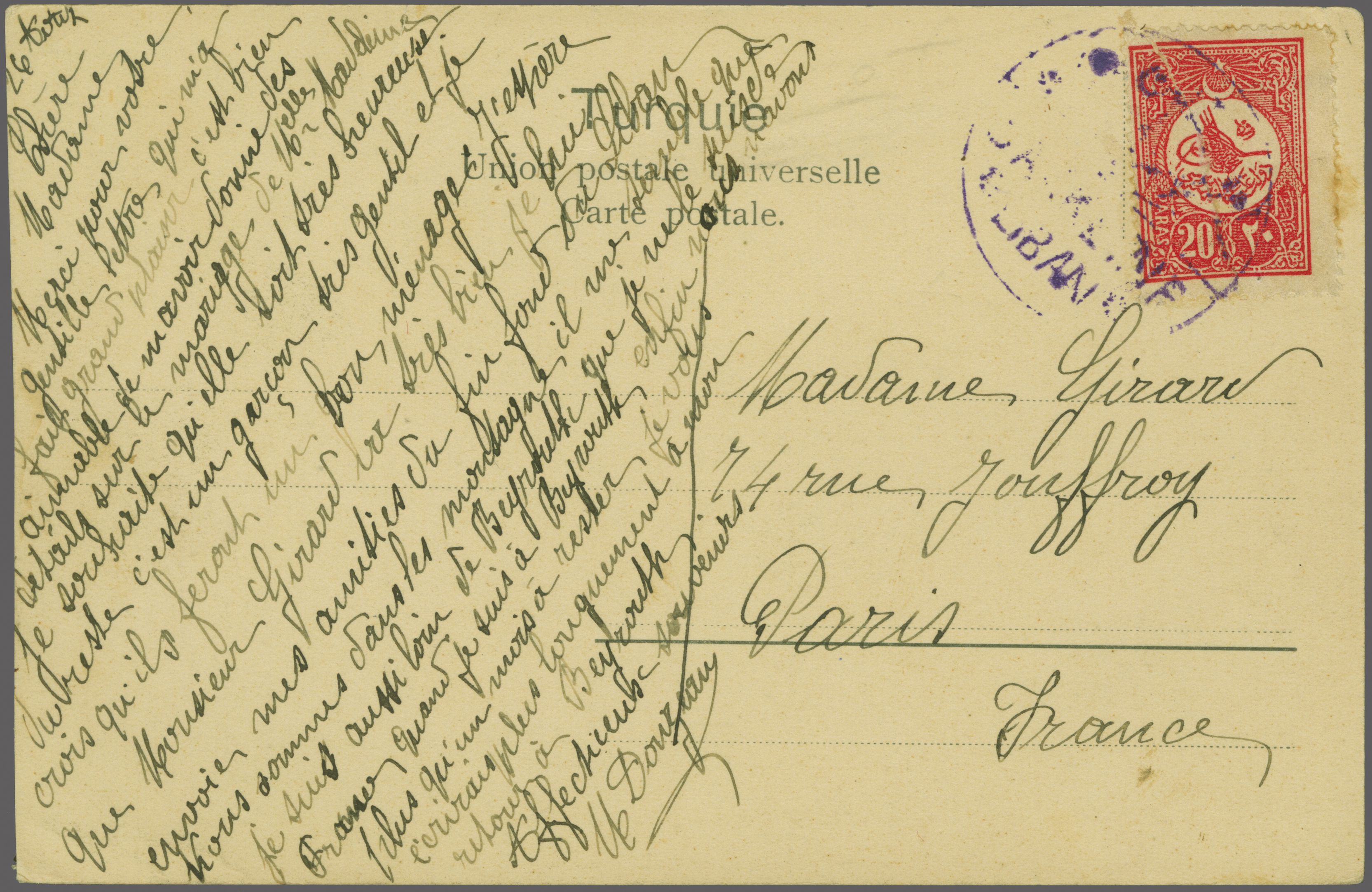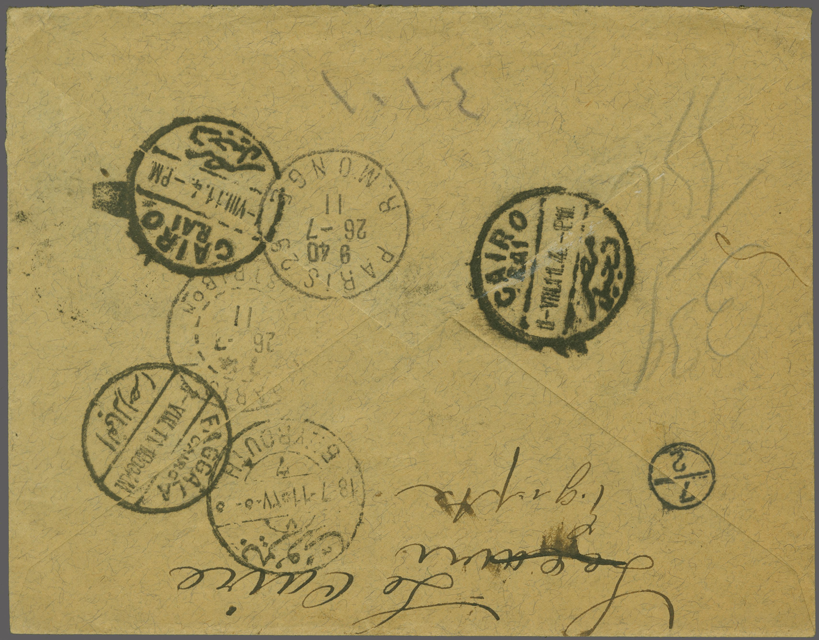 (BEYROUTH)" datestamp (July 17) in black (Coles & Walker fig. 68, Ziya fig. 2 rated 'R'). Reverse with Beyrouth-7, Paris (July 27), Cairo and Faggala cds's (Image 1)
