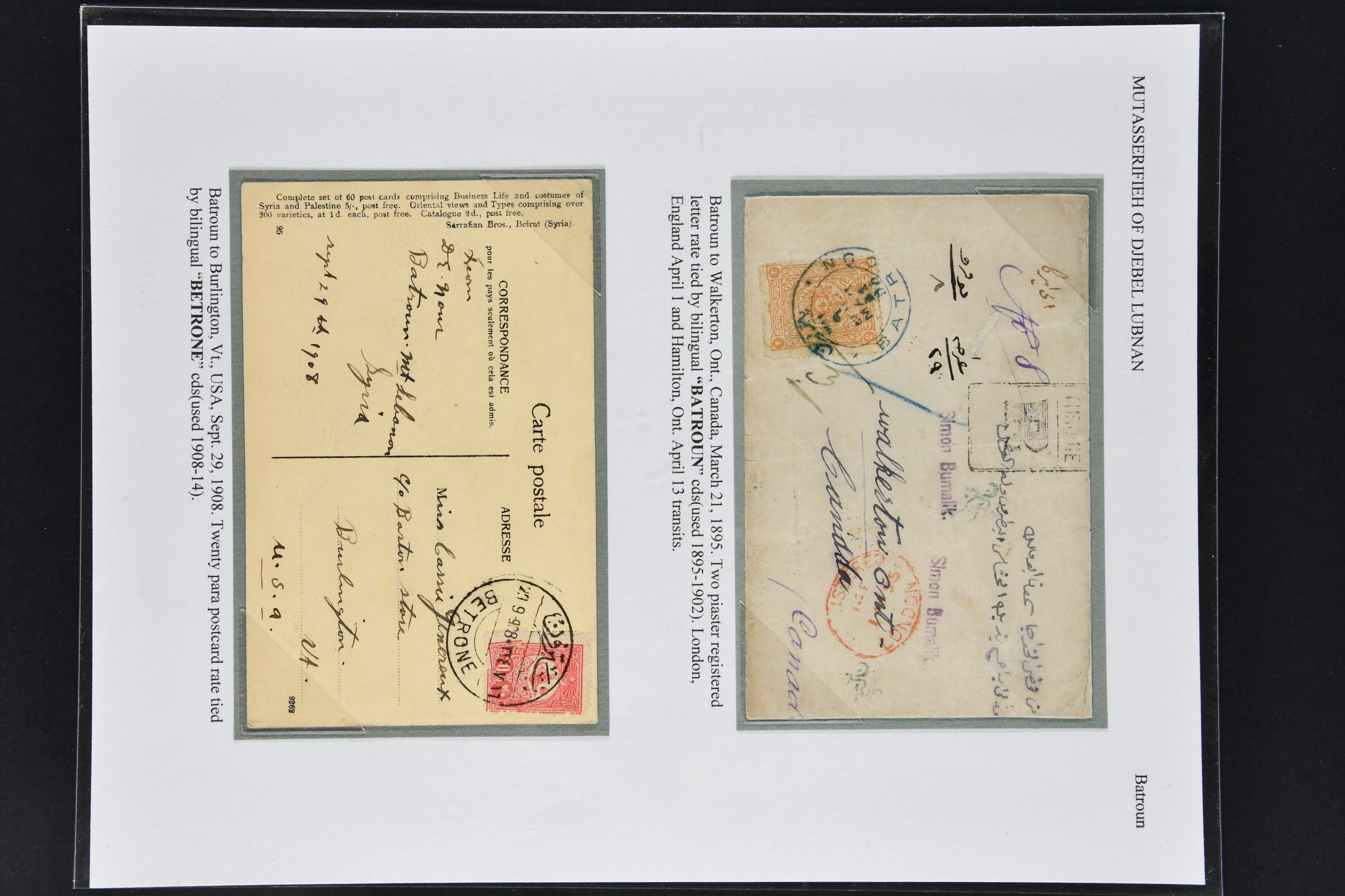 Sanjak of Djebel Lubnan - Batroun / Betrone 1895/1908: Cover and card with 1895 cover bearing 1892 2 pi. orange-brown for registered rate to Canada, tied by bold bilingual "BATROUN" circular datestamp (March 21)