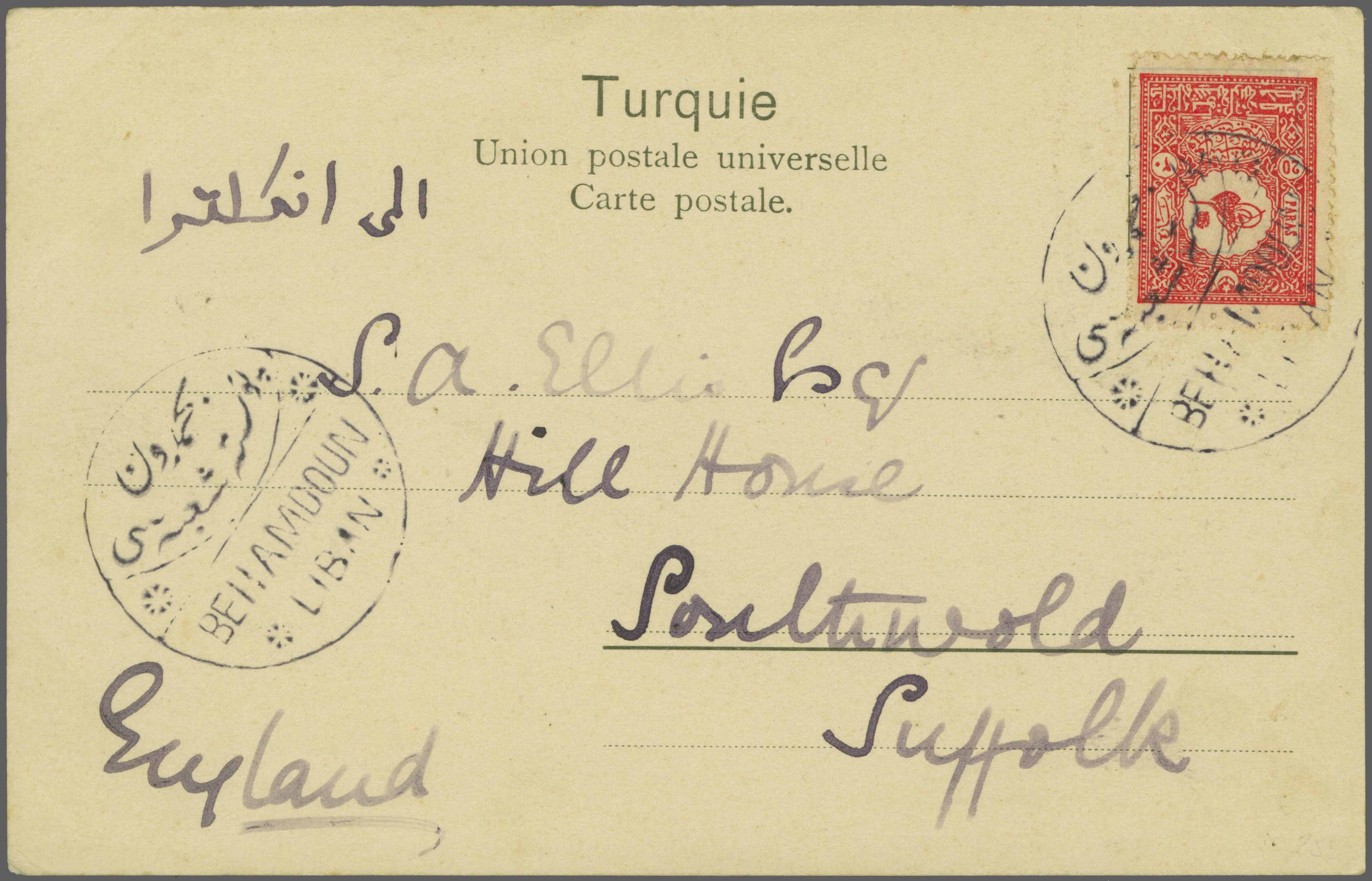 Sanjak of Djebel Lubnan - Behamdoun / Bhamdun 1901: Turkey 20 pa. rose-red used on postcard to Southwold, England tied by decorative circular "BEHAMDOUN POSTA SHUBESI / BEHAMDOUN LIBAN" handstamp in bluish-violet ink (Coles