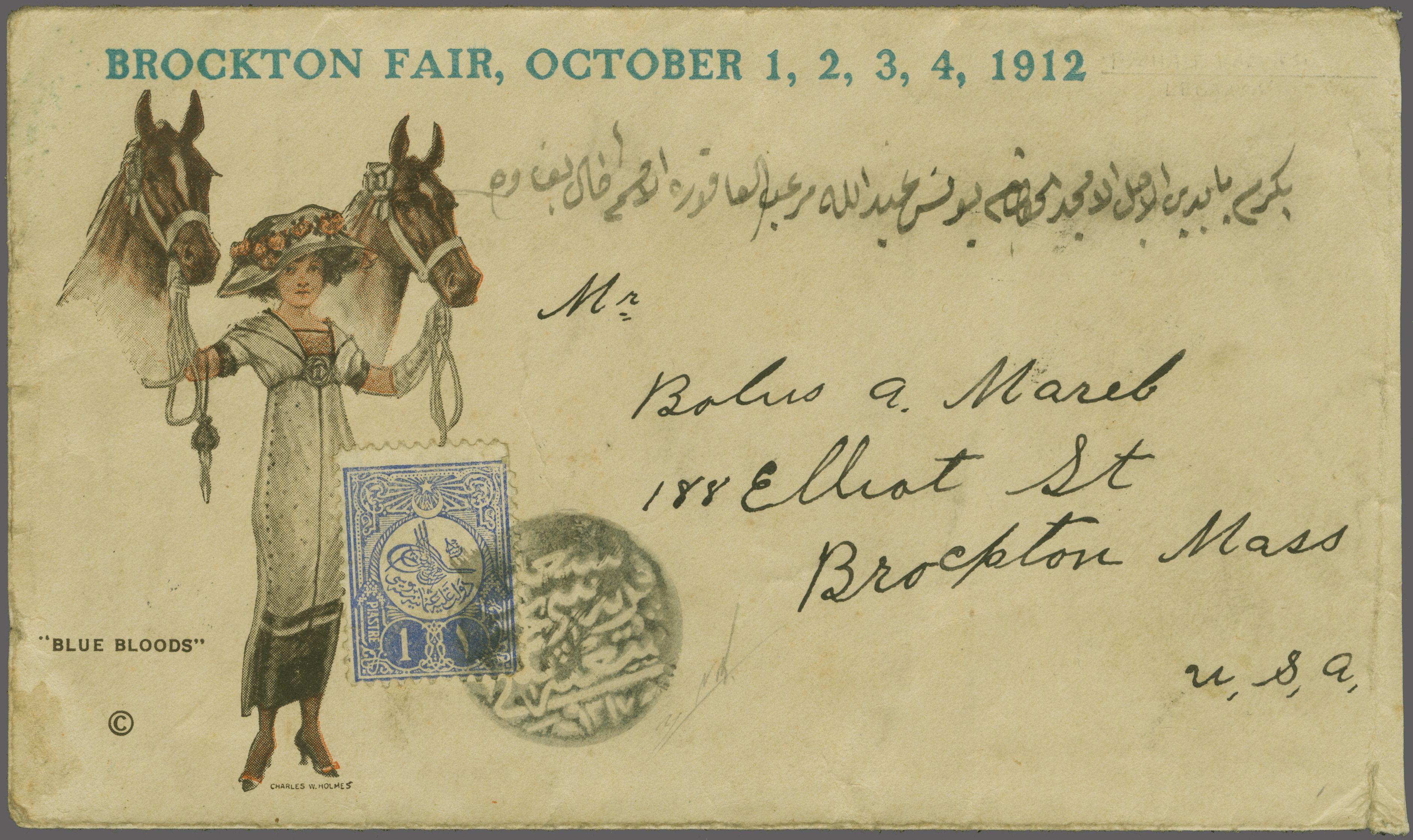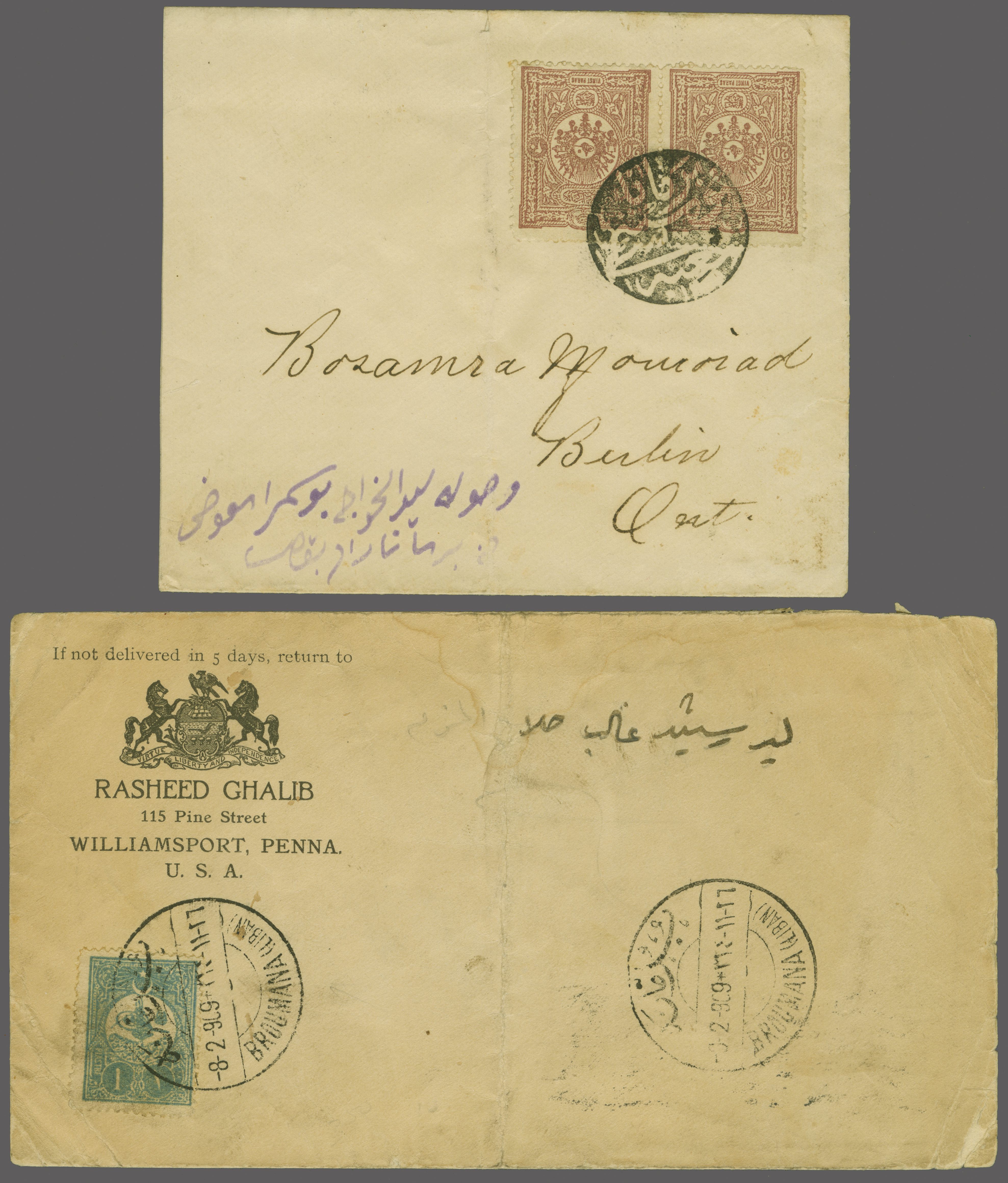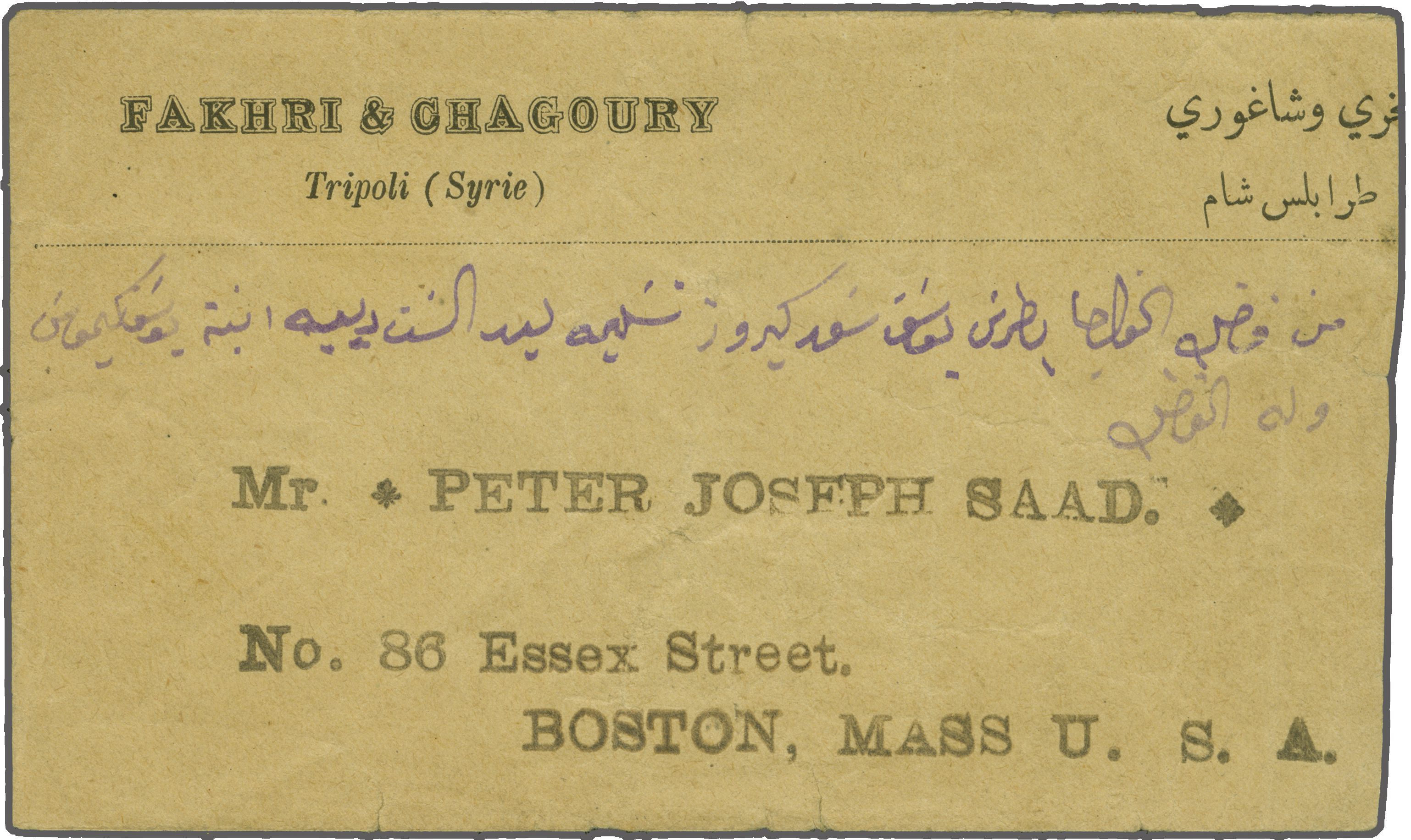 Sanjak of Djebel Lubnan - Bashali / Beşale 1909: Turkey 1 pi. blue, a single example used on illustrated advertising envelope mailed back to Brockton, Mass, USA tied by circular "BASHALI KARIYESI POSAT SHUBESI - 1317" negative
